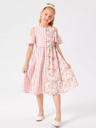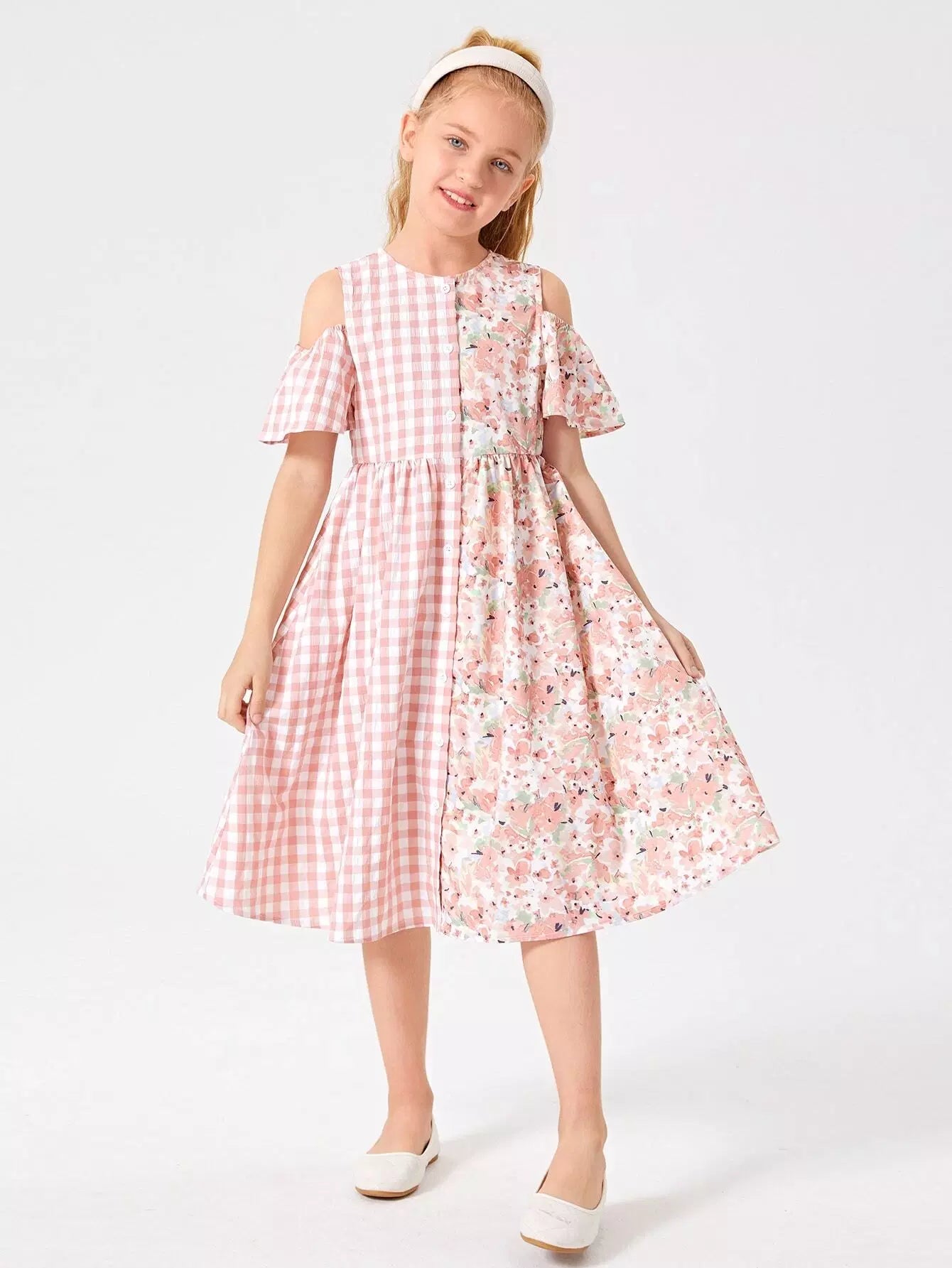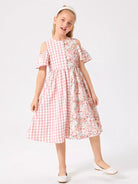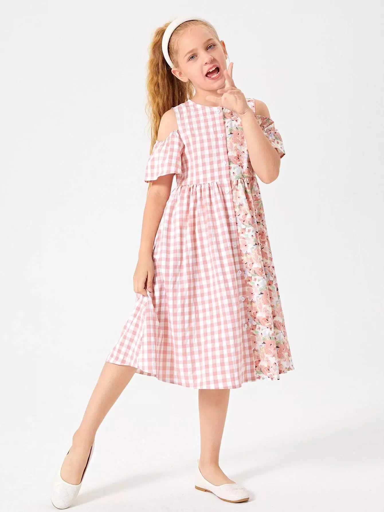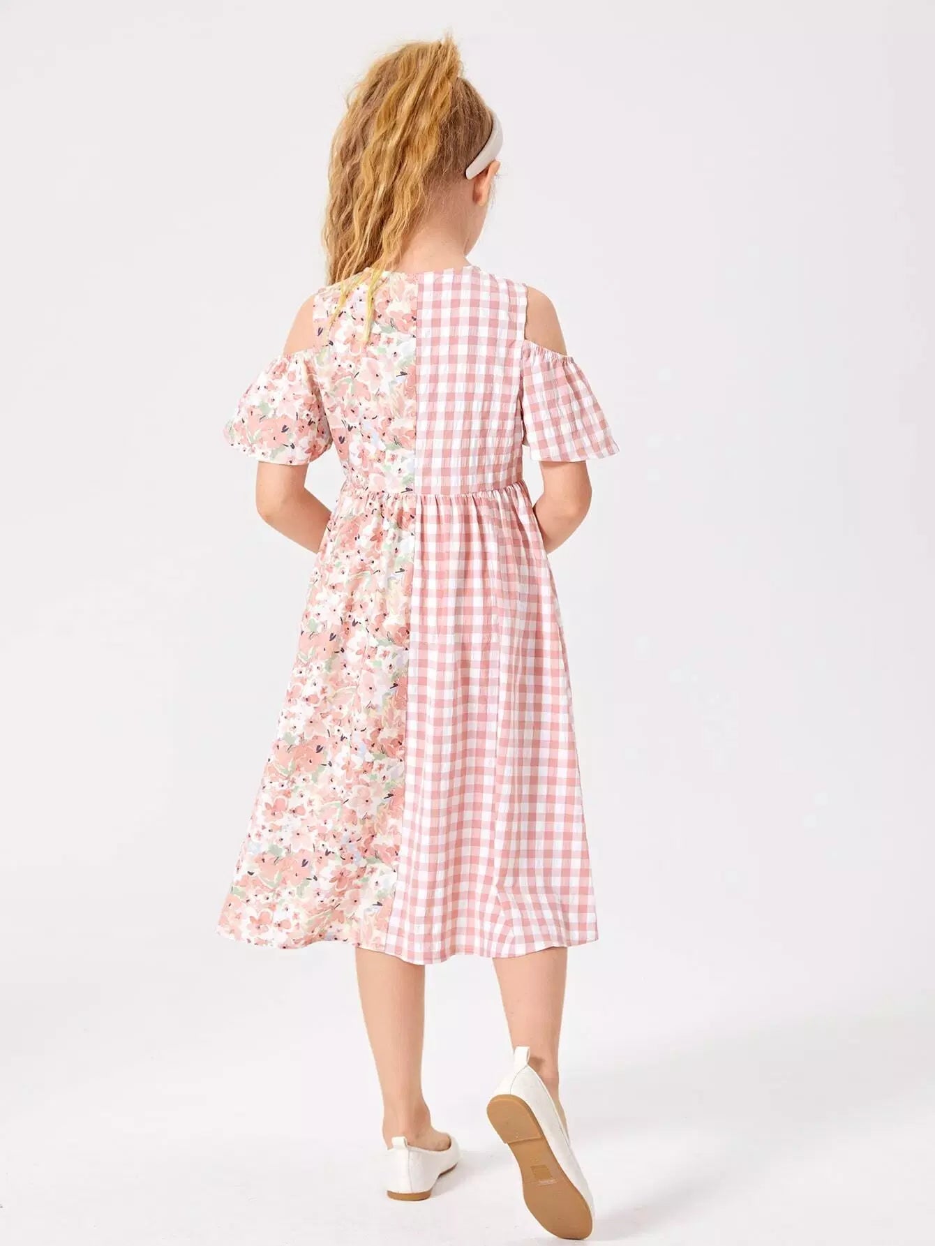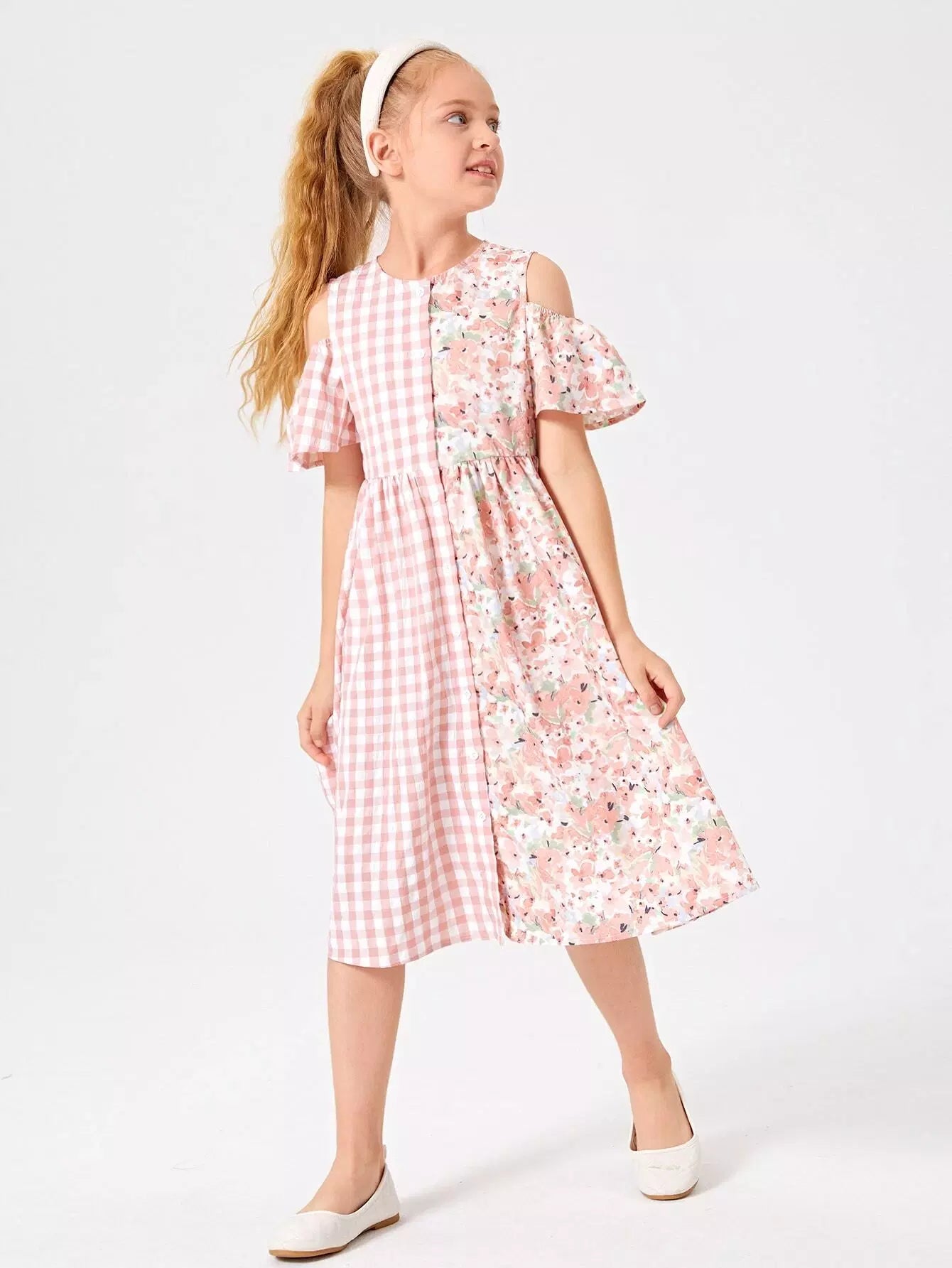 فستان بناتي مفتوح الكتفين بنقشة مربعات زهرية