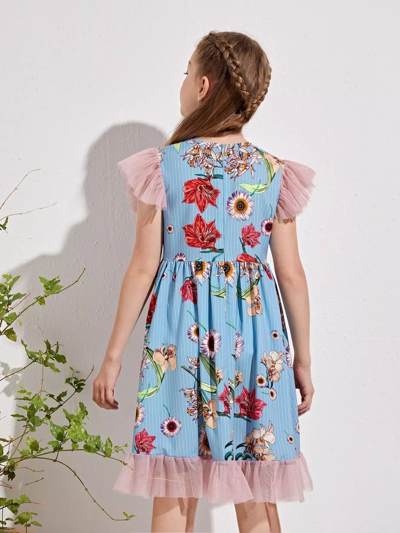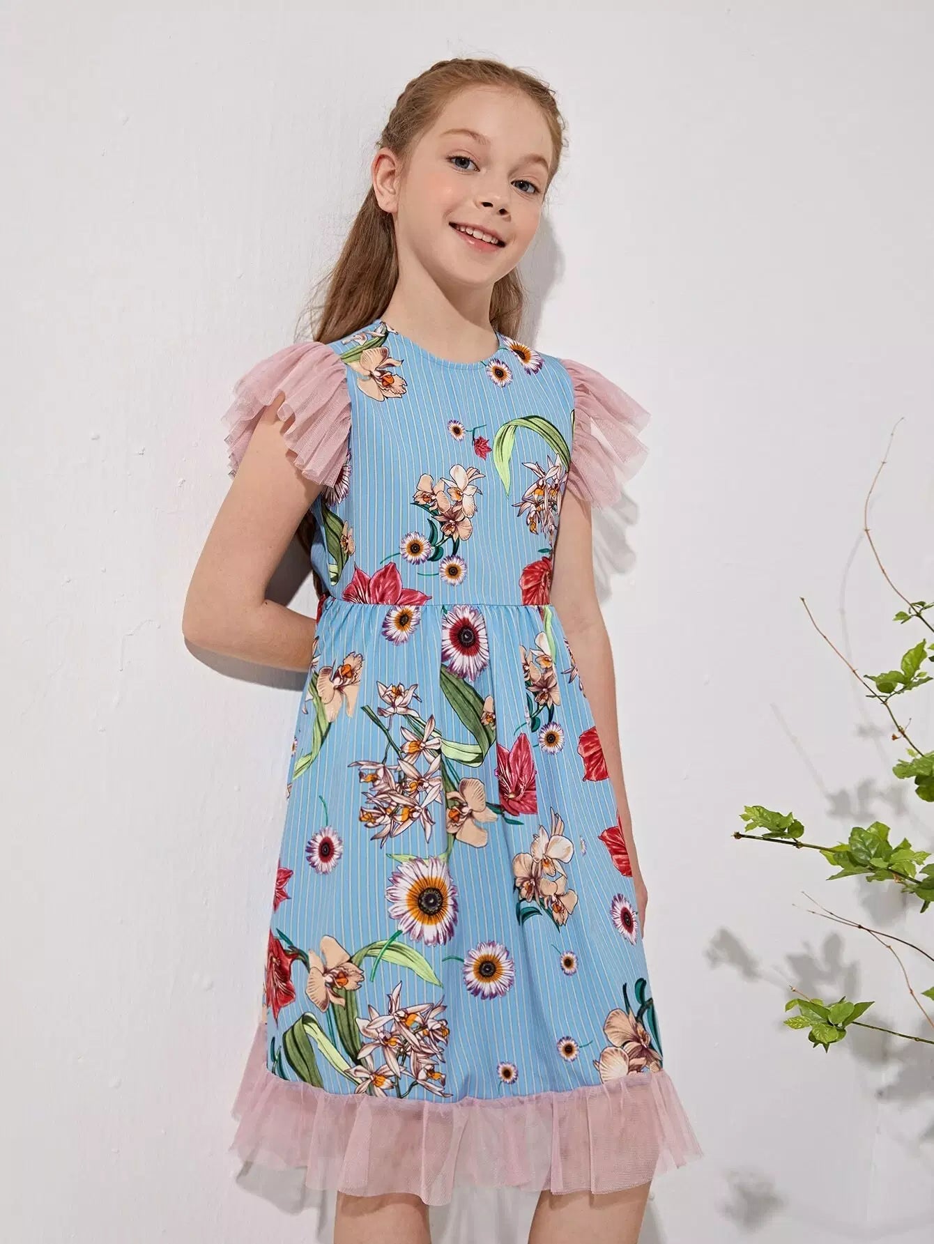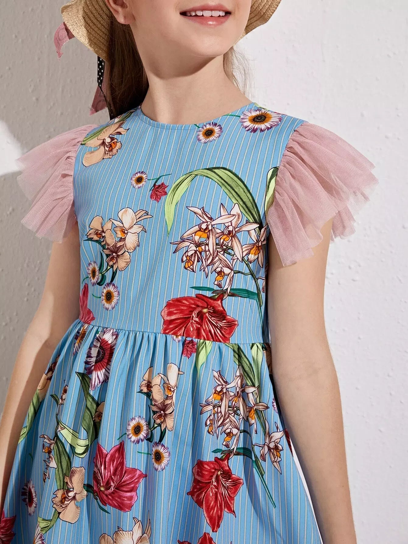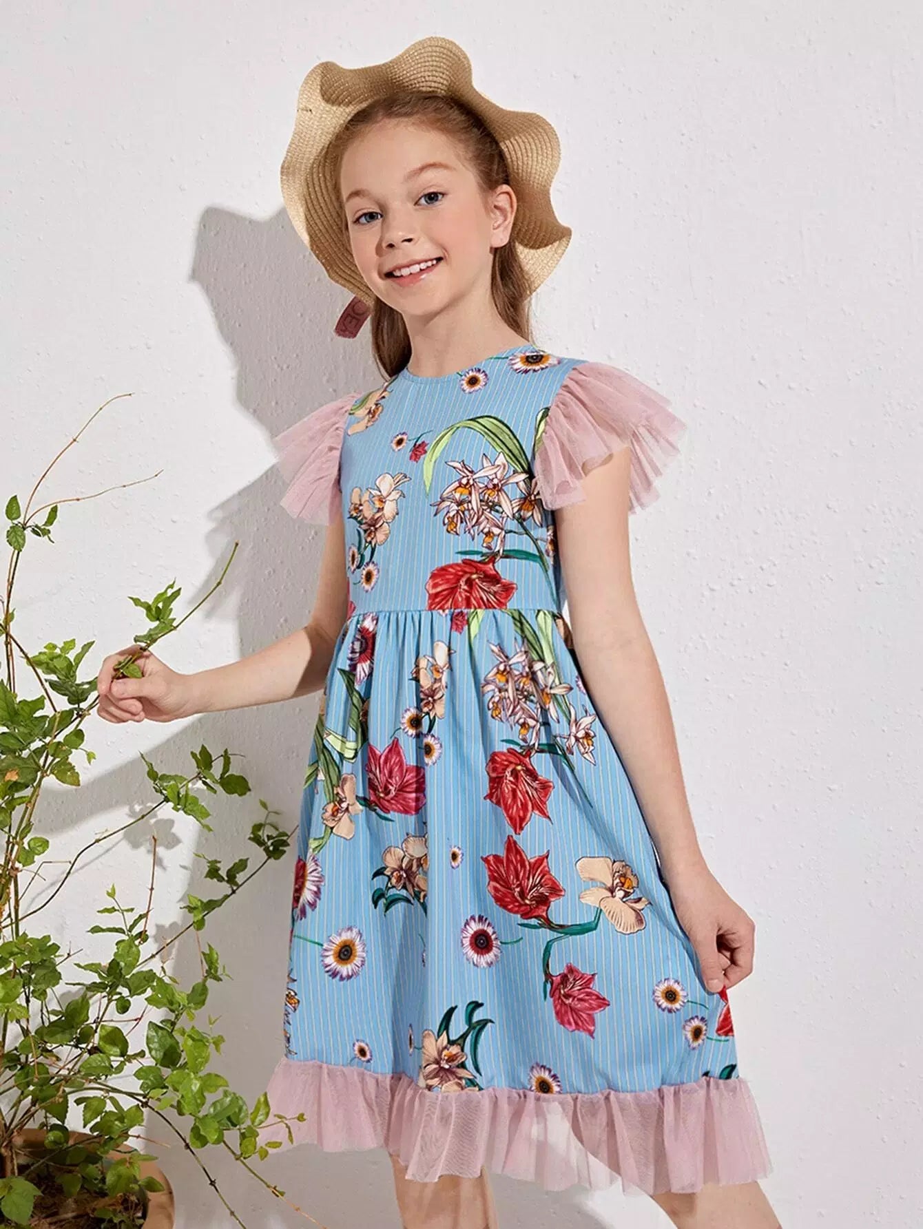 فستان بناتي بأكمام شبكي بطبعة زهور على شكل فراشة بلون مغاير