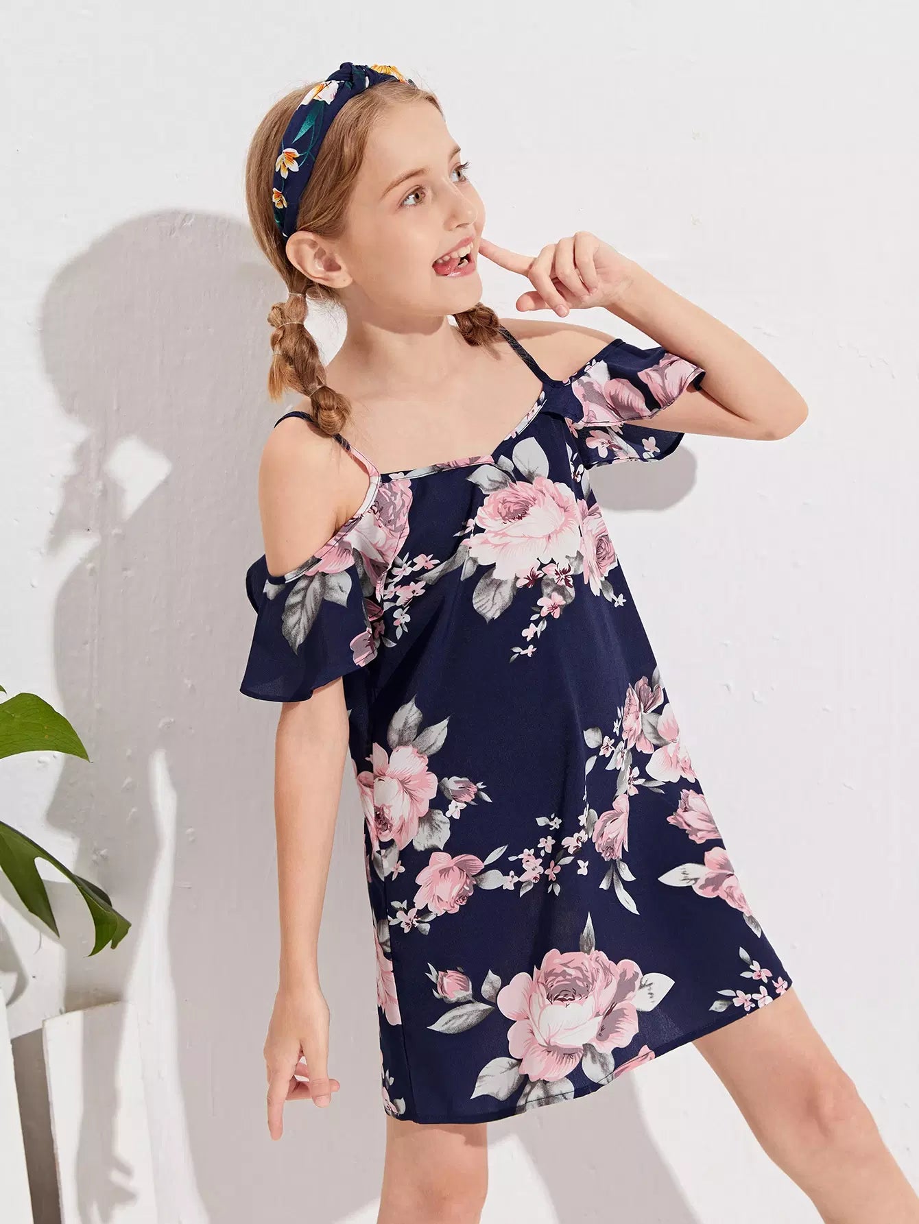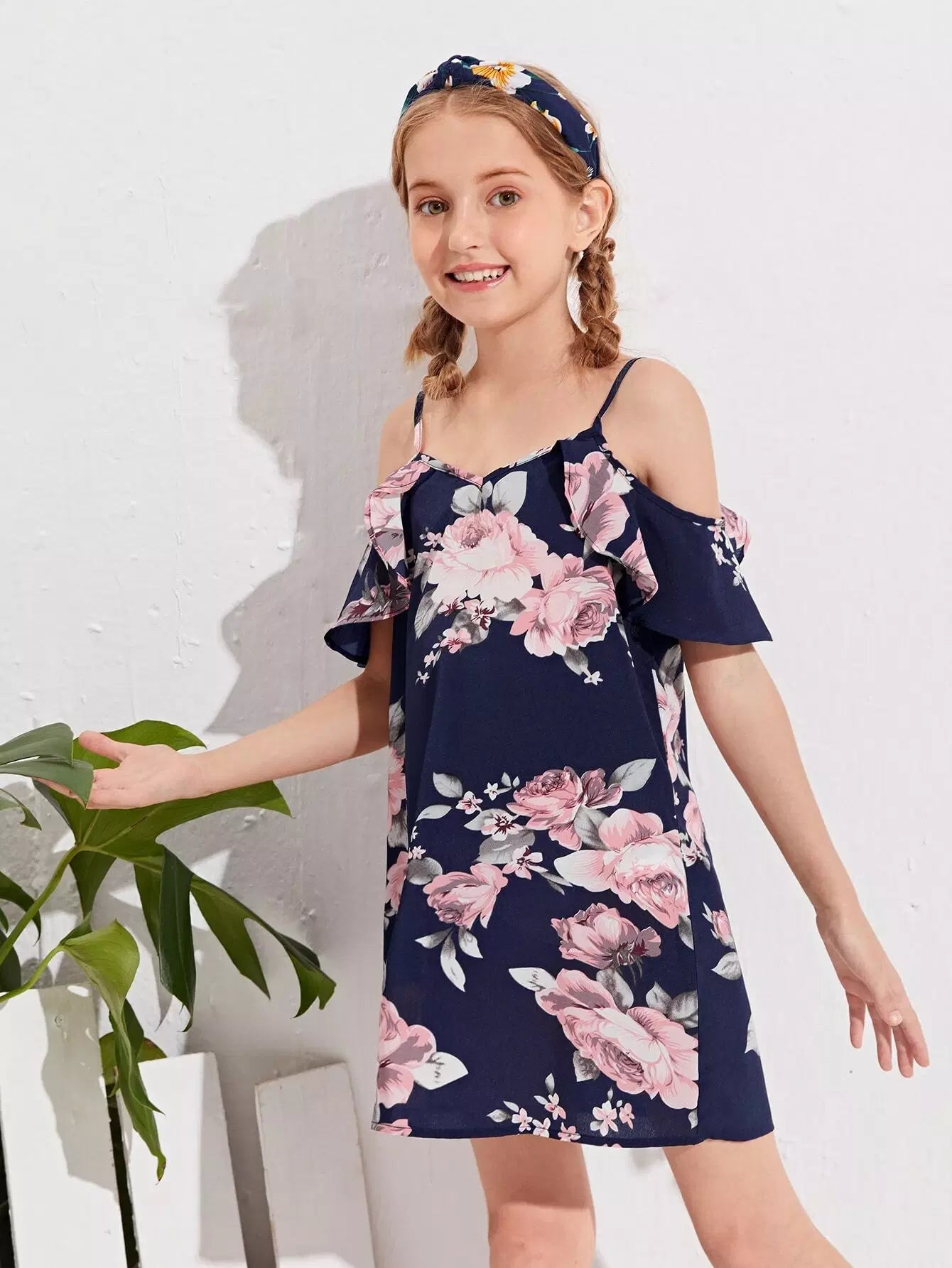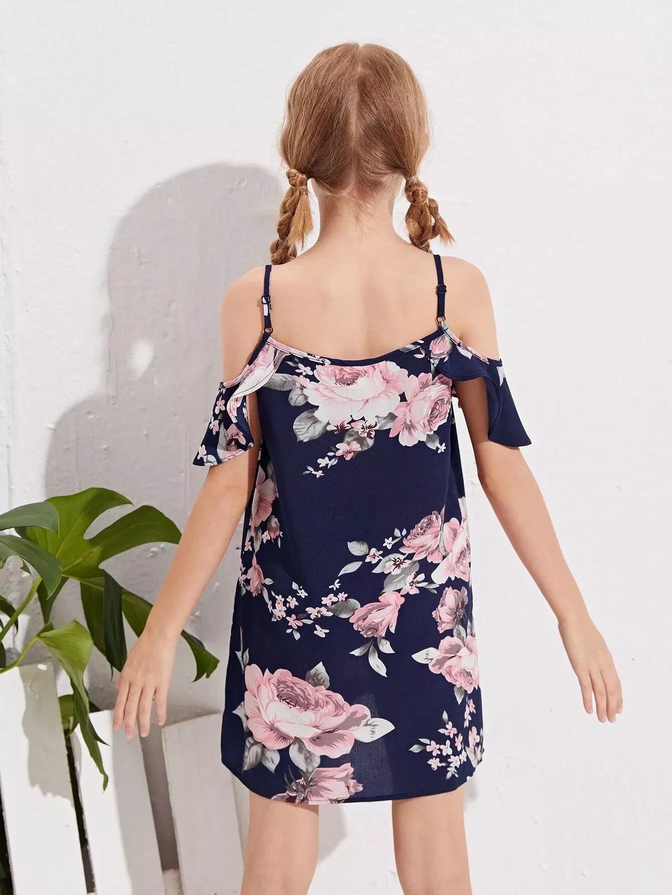 فستان بناتي بطبعة زهور وحواف مكشكشة