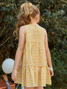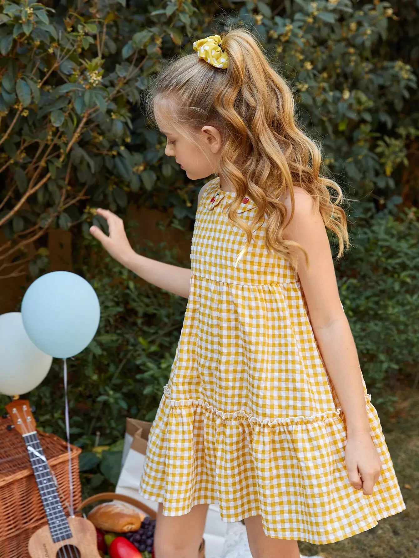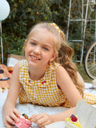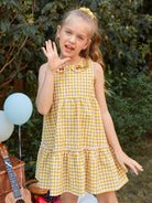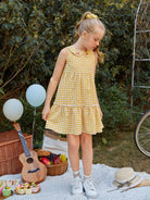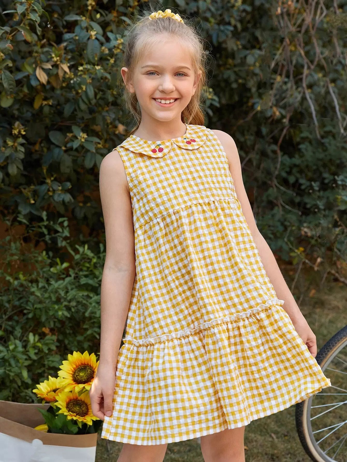 فستان بناتي بطبعة مربعات الكرز وياقة بيتر بان