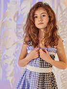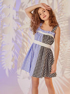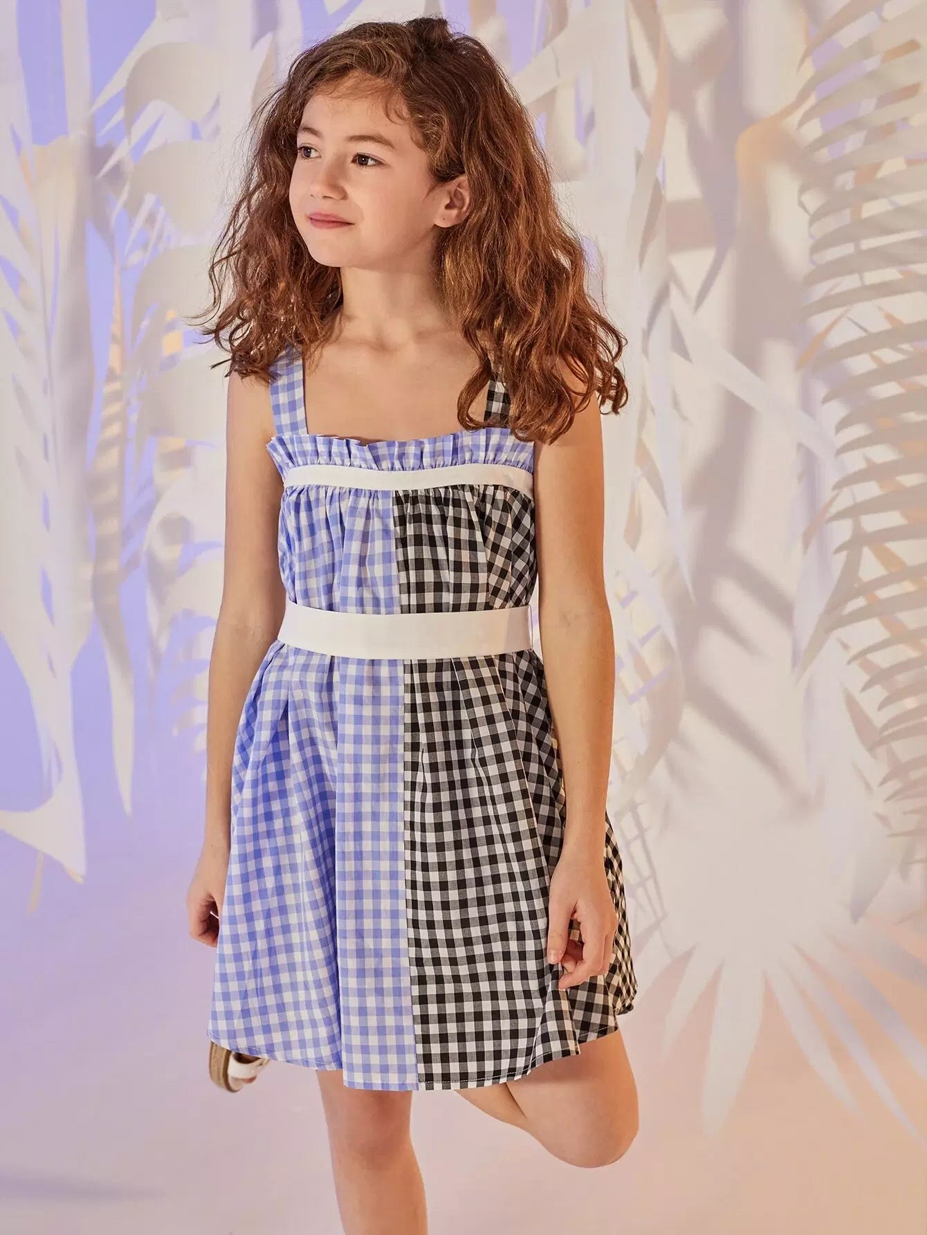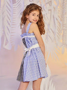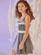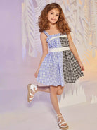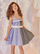 فستان بناتي بحزام خلفي مزين بكشكشة ومربعات