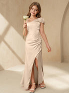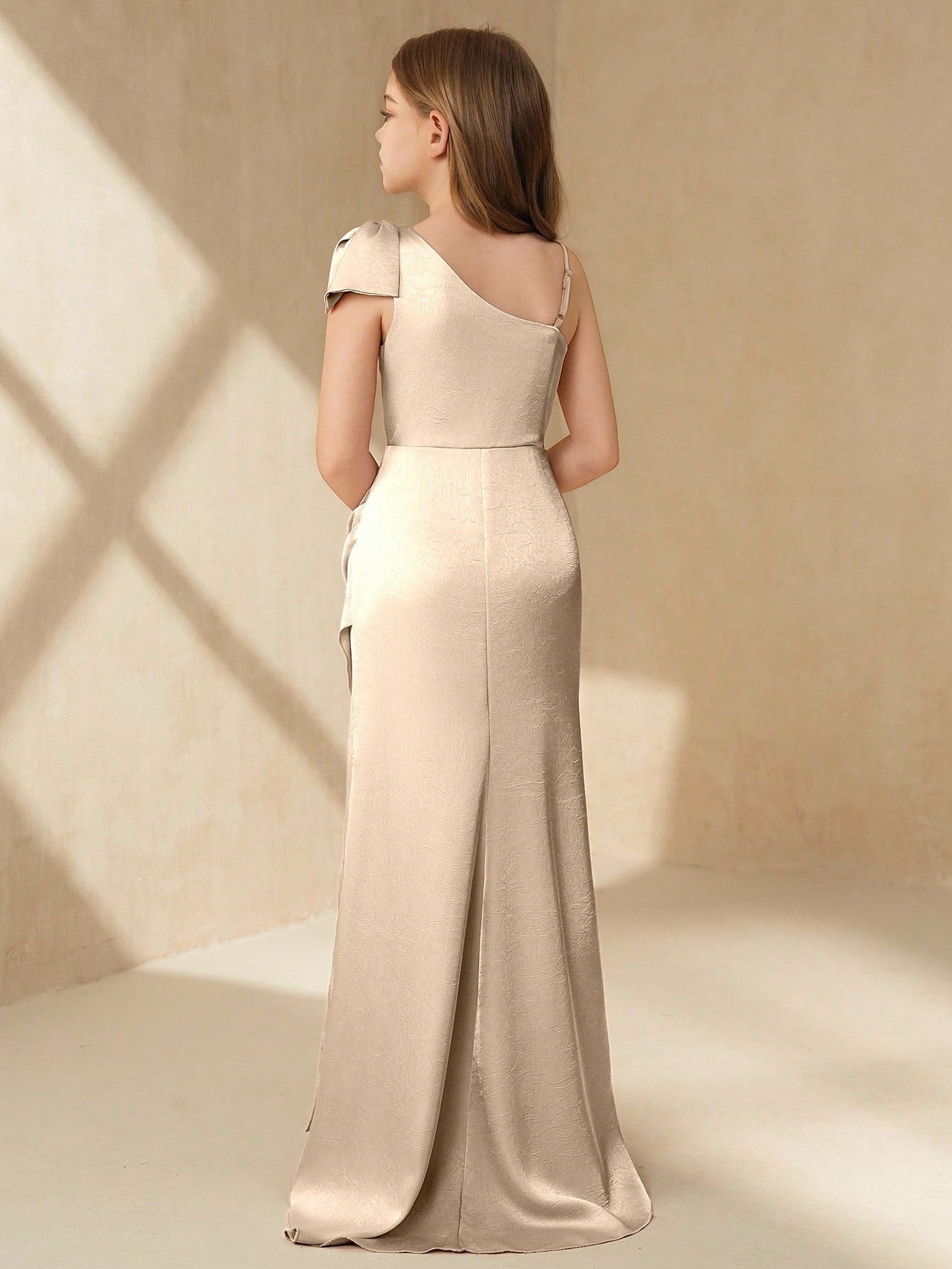 فستان سهرة طويل فاخر للبنات، بكتف واحد، مزين بفيونكة وكسرات وفتحة جانبية