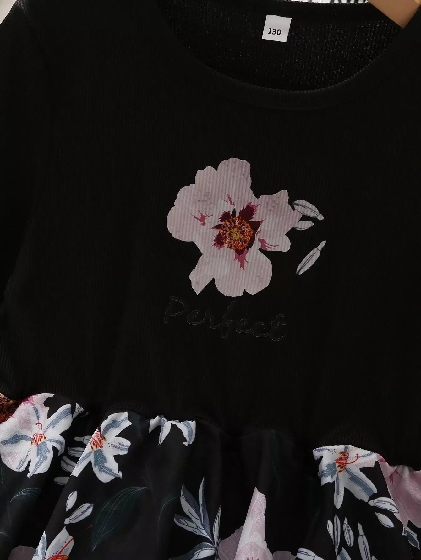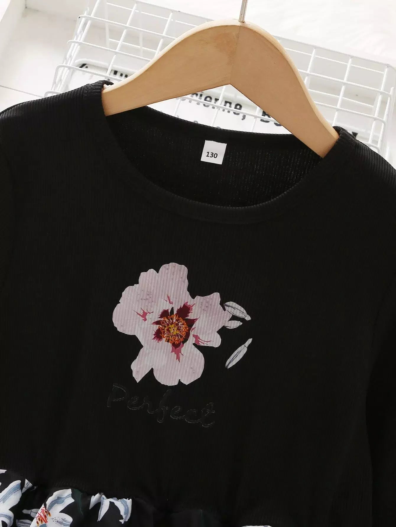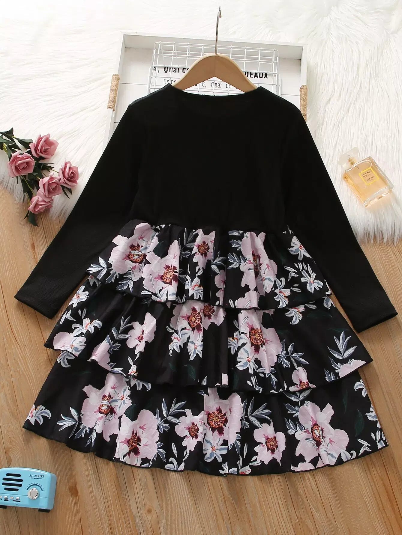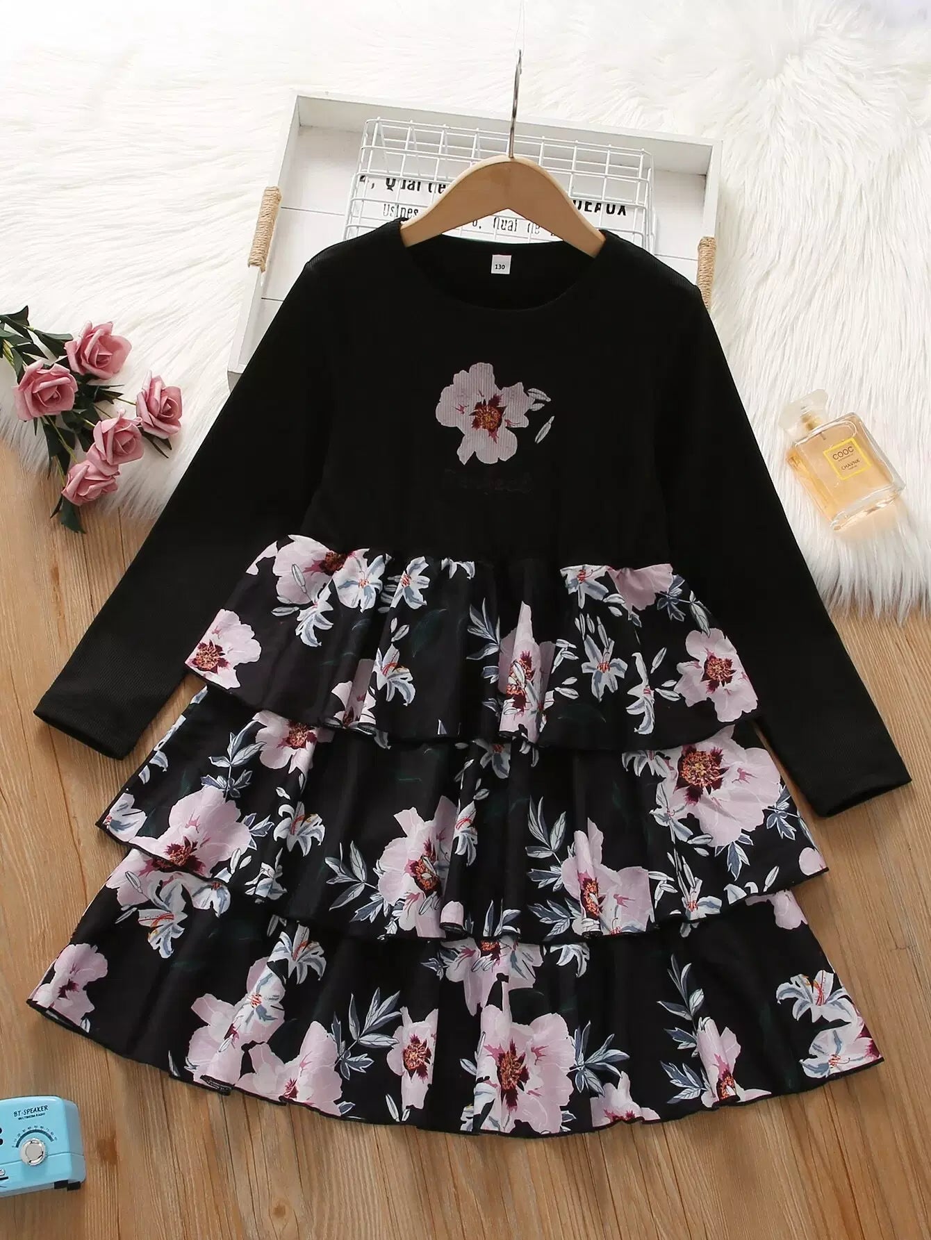 فستان بنات بطبعات حروف ونقوش زهور بطباعة كشكش بطبقات