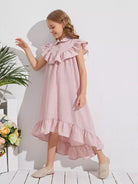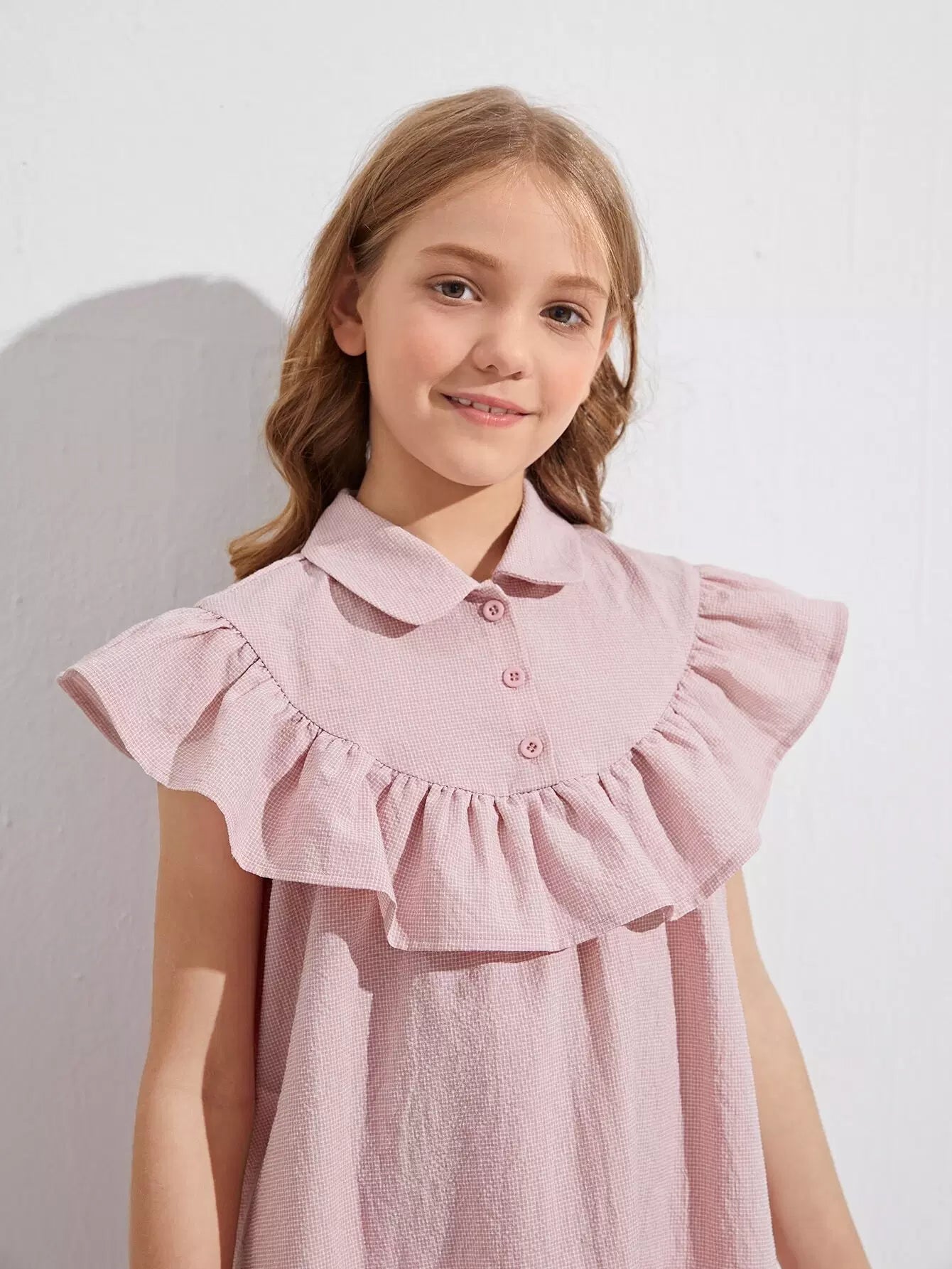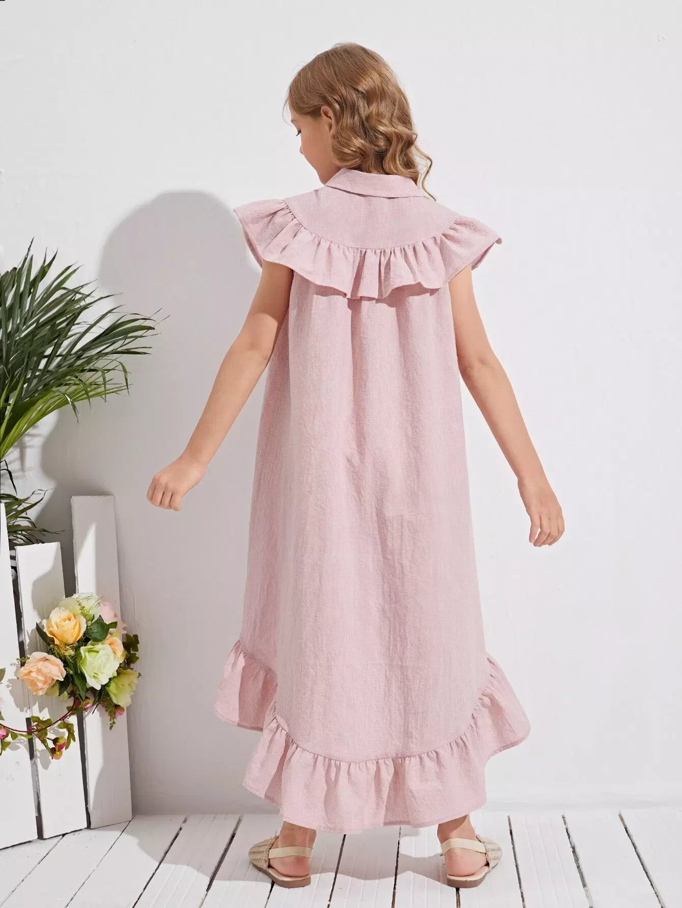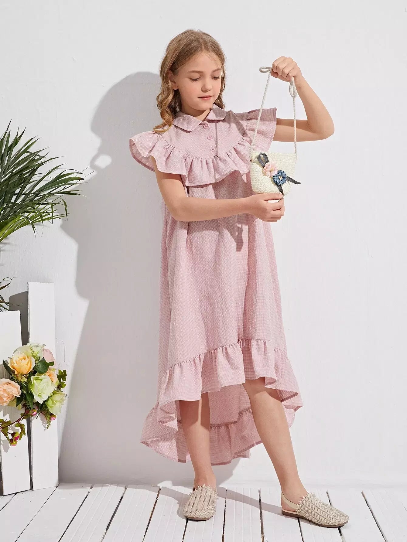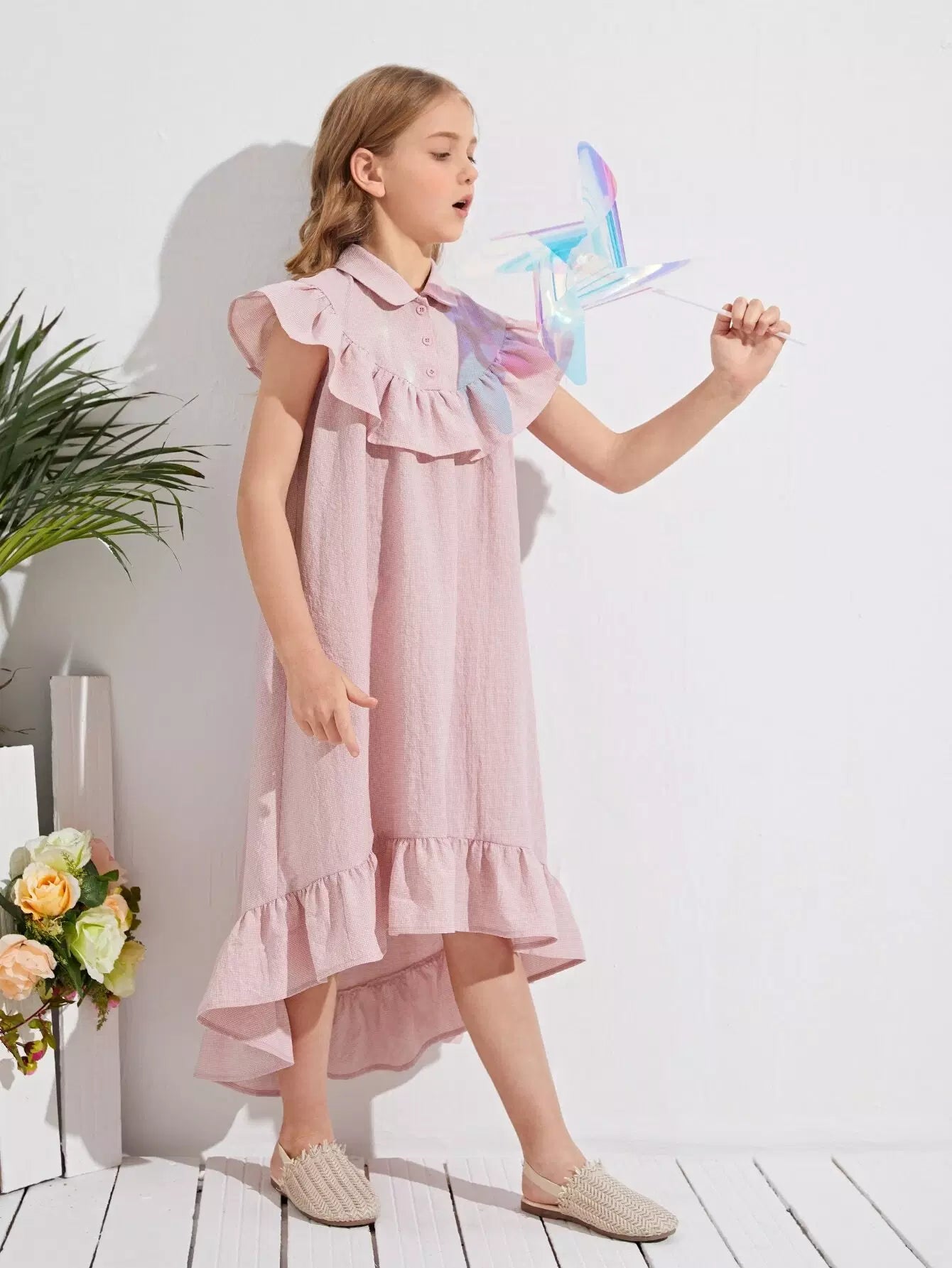 فستان بناتي منخفض الارتفاع مع أزرار أمامية وحاشية مكشكشة