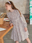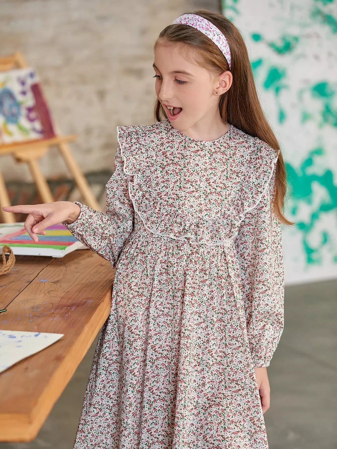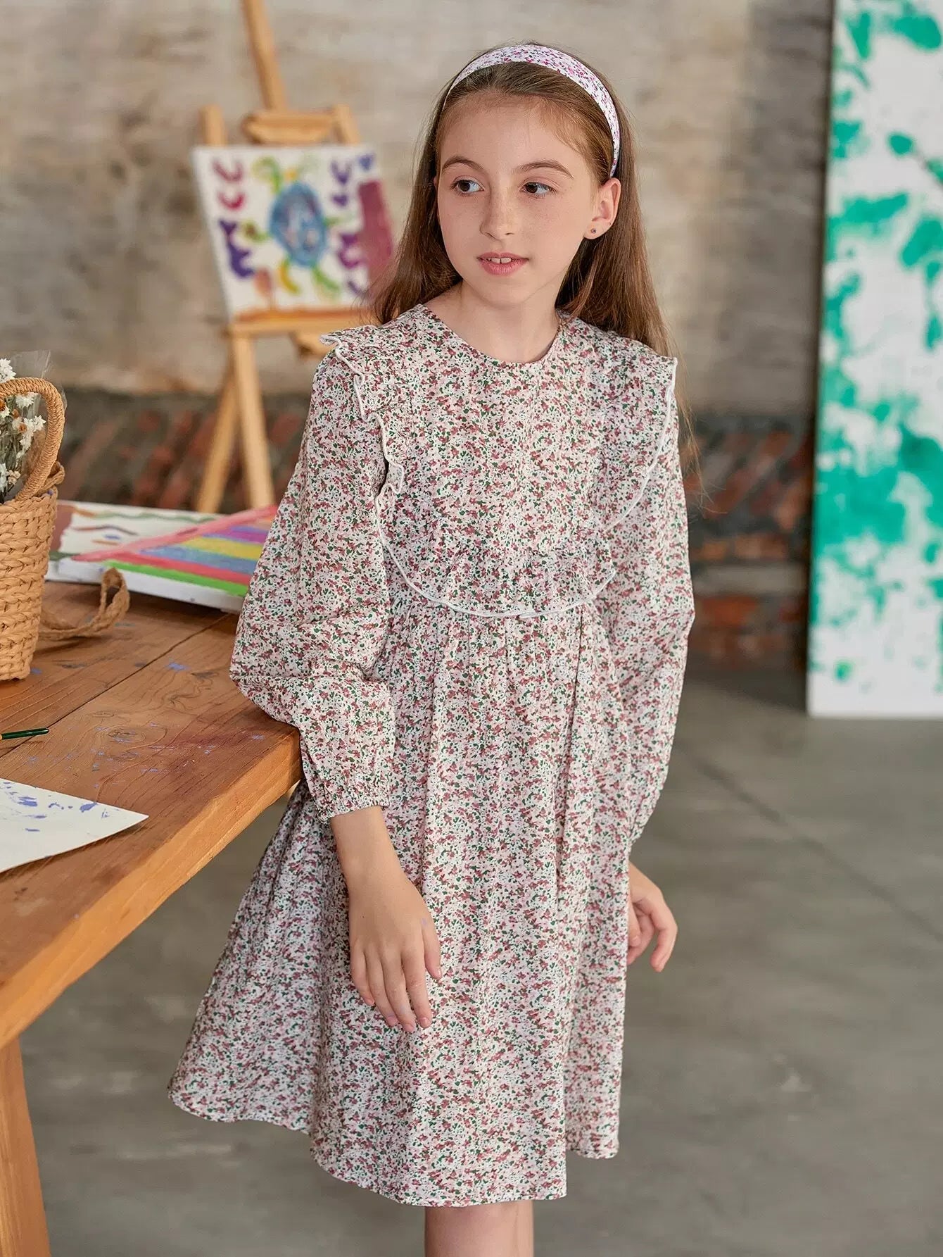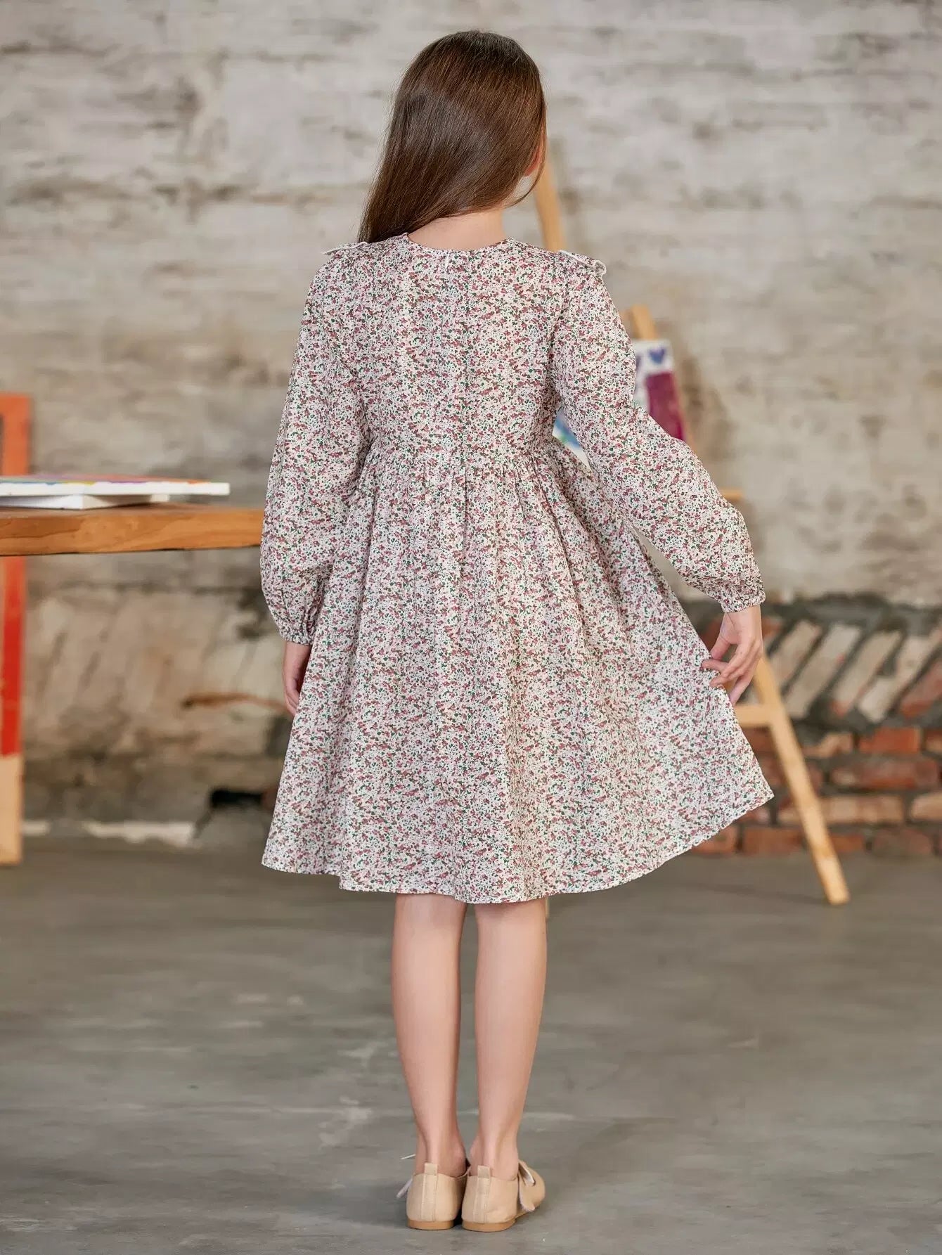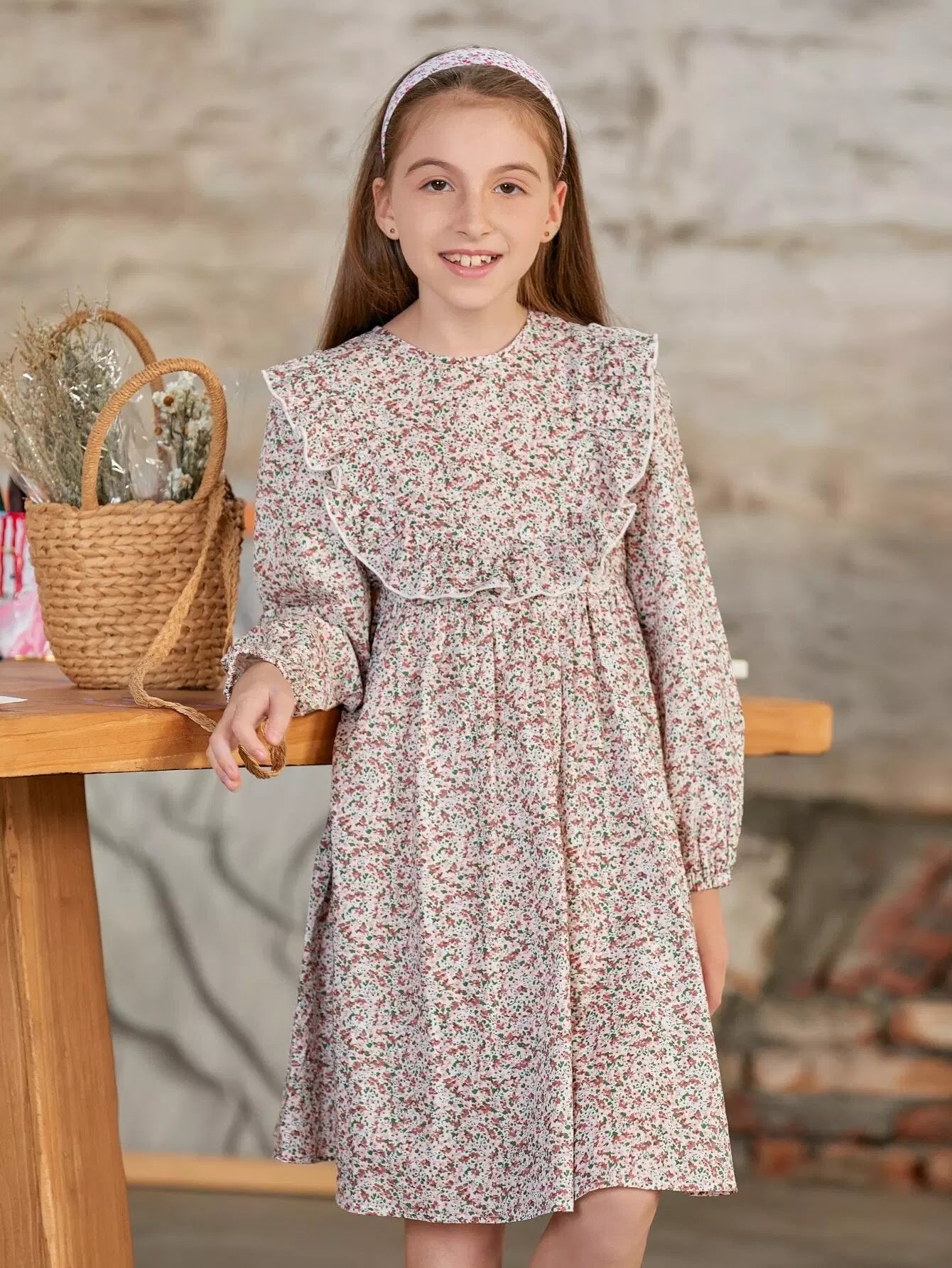 فستان بناتي مزين بالزهور الصغيرة مع حواف مكشكشة