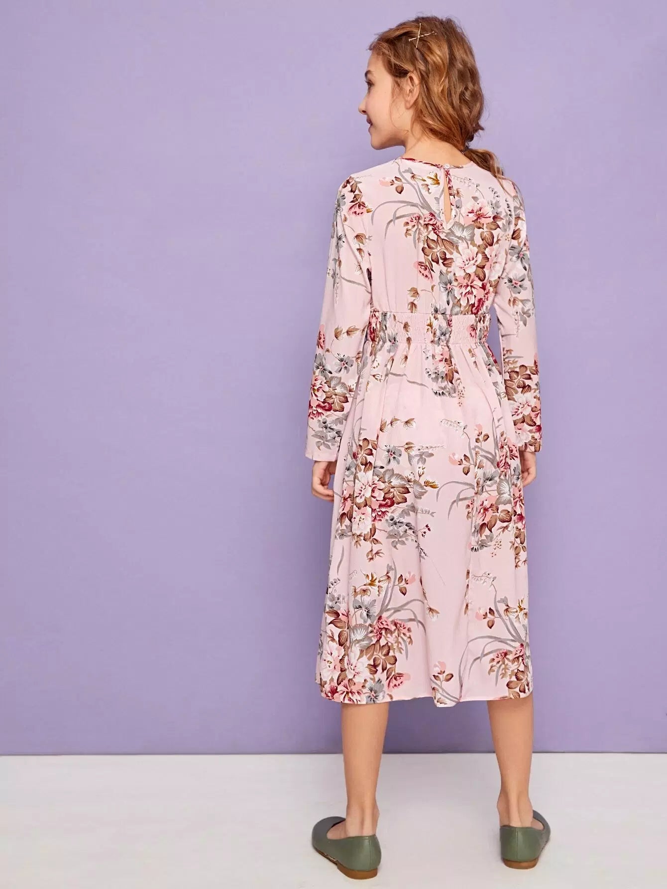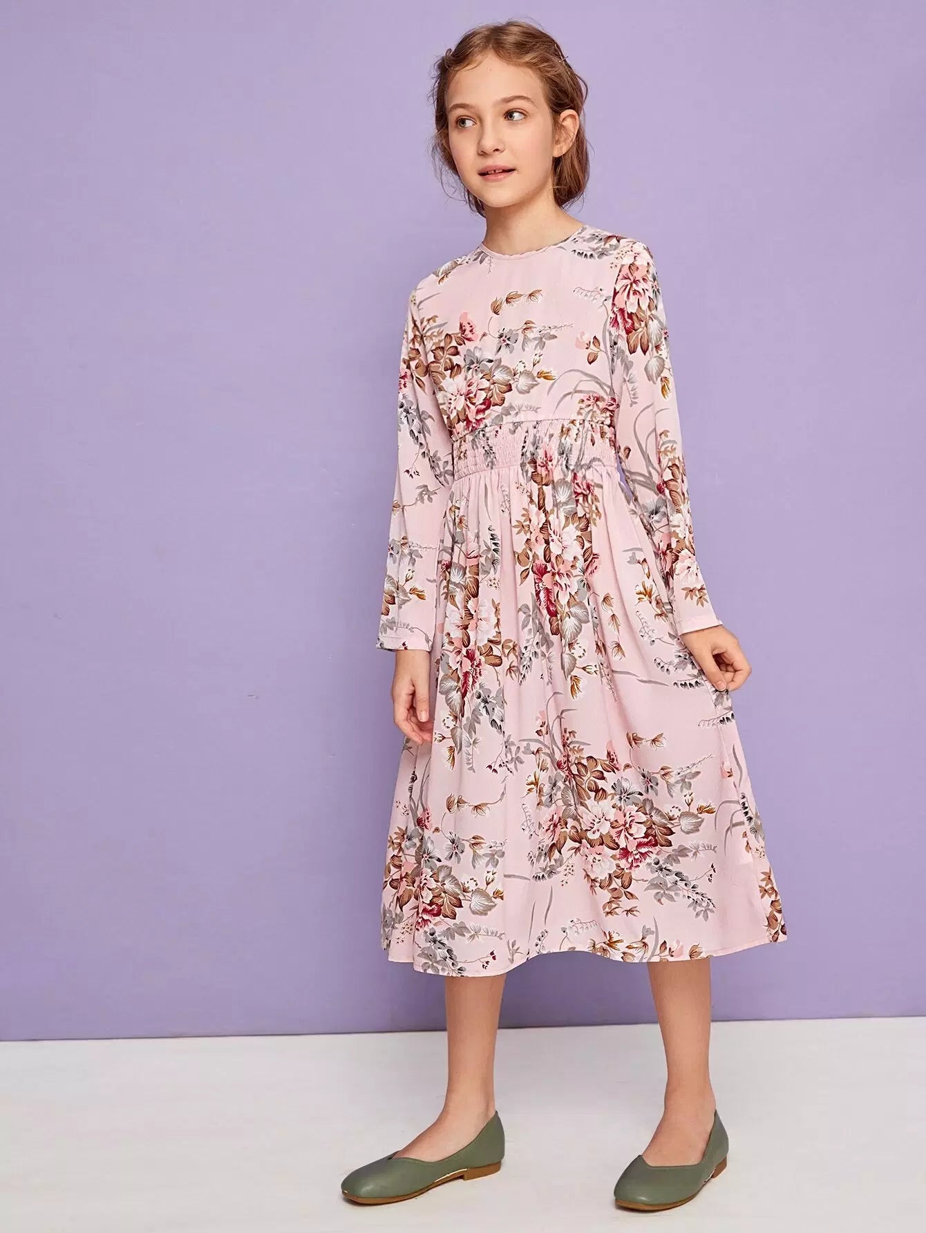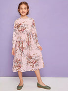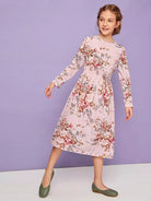 فستان بناتي بطبعة زهور مع حزام خصر مجعد