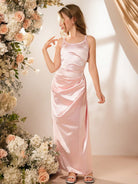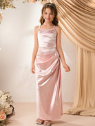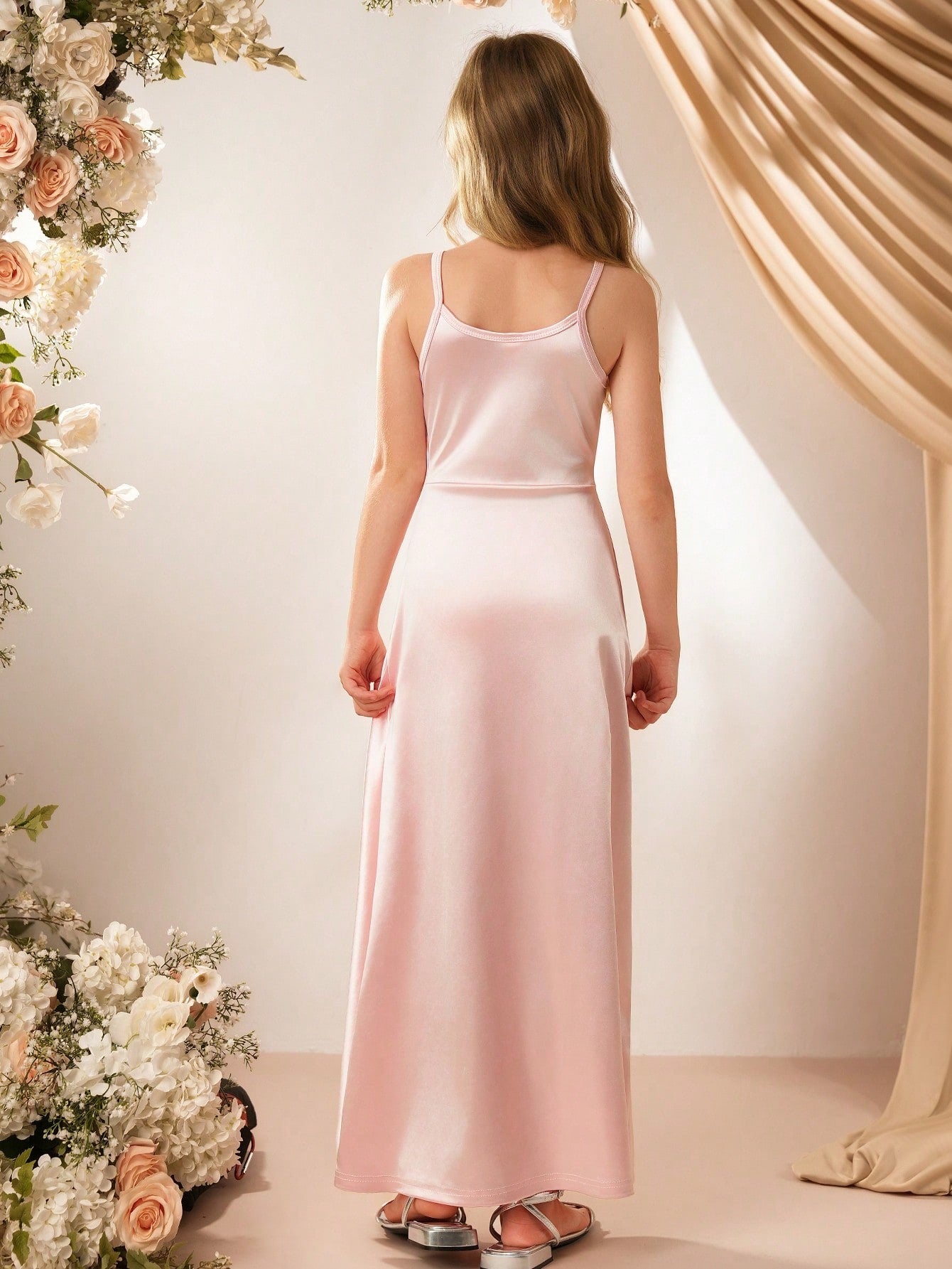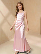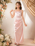 فستان بناتي أنيق وبسيط بدون أكمام بخصر عالٍ، مصنوع من الساتان اللامع بلون موحد