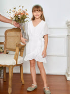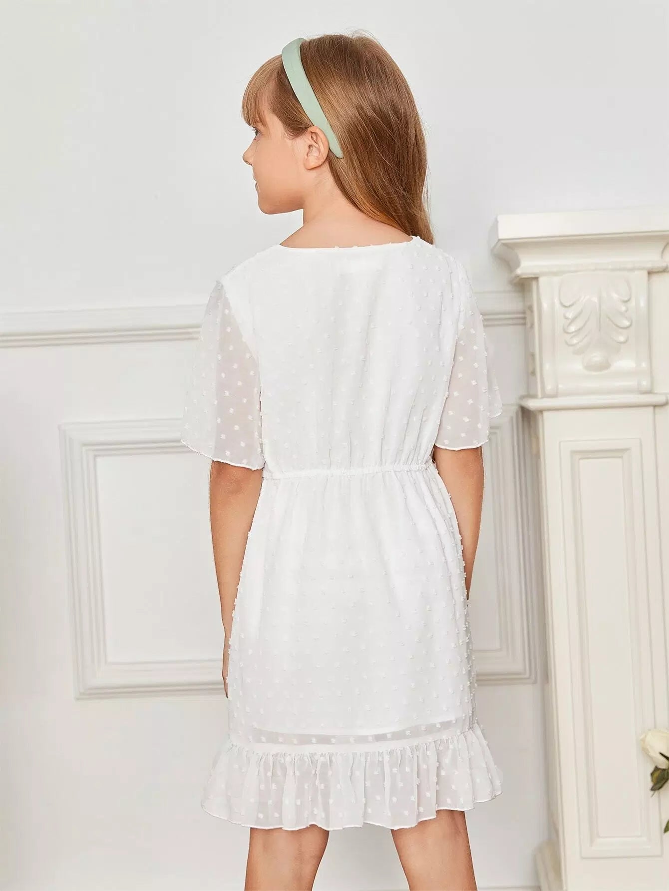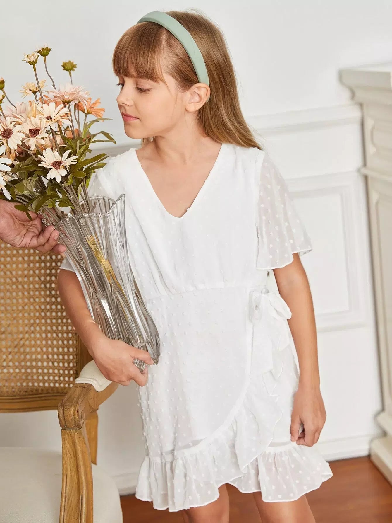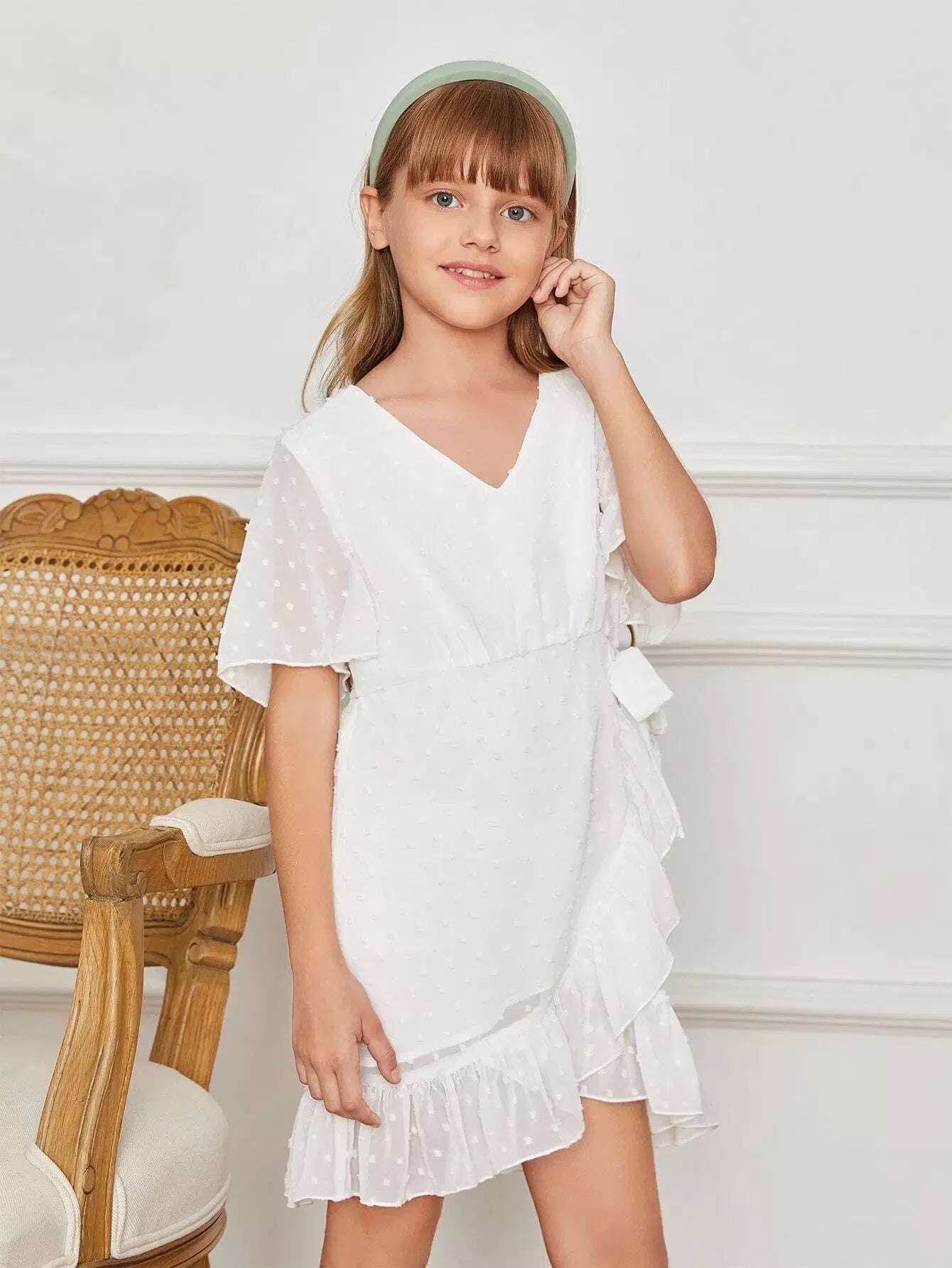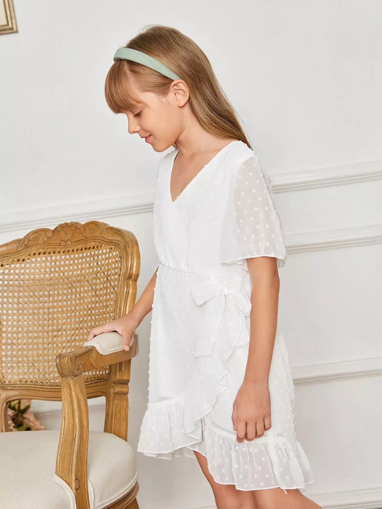 فستان سويسري منقط بأكمام منفوشة وحواف مكشكشة ورباط جانبي للفتيات