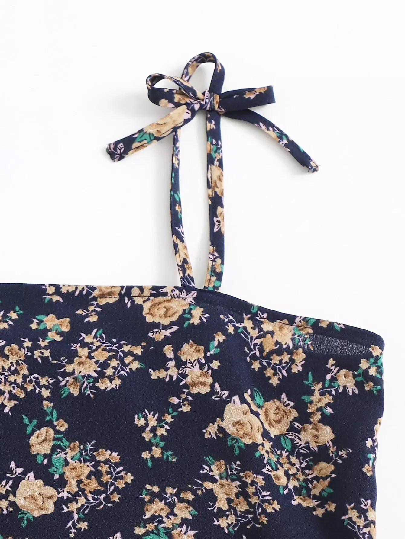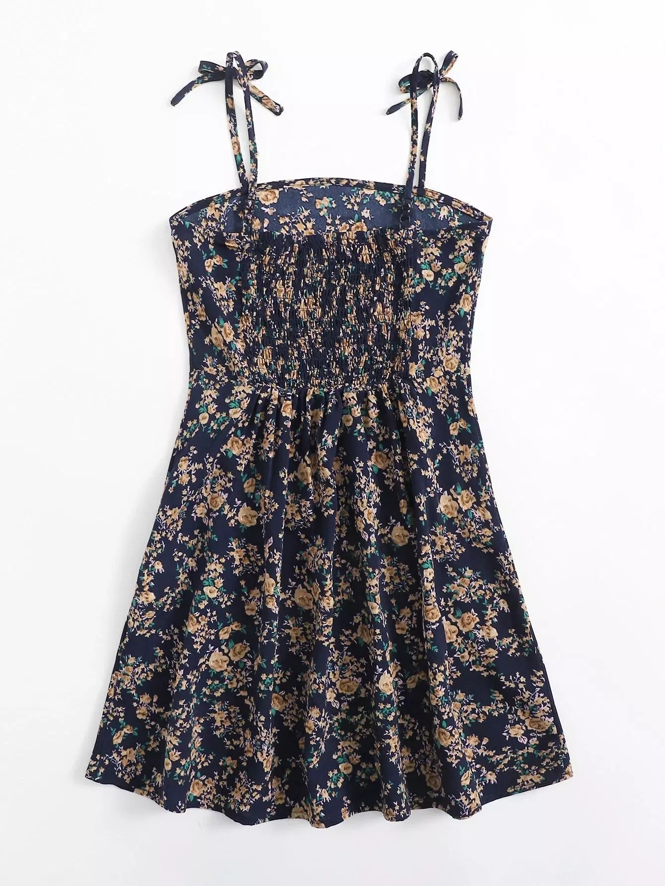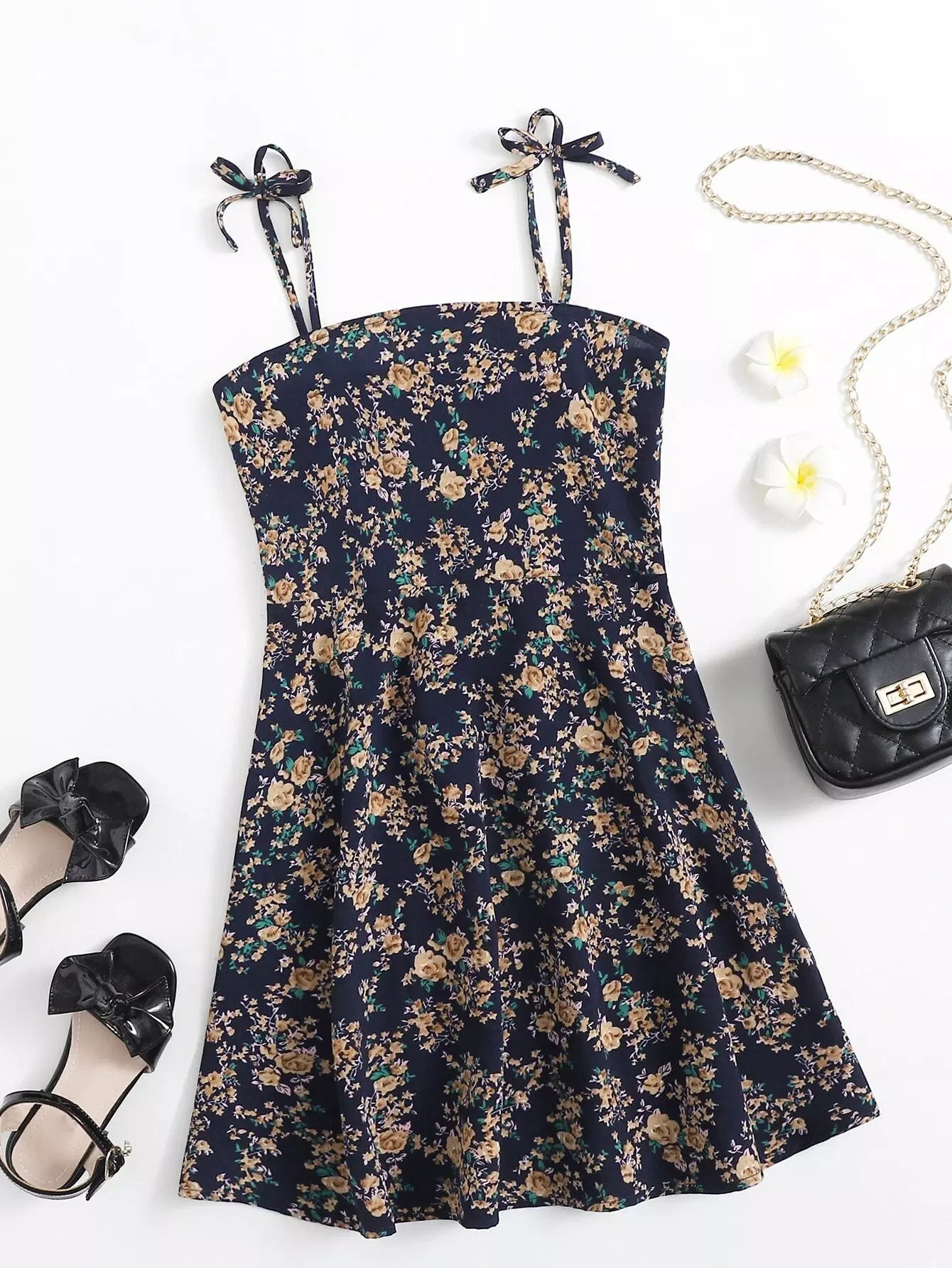 فستان بناتي بكتف مربوط على الكتف بشريط على الظهر مزين بالورود