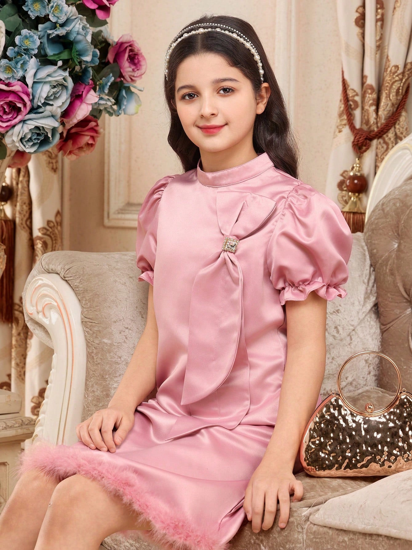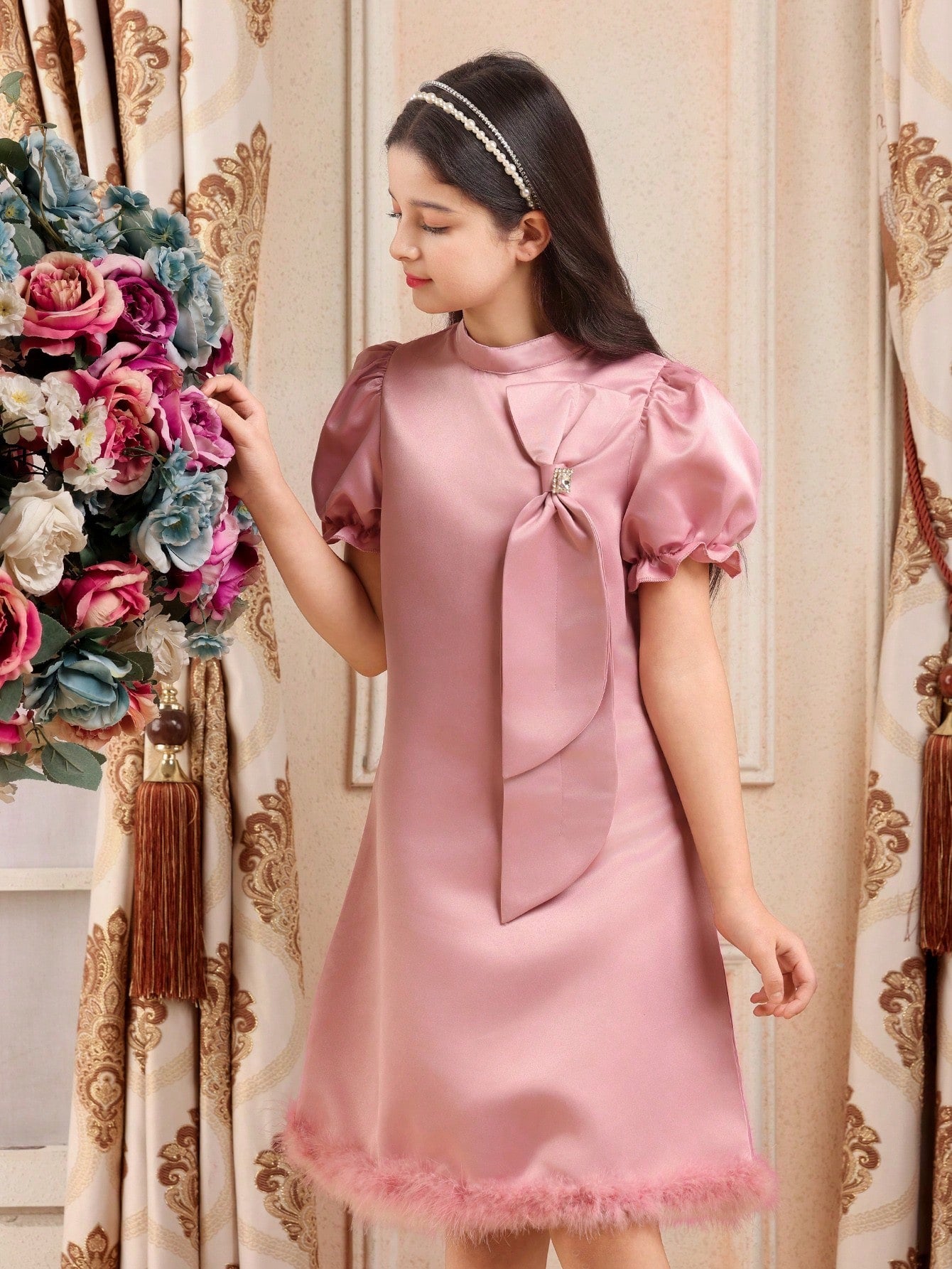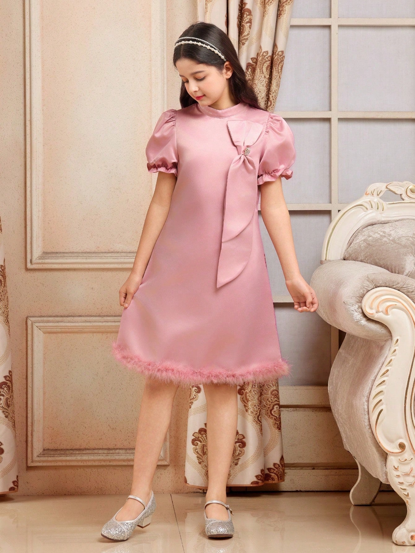 Holiday,Summer,Travel Tween Girls Elegant Pink Mid-Length Dress, Stand Collar, Rhinestone, Bow & Fluffy