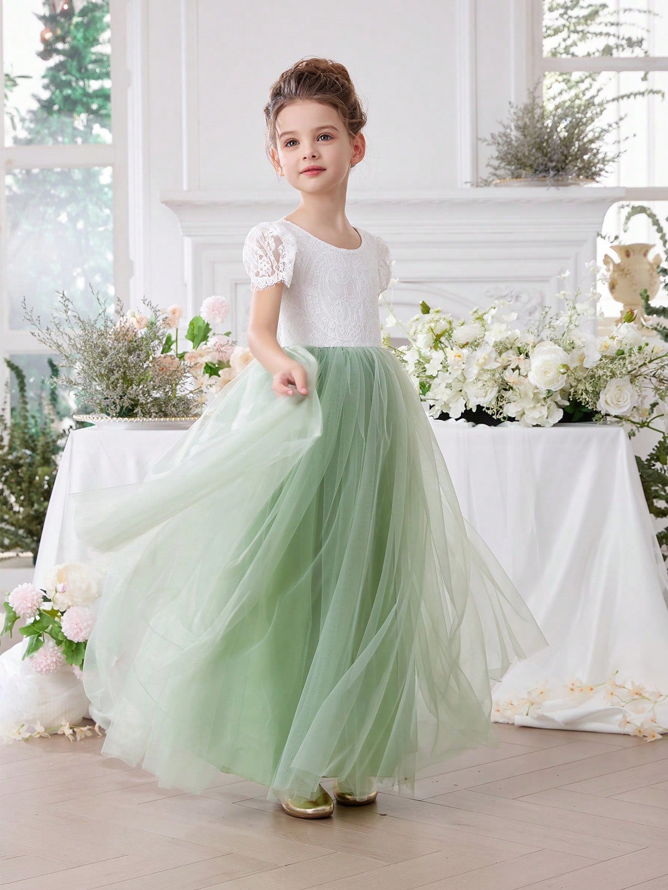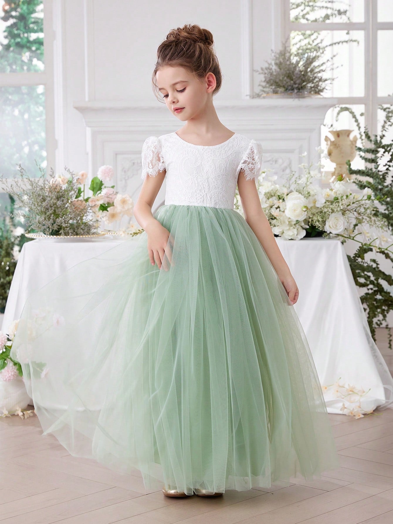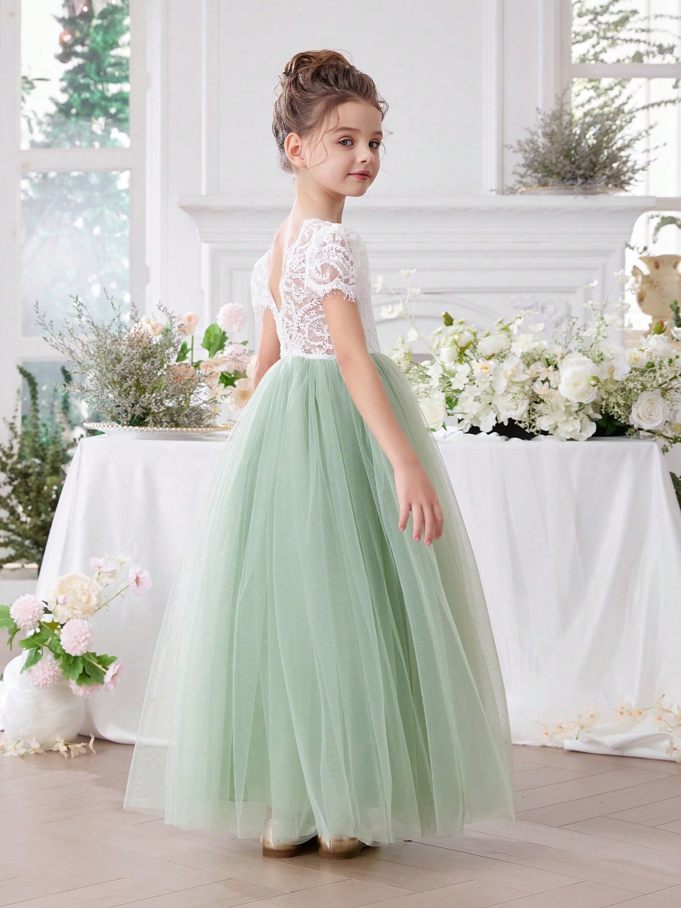 فستان سهرة أنيق بلون أخضر نعناعي بتصميم أميرة، بياقة على شكل حرف V وحواف من الدانتيل والشبك.