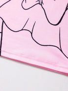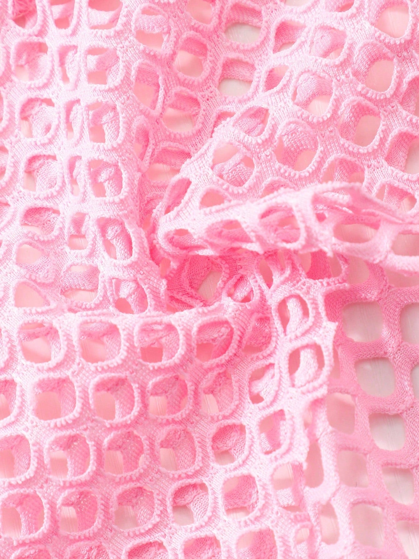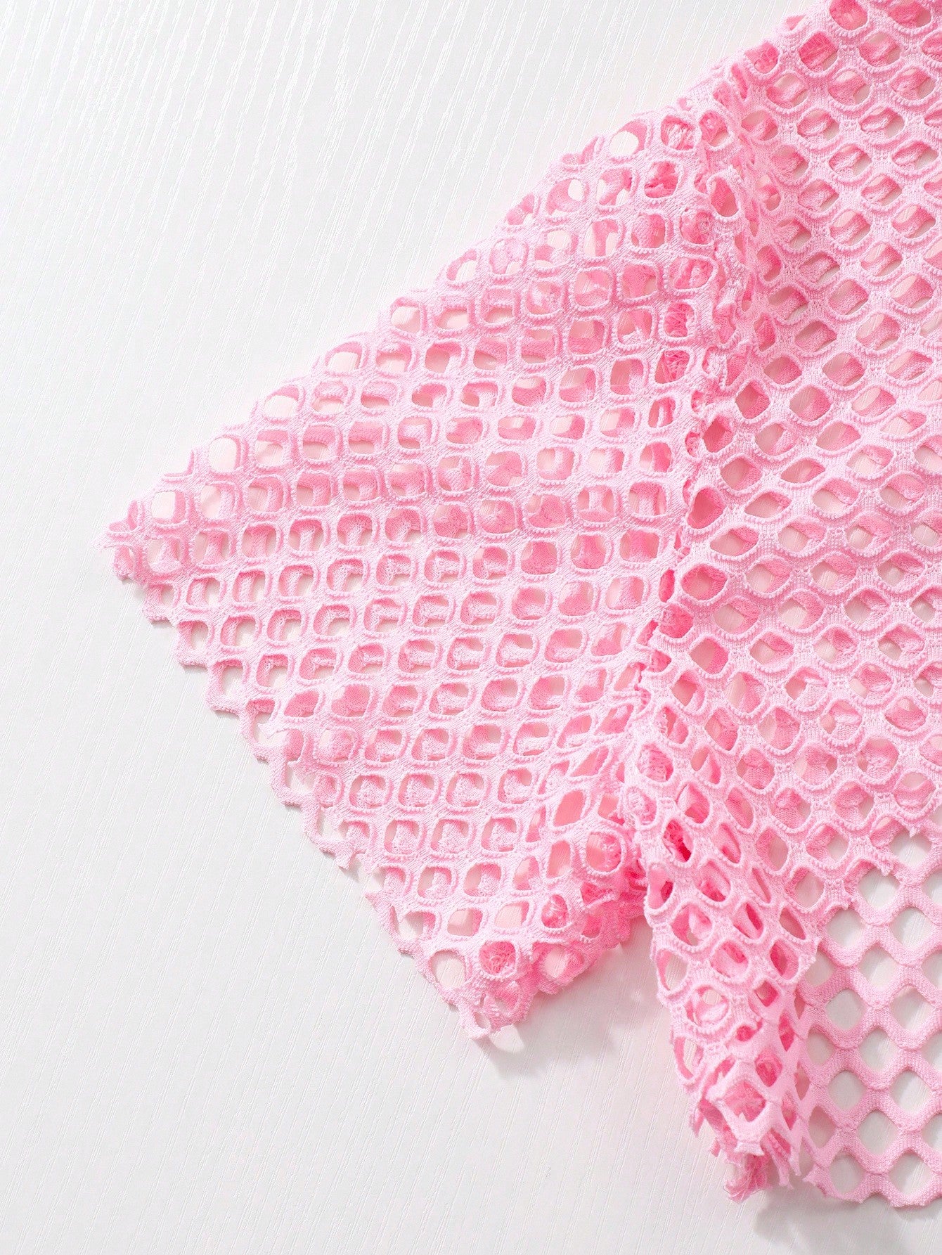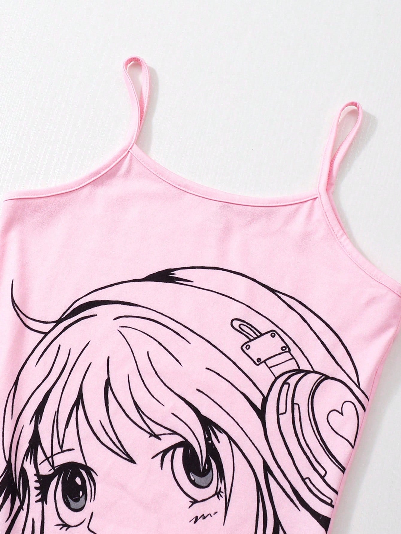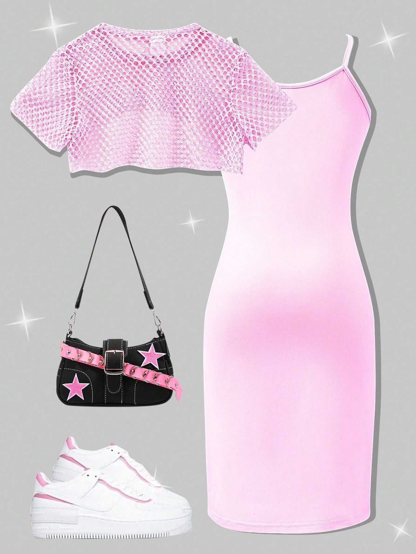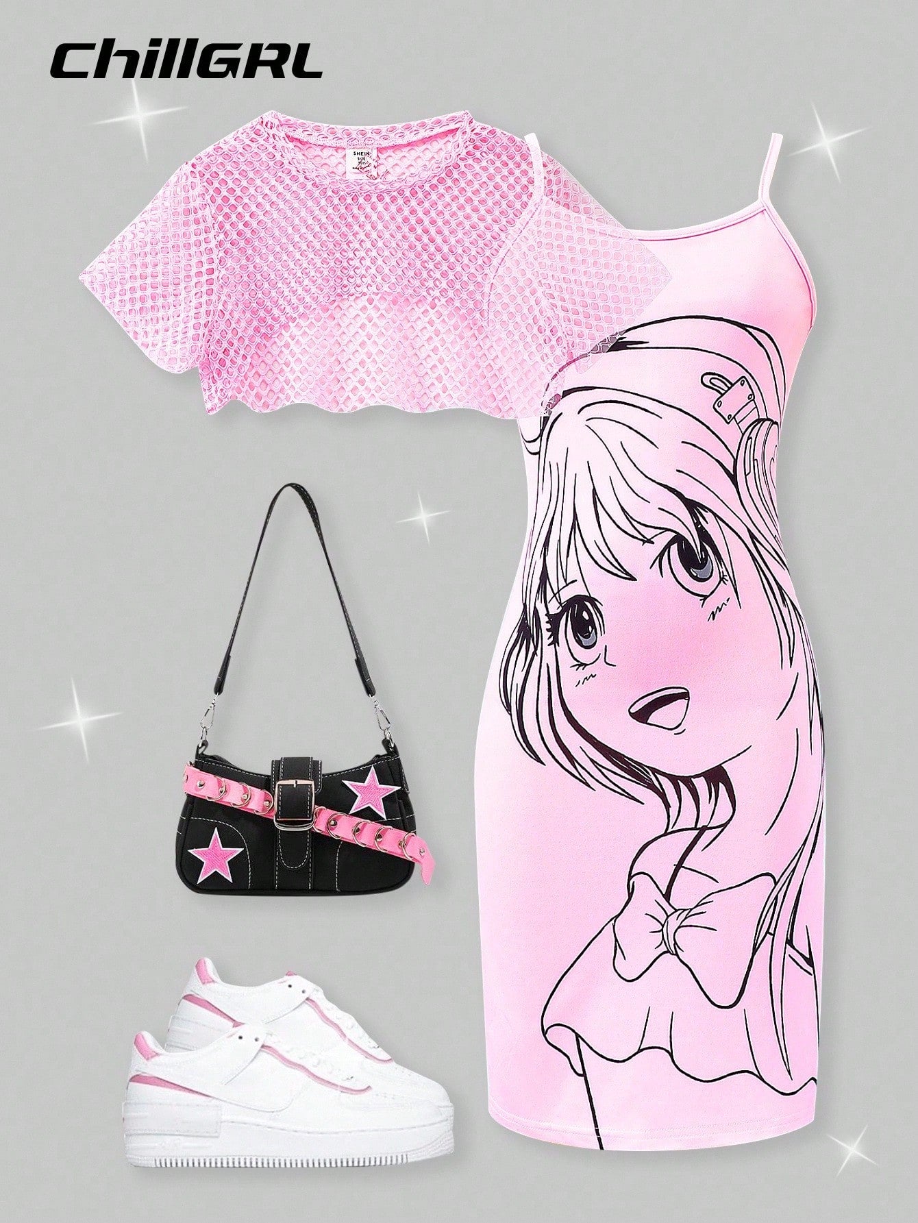طقم من قطعتين من SHEIN للفتيات المراهقات من قماش شبكي سادة بحافة غير متماثلة مع فستان كامي بطبعة فتاة كرتونية