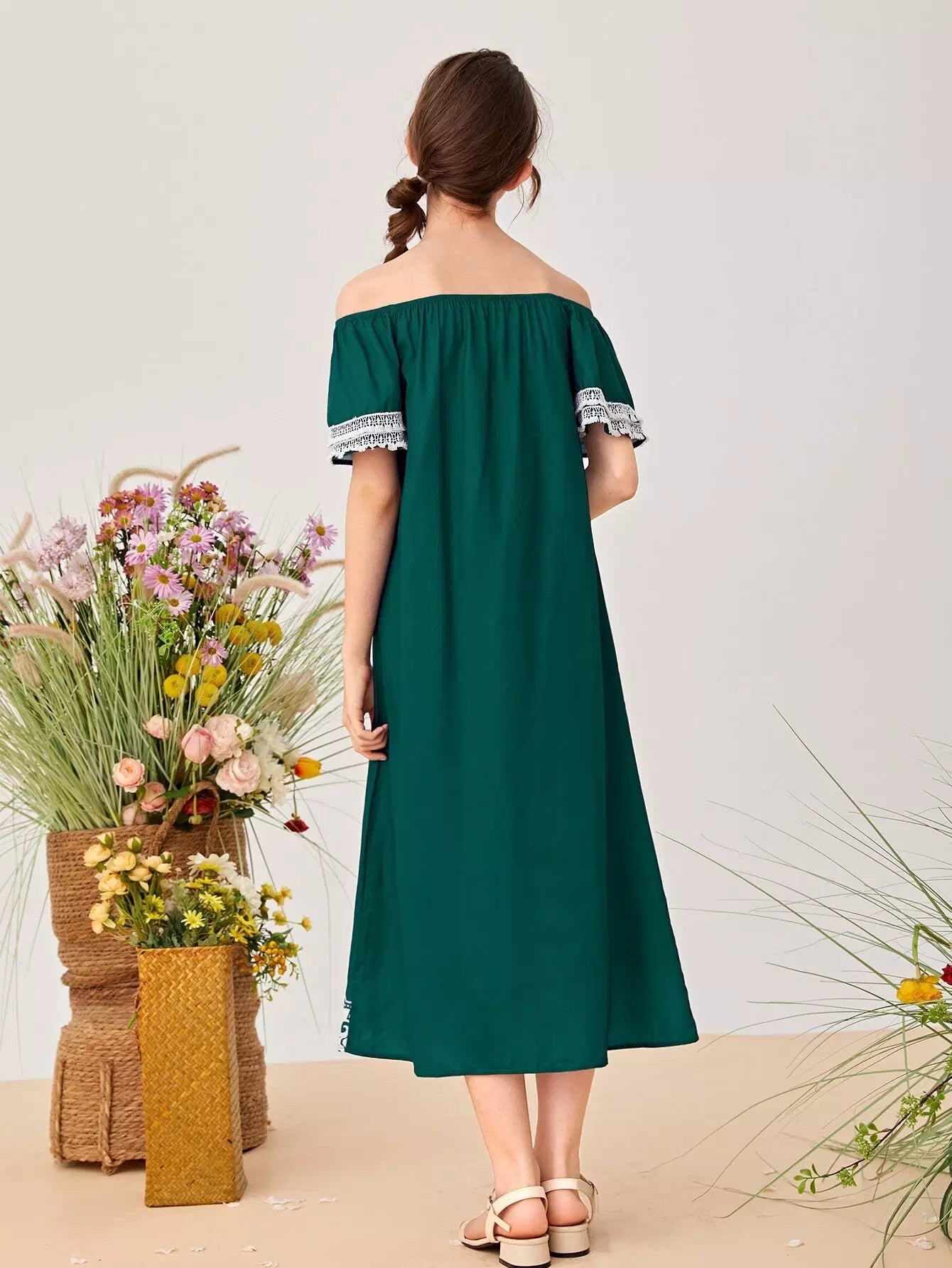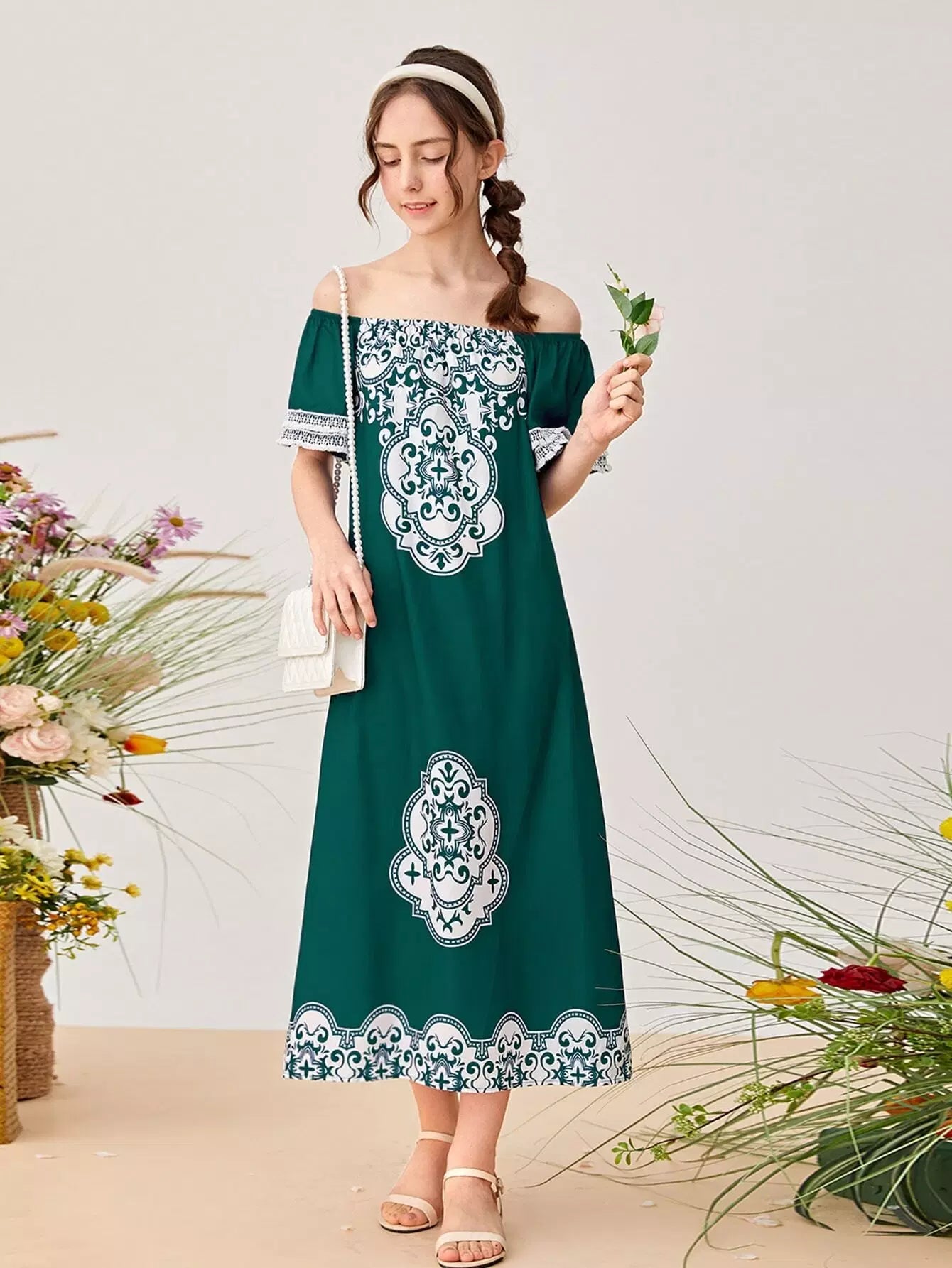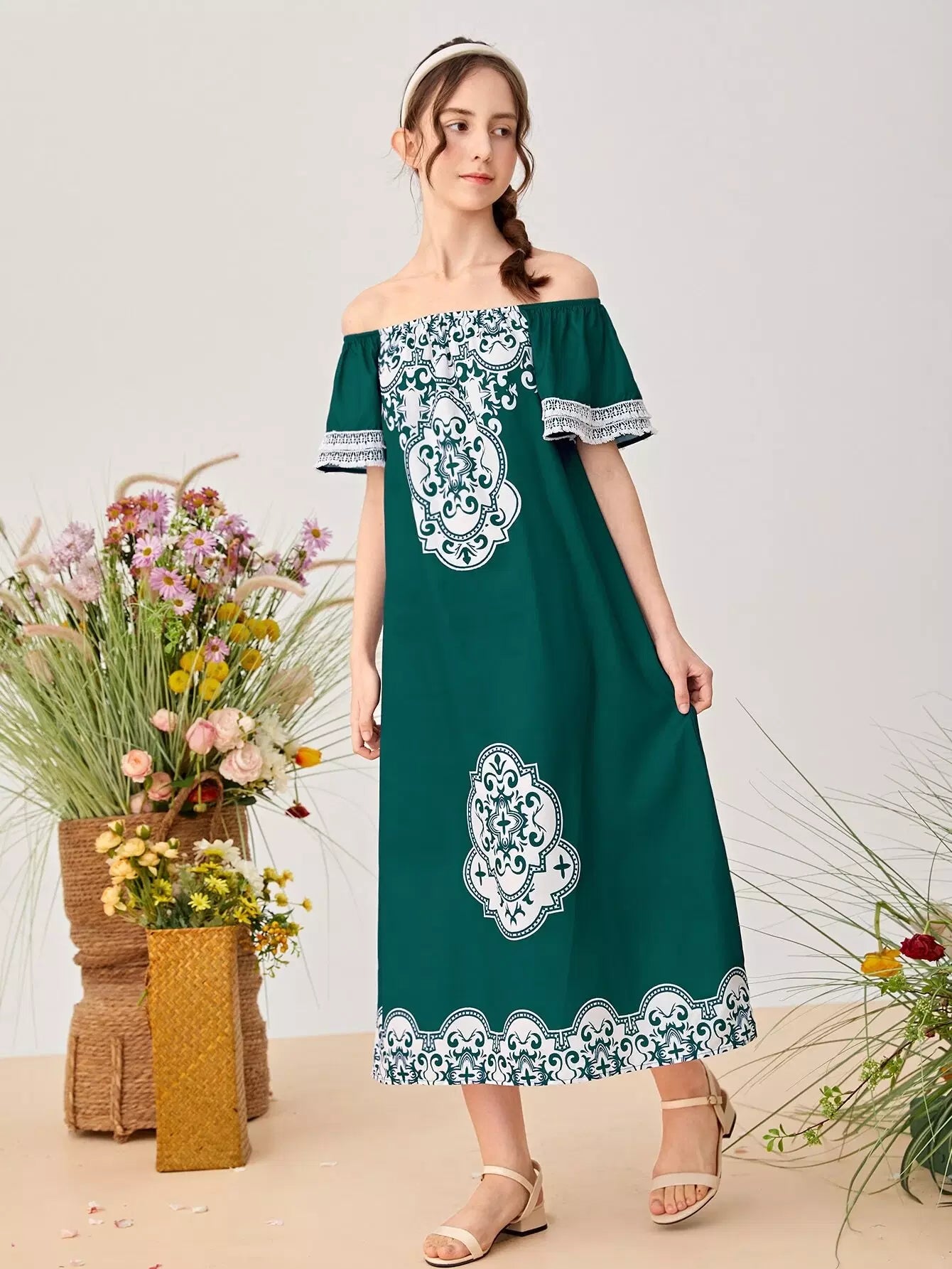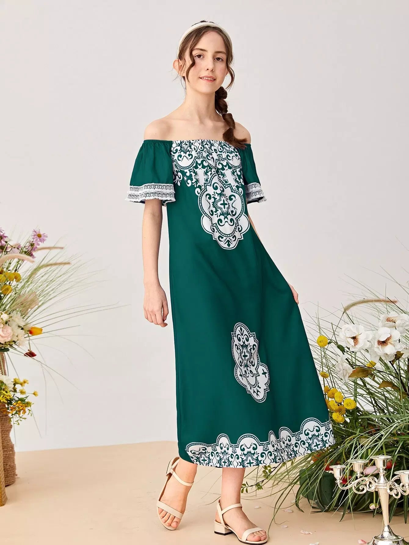 فستان بناتي مراهقات بطبعة الباروك بدون أكتاف