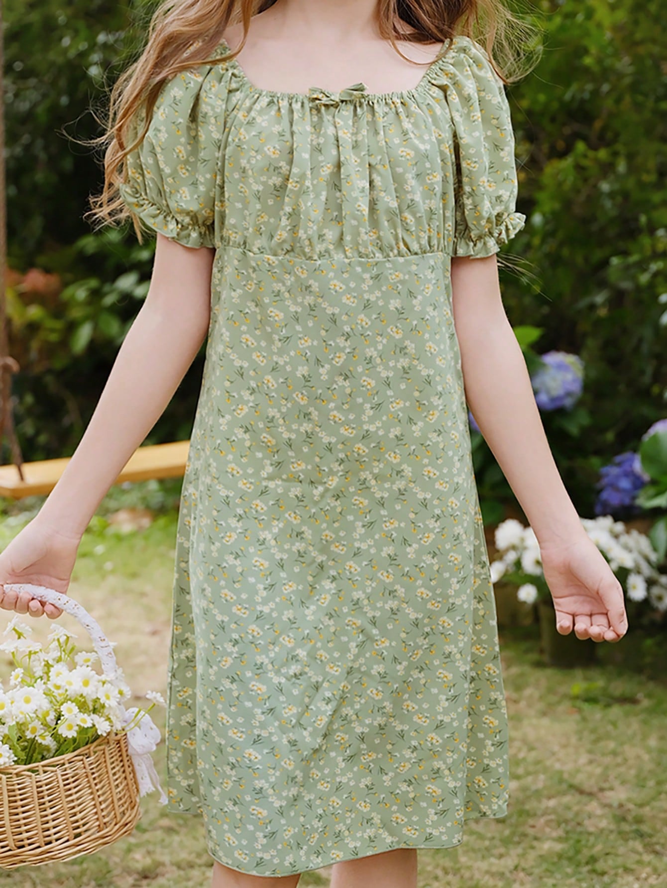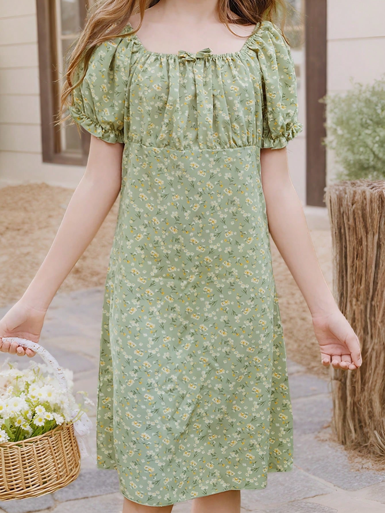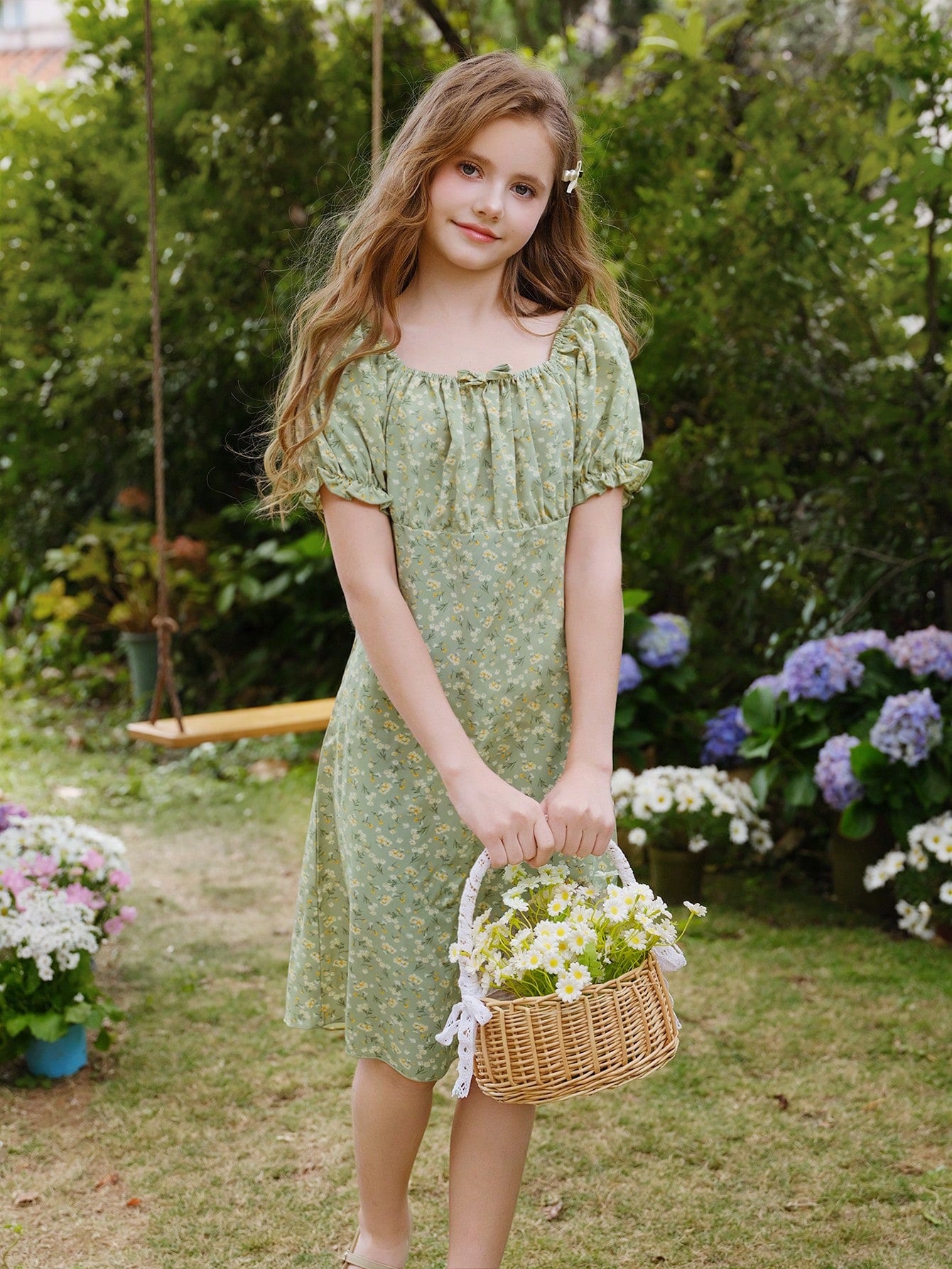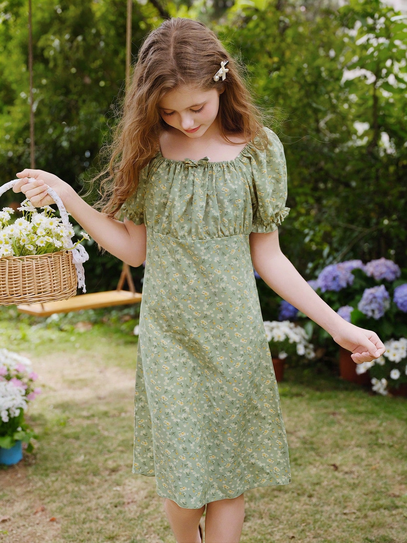 فستان أخضر أنيق مزين بطبعة زهور للفتيات الصغيرات - فستان أخضر أنيق وجميل بأكمام منفوخة وفيونكة