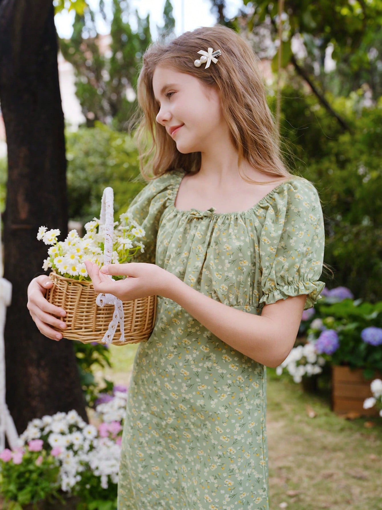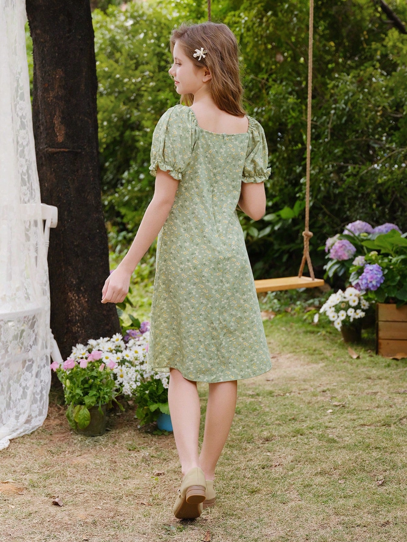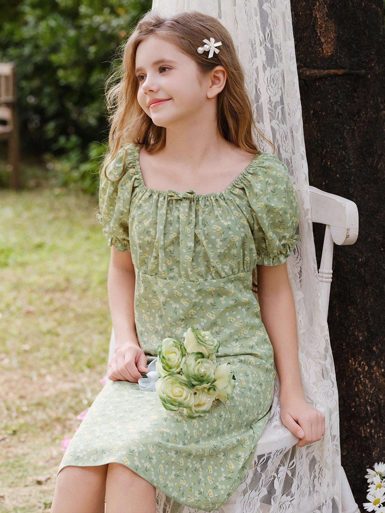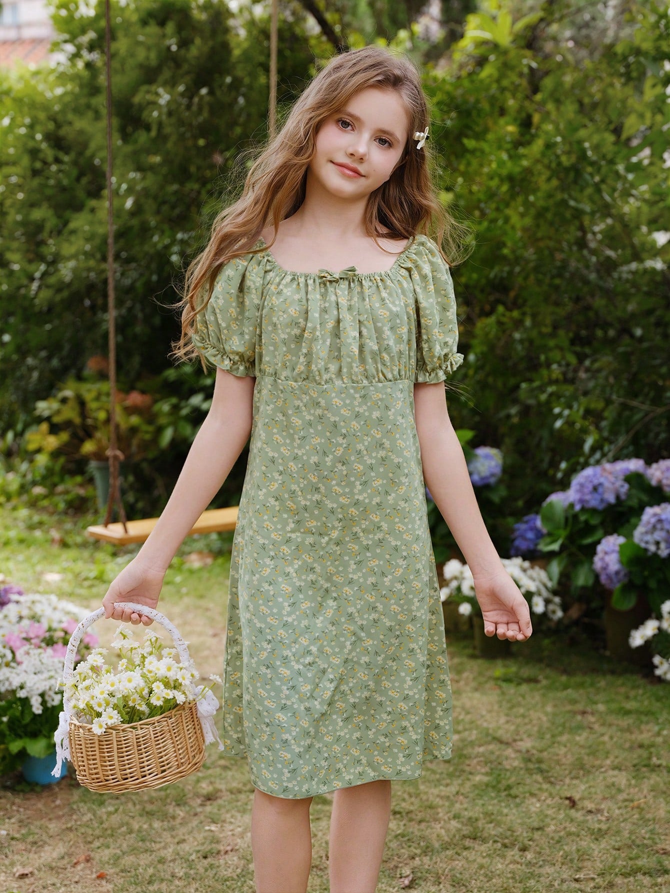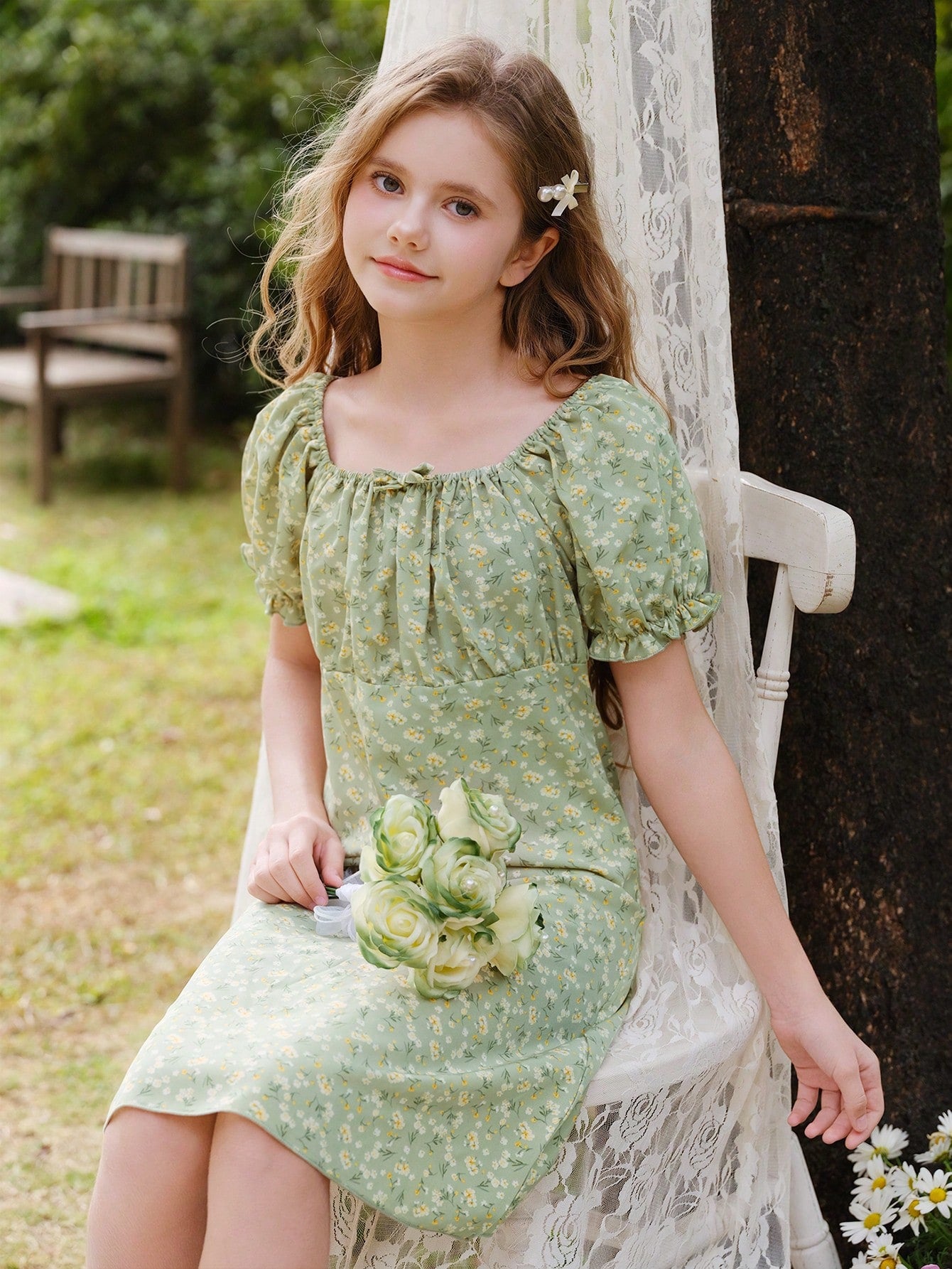 فستان أخضر أنيق مزين بطبعة زهور للفتيات الصغيرات - فستان أخضر أنيق وجميل بأكمام منفوخة وفيونكة
