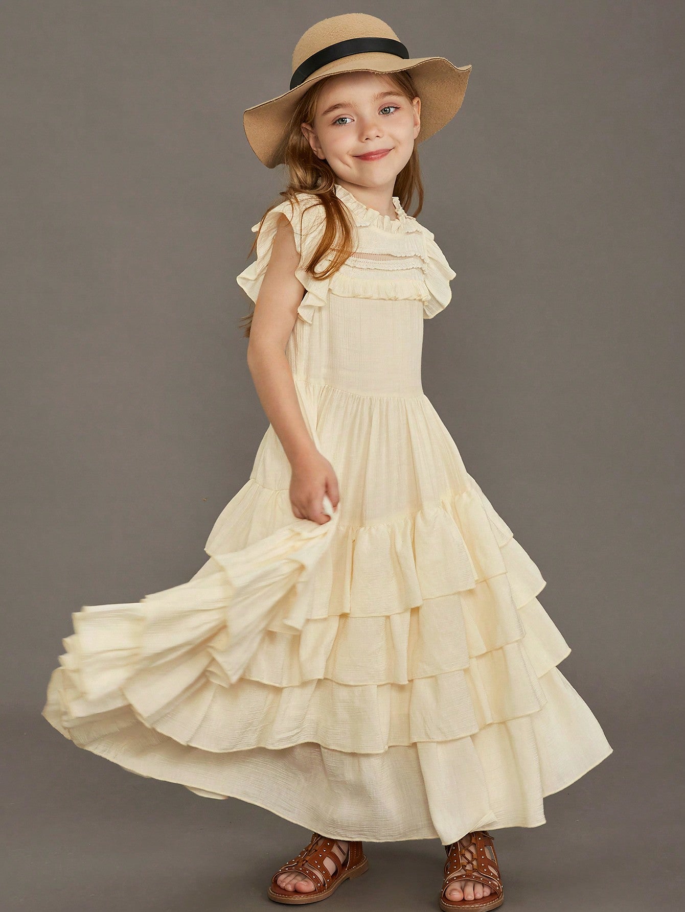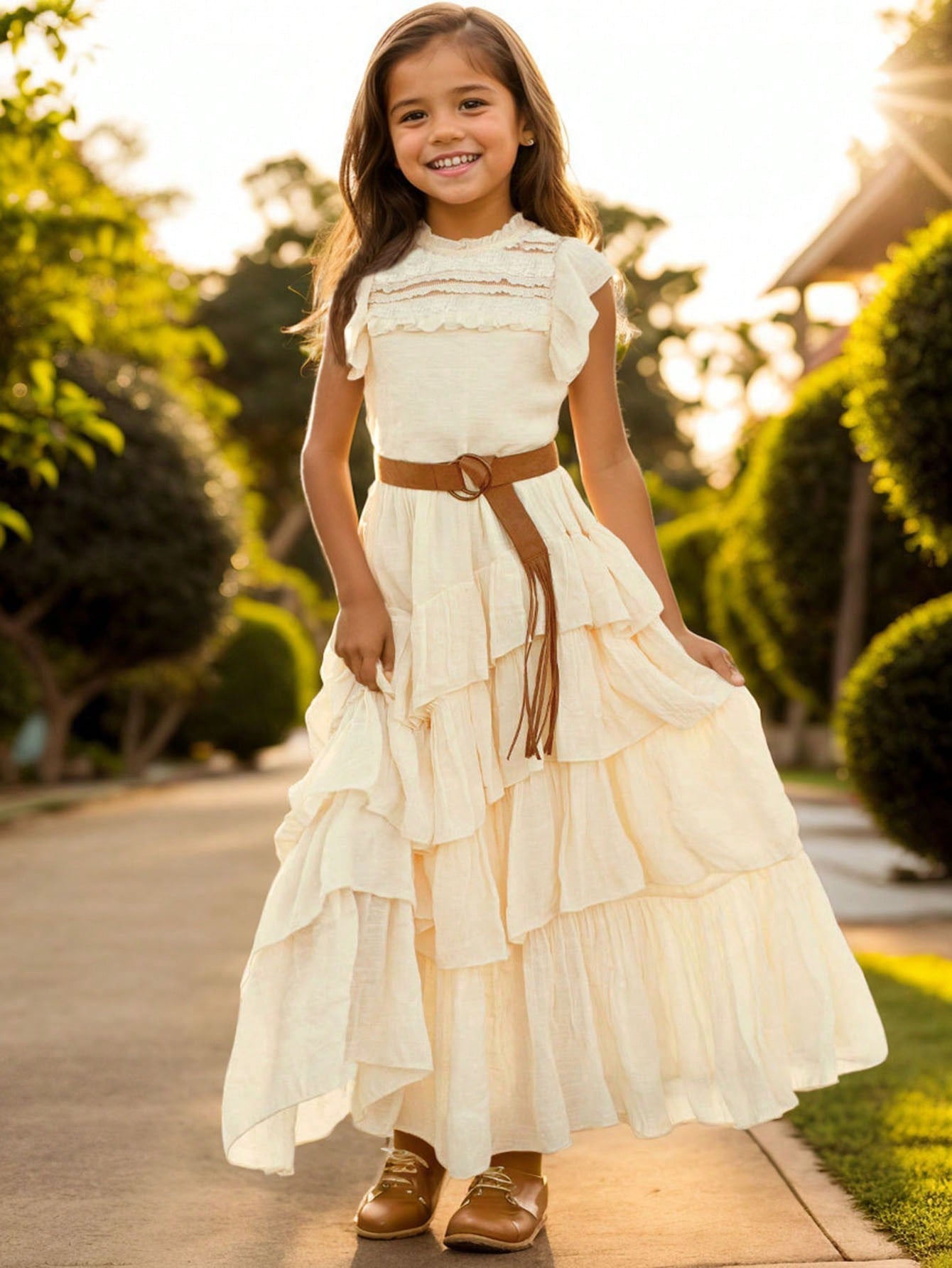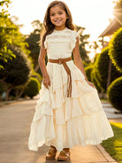 Tween Girl Lace Bodice Fluttering Sleeve Dress With Full Skirt, Flower Girl Wedding Party Gown