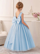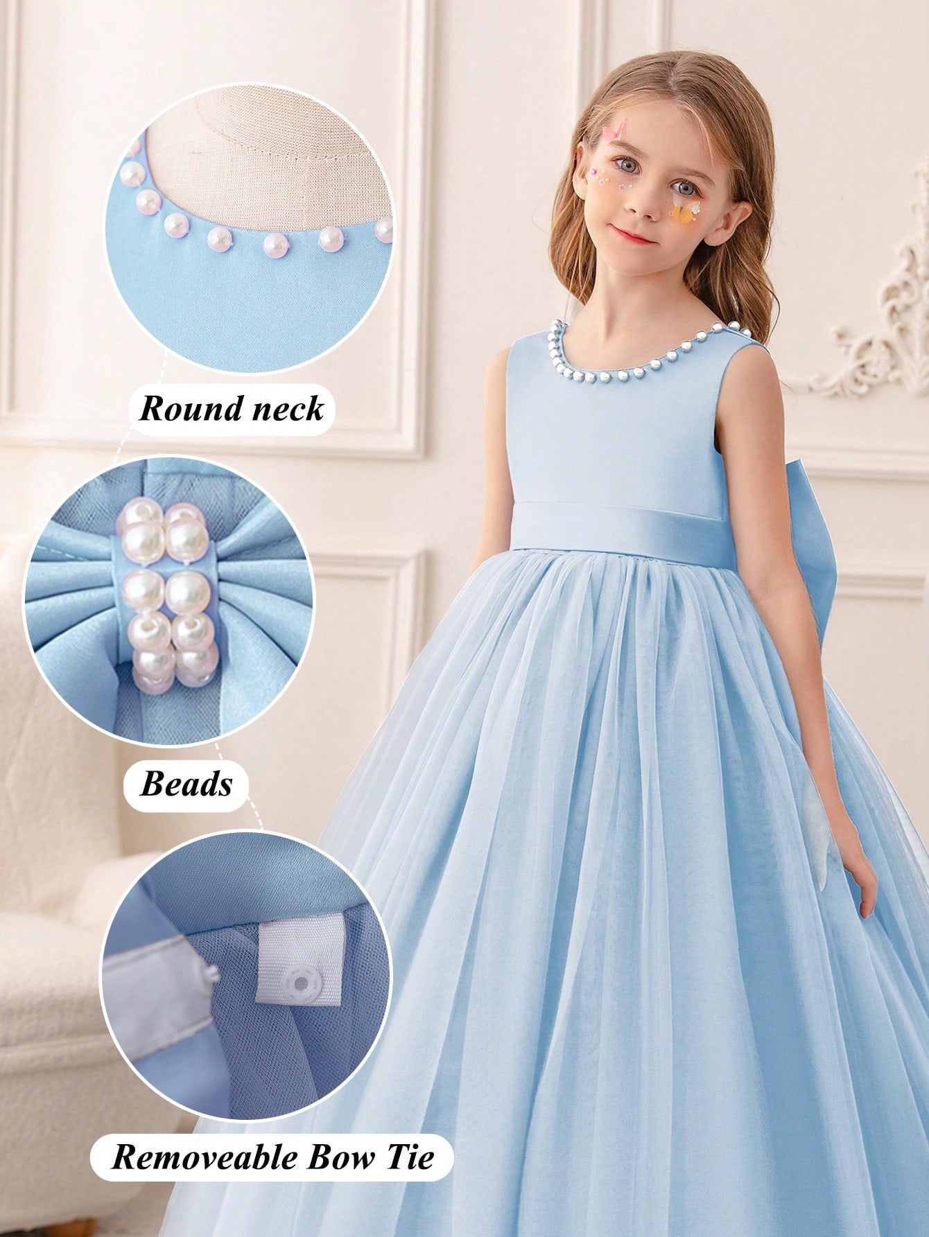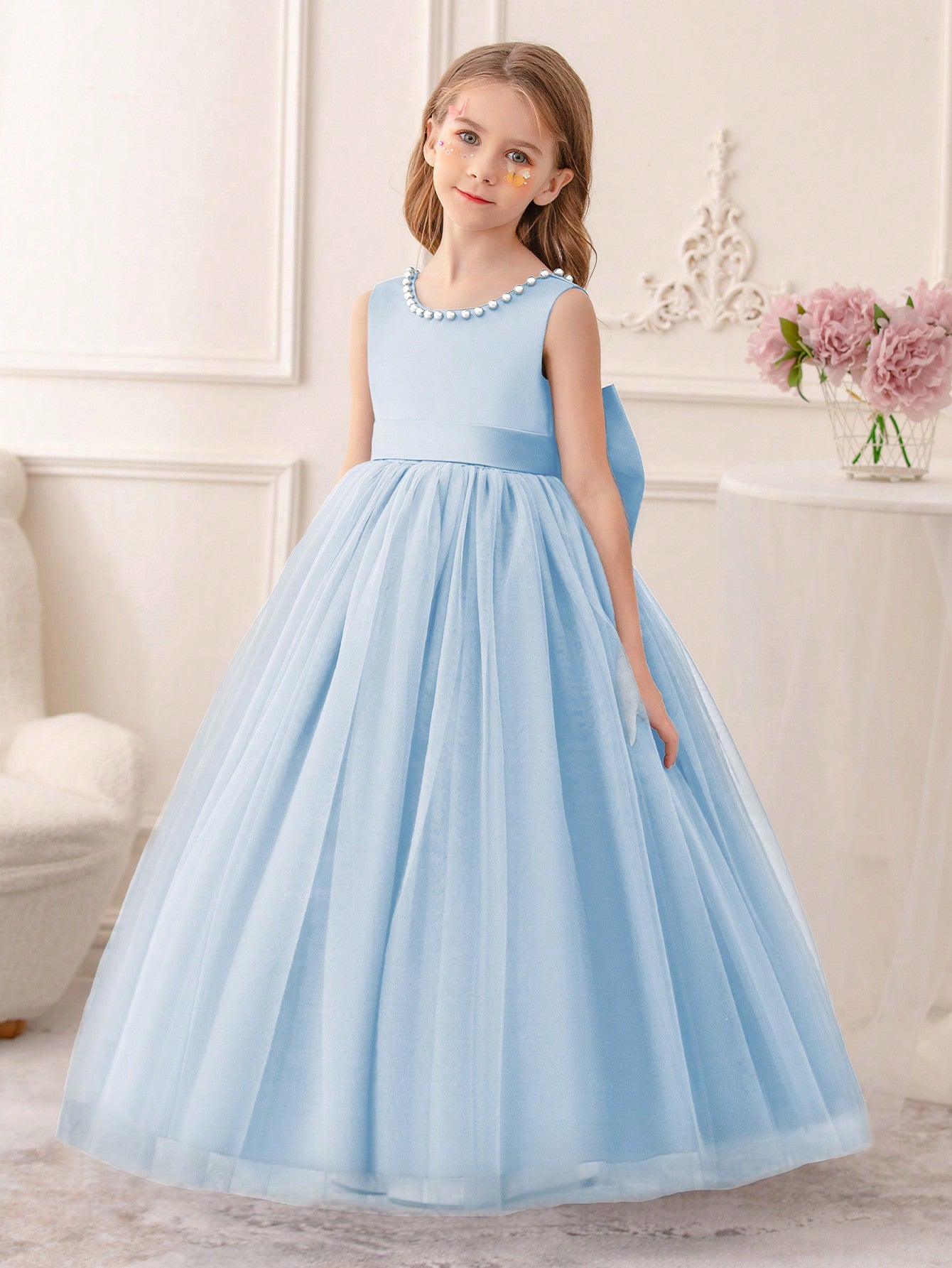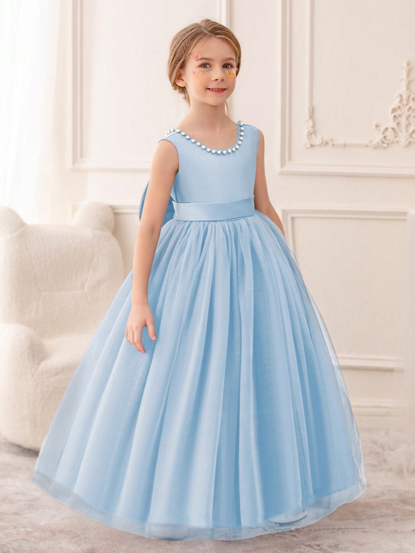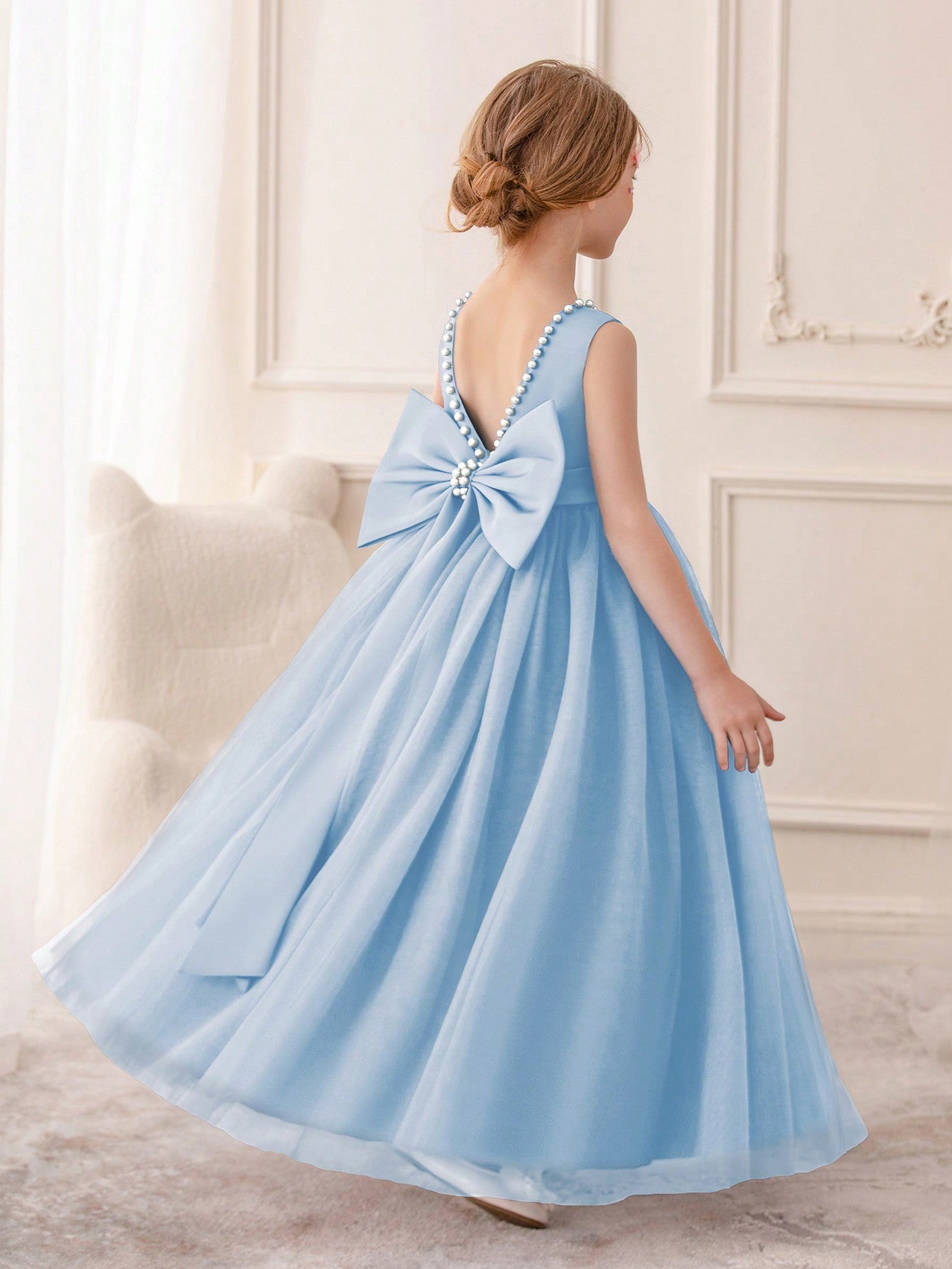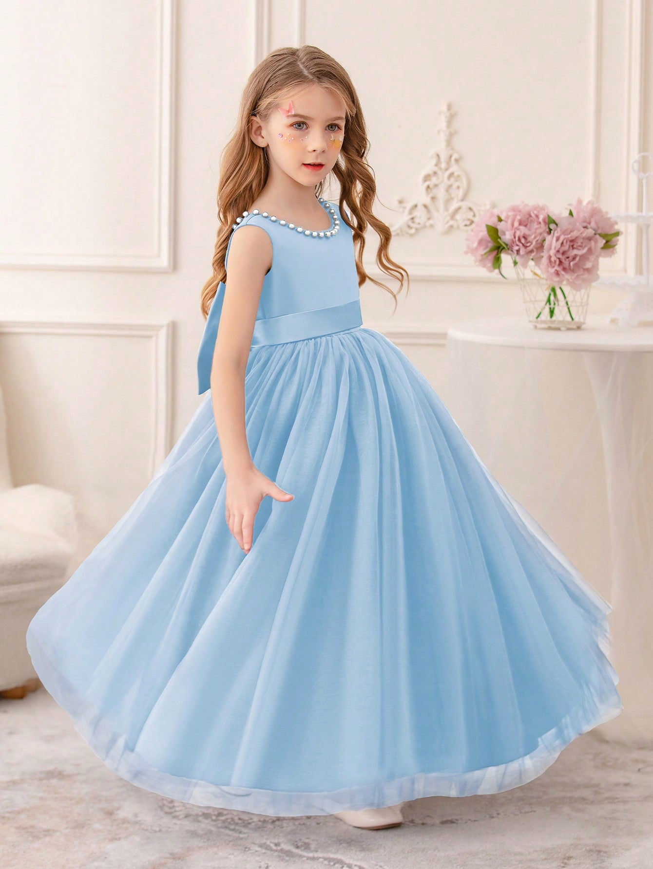 فستان حفلات أزرق فاتح مصنوع يدويًا مزين بفيونكة ثلاثية الأبعاد من الخرز، مناسب للفتيات المراهقات