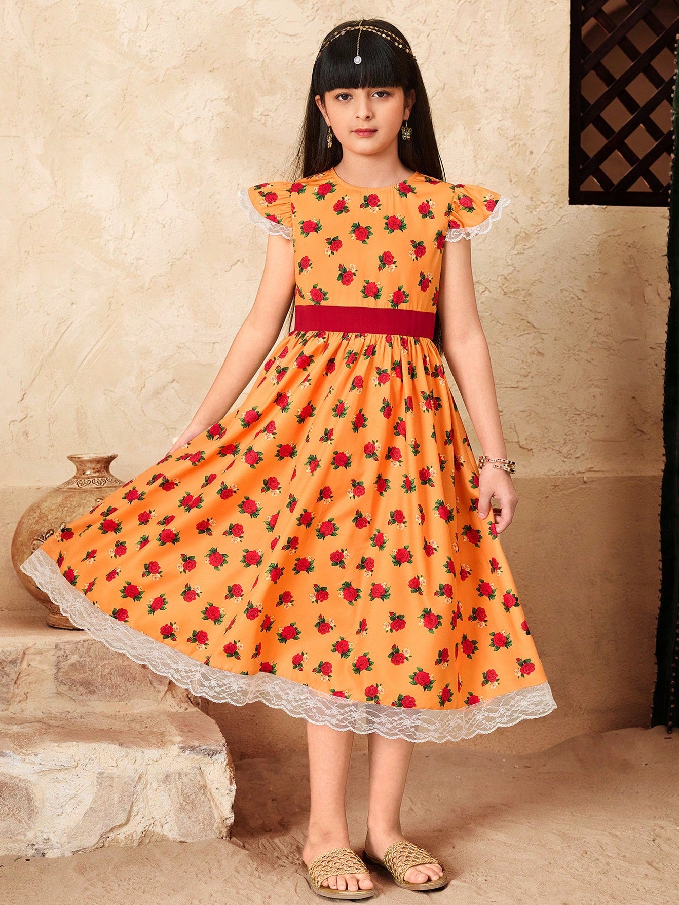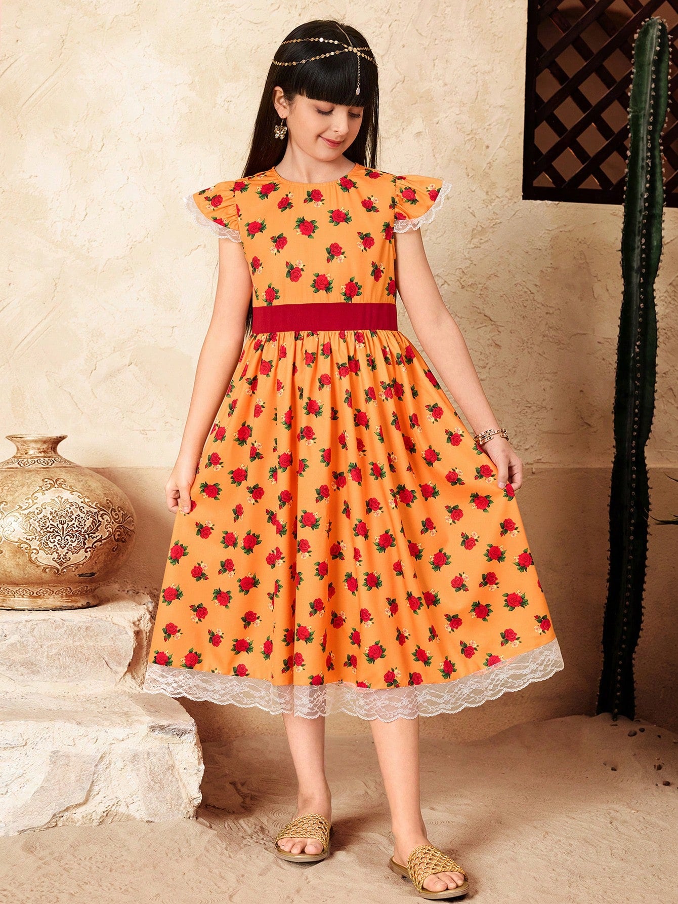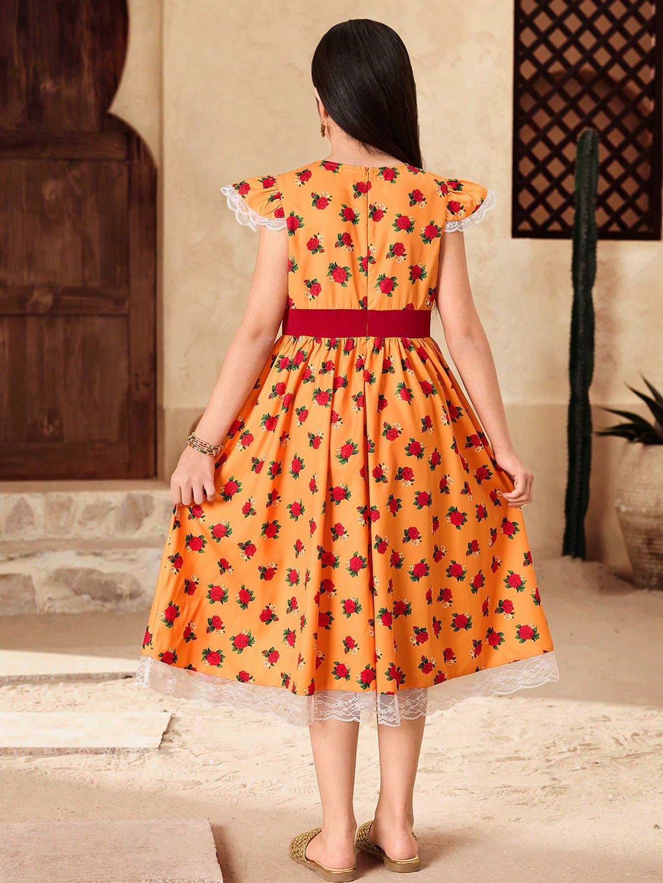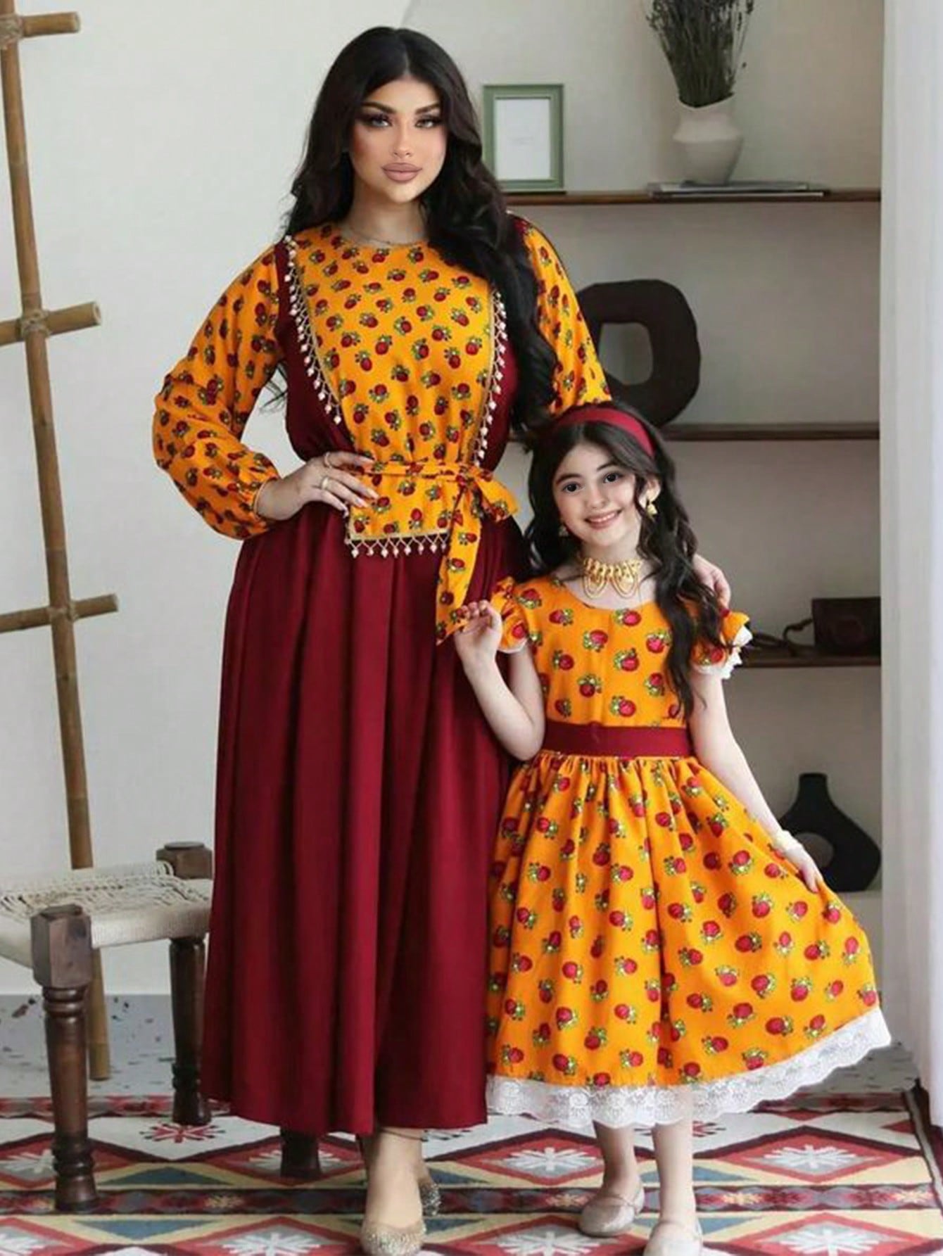 Tween Girl Ramandan Style Matching Family Vacation Casual Short Sleeve National Floral Print Dress
