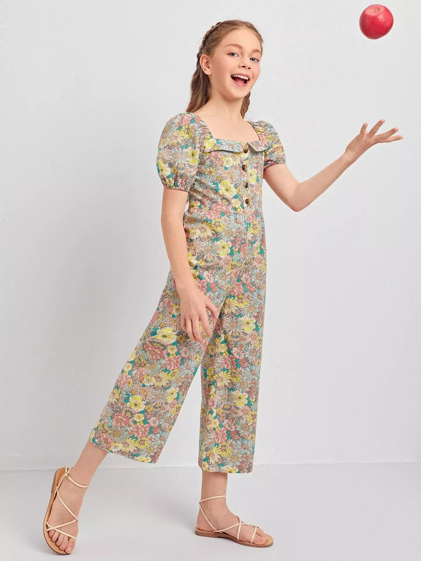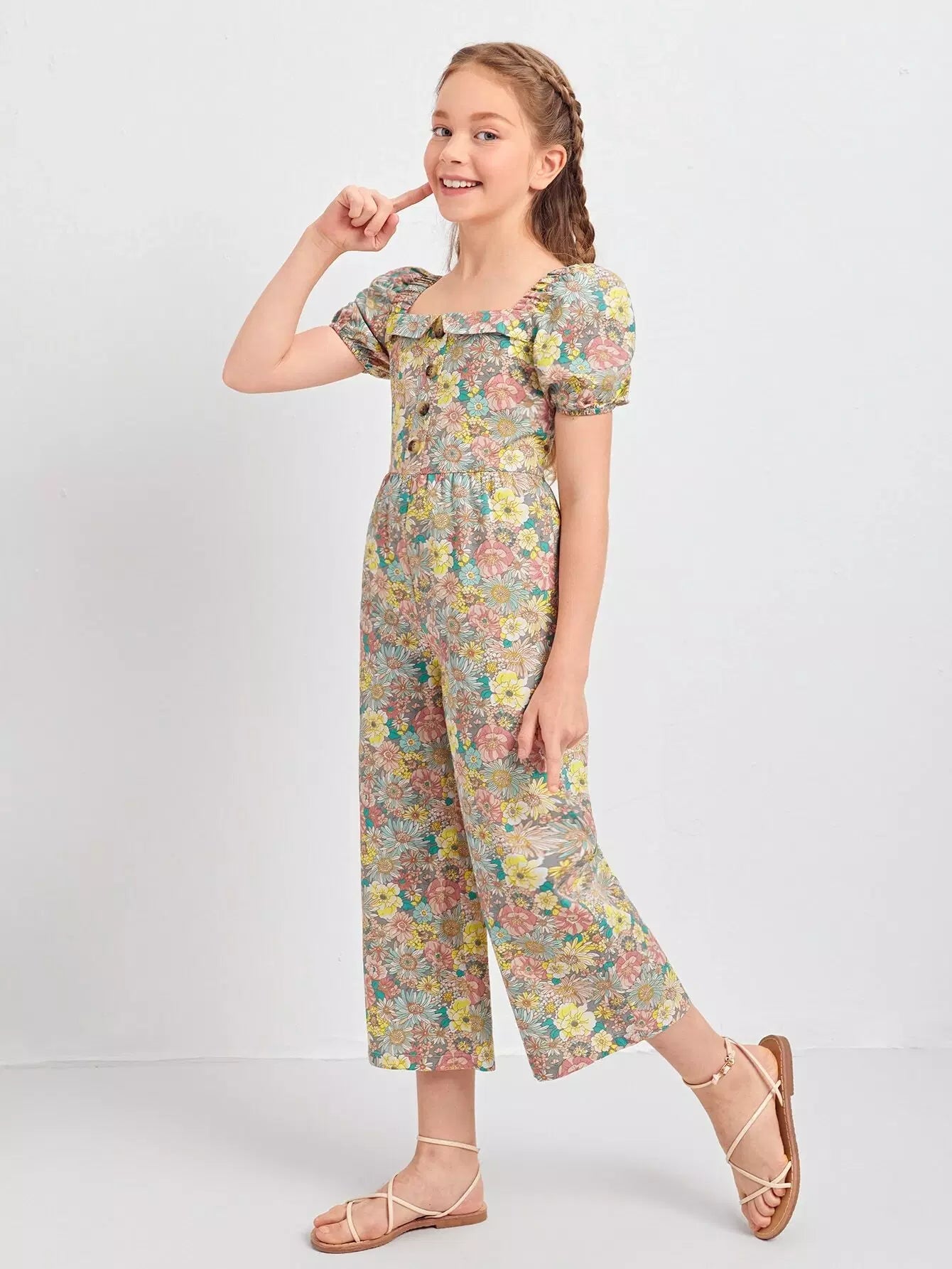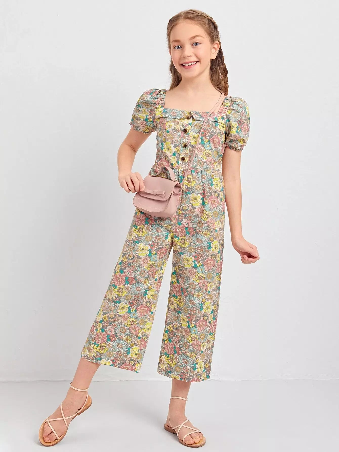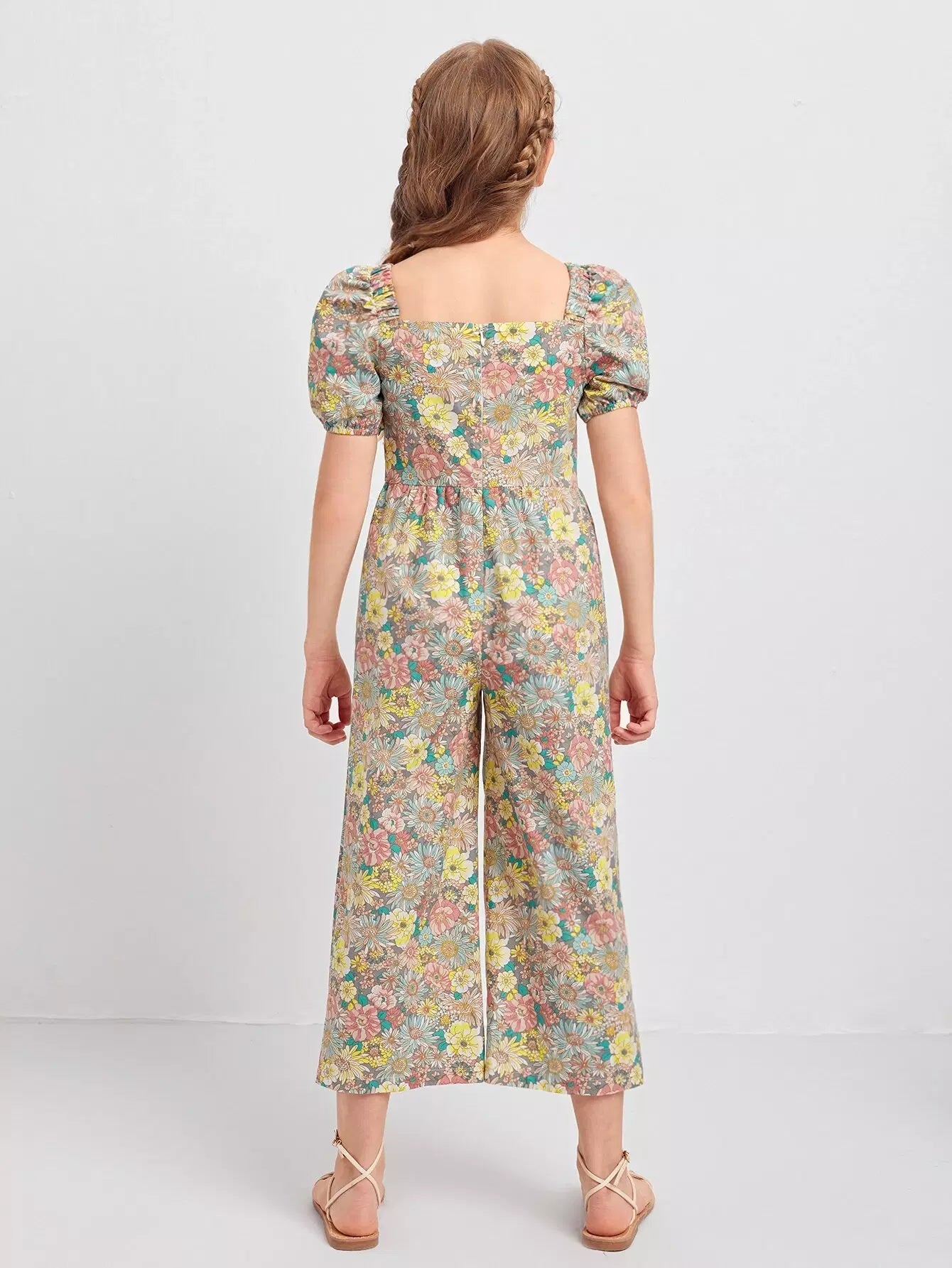 جمبسوت بناتي برقبة مربعة بأكمام منفوشة بنقشة زهور