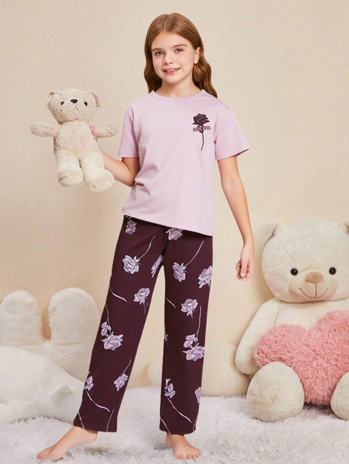 kids 2pcs Tween Girls Avocado Pattern Round Neck Short Sleeve Top And Pants Comfortable Home Outfit
