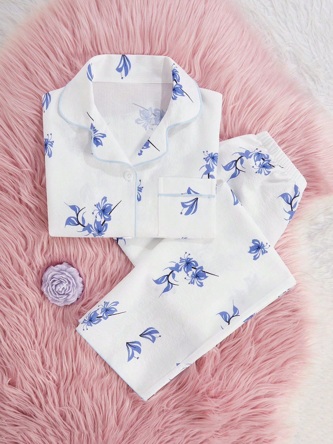 طقم بيجامة للبنات - بلوزة شيفون ناعمة ومريحة بأكمام طويلة وبنطلون، مطبوع عليها زهور زرقاء وجيوب، مناسب