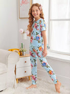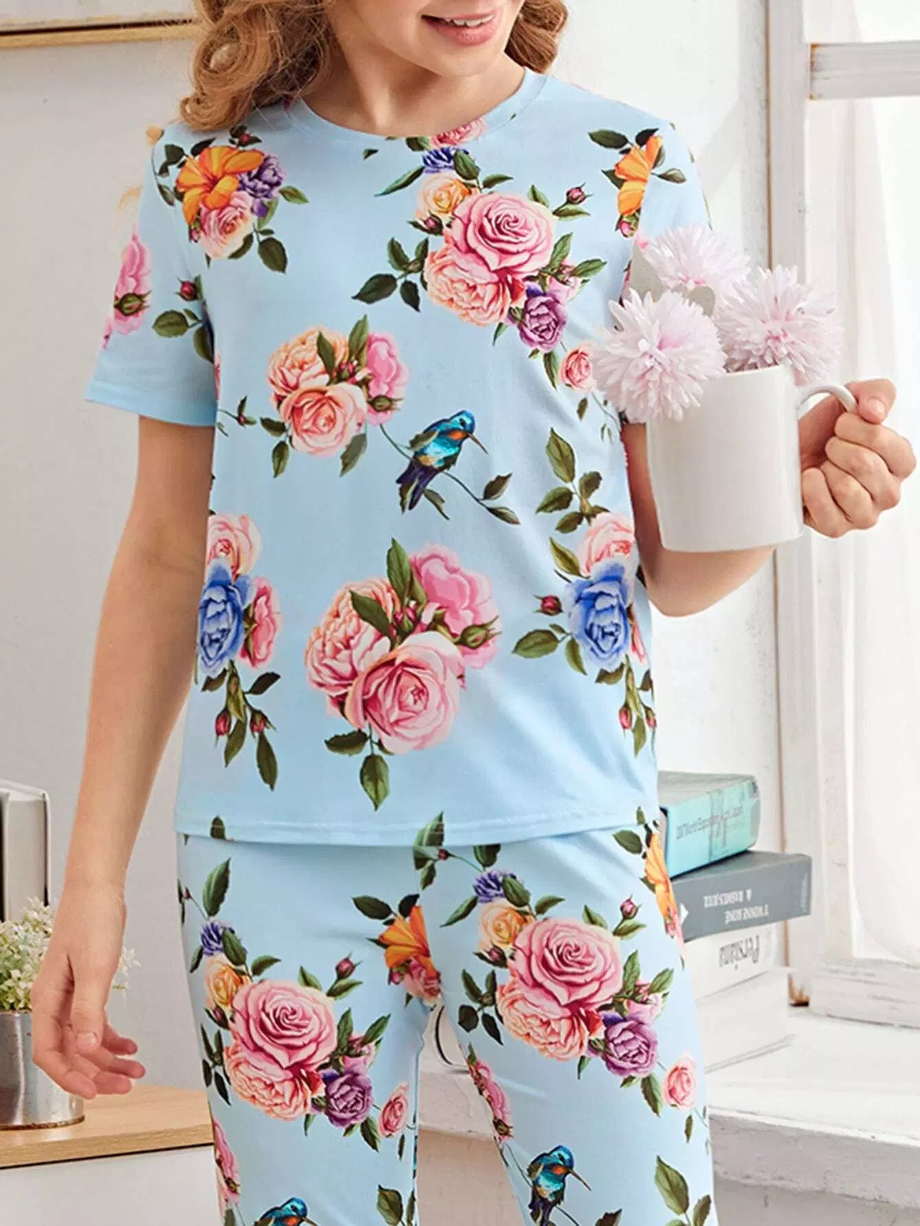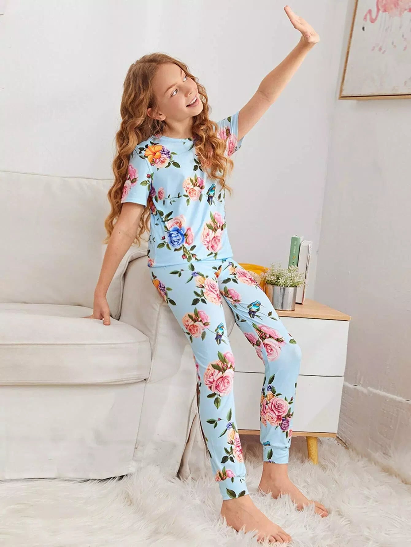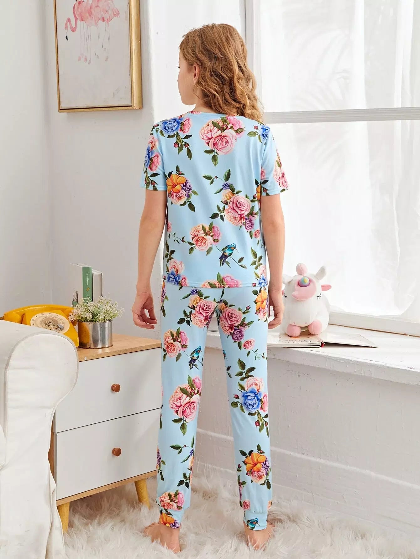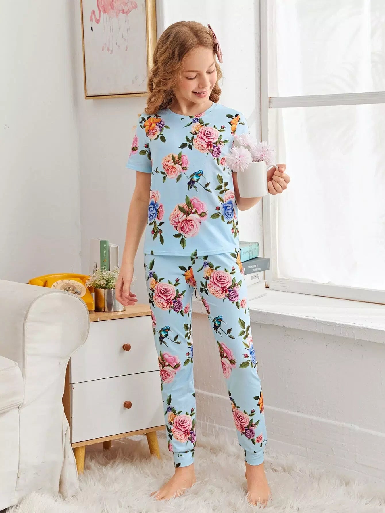 طقم بيجامة للبنات من توب وبنطلون بطبعات طيور وأزهار