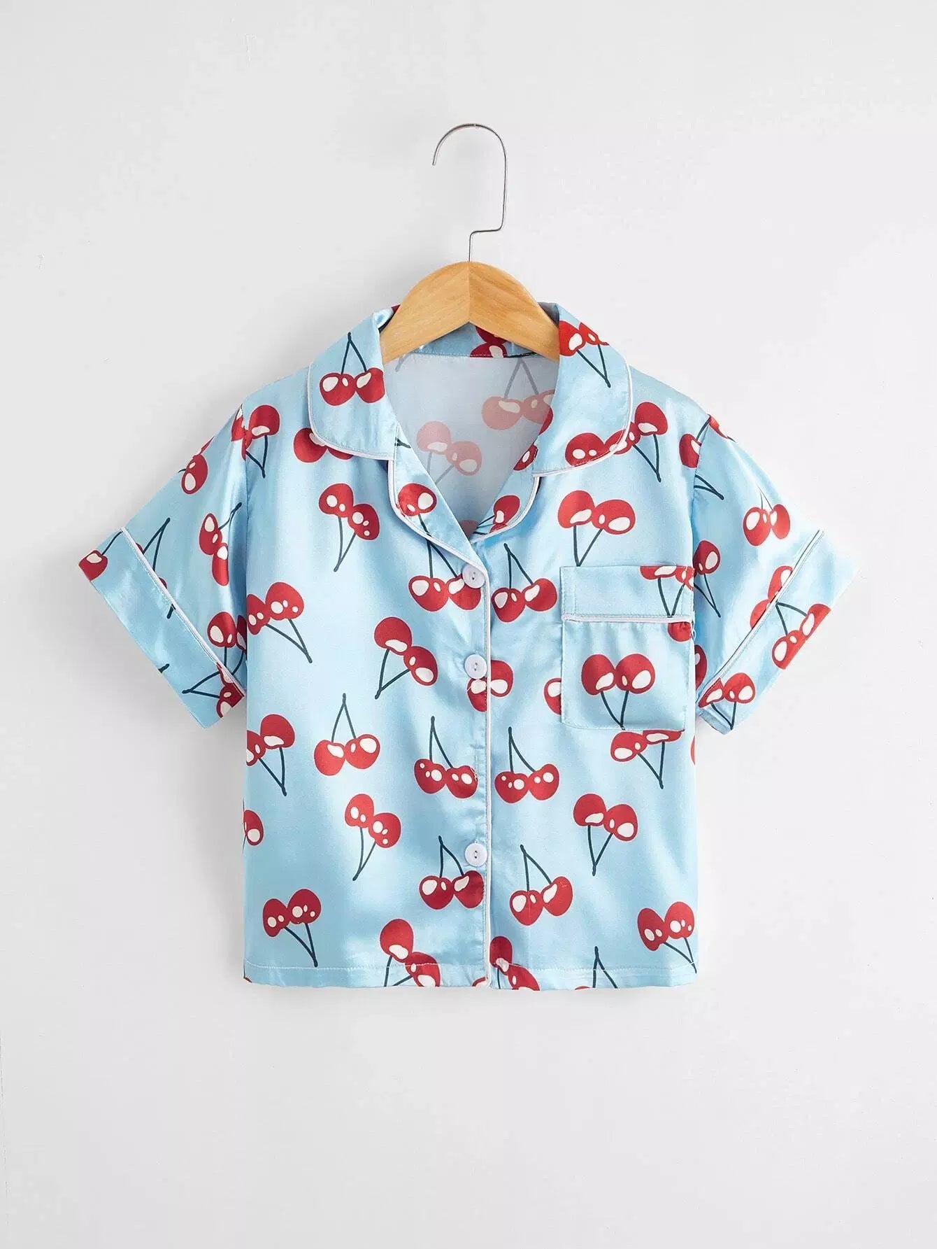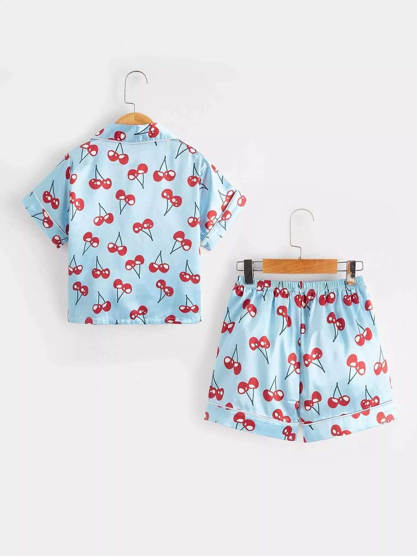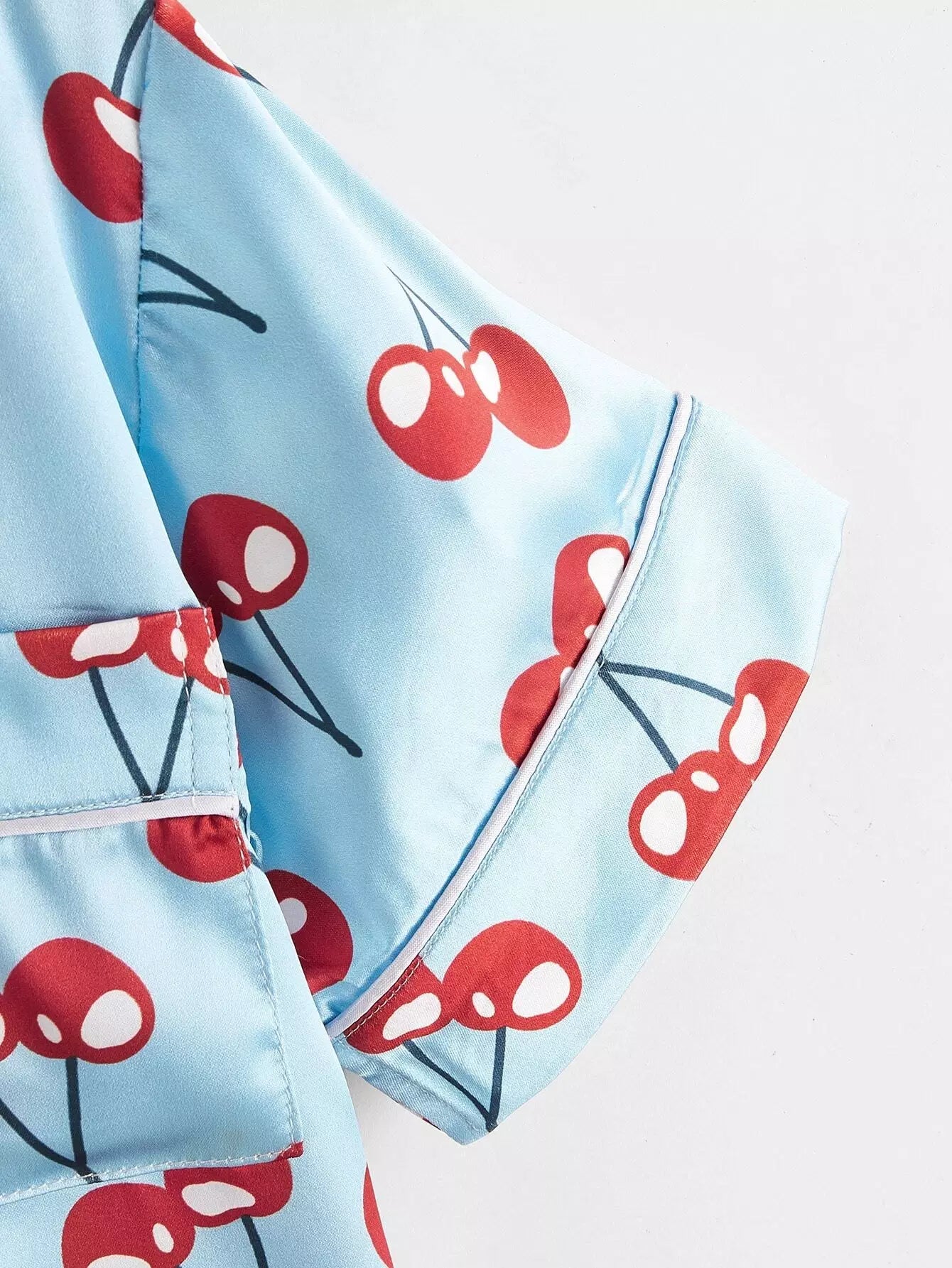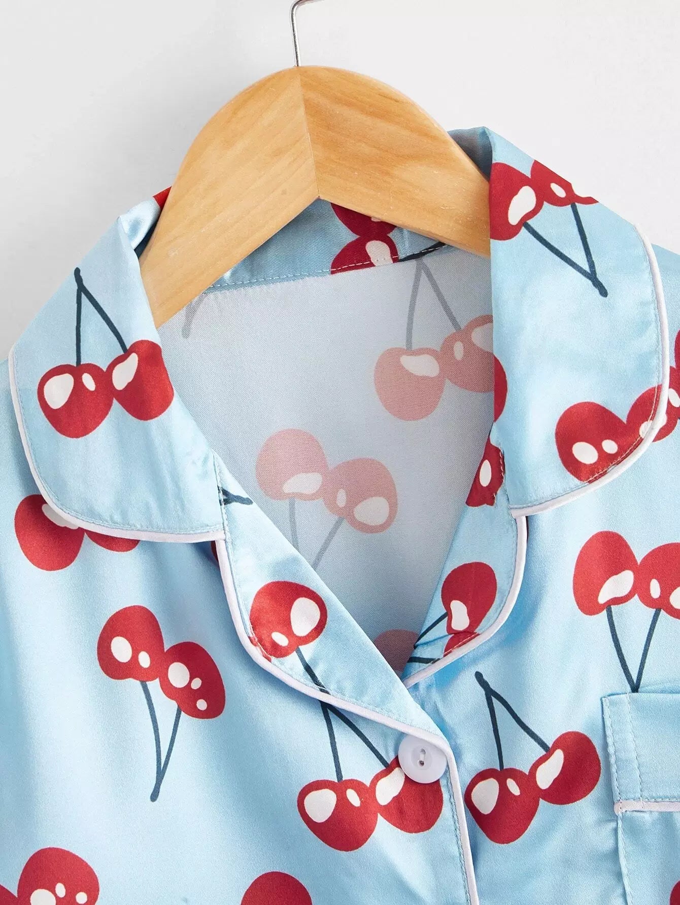 طقم بيجامة ساتان أمامي من الساتان بطبعة كرز للبنات بياقة على الرقبة وجيب أمامي