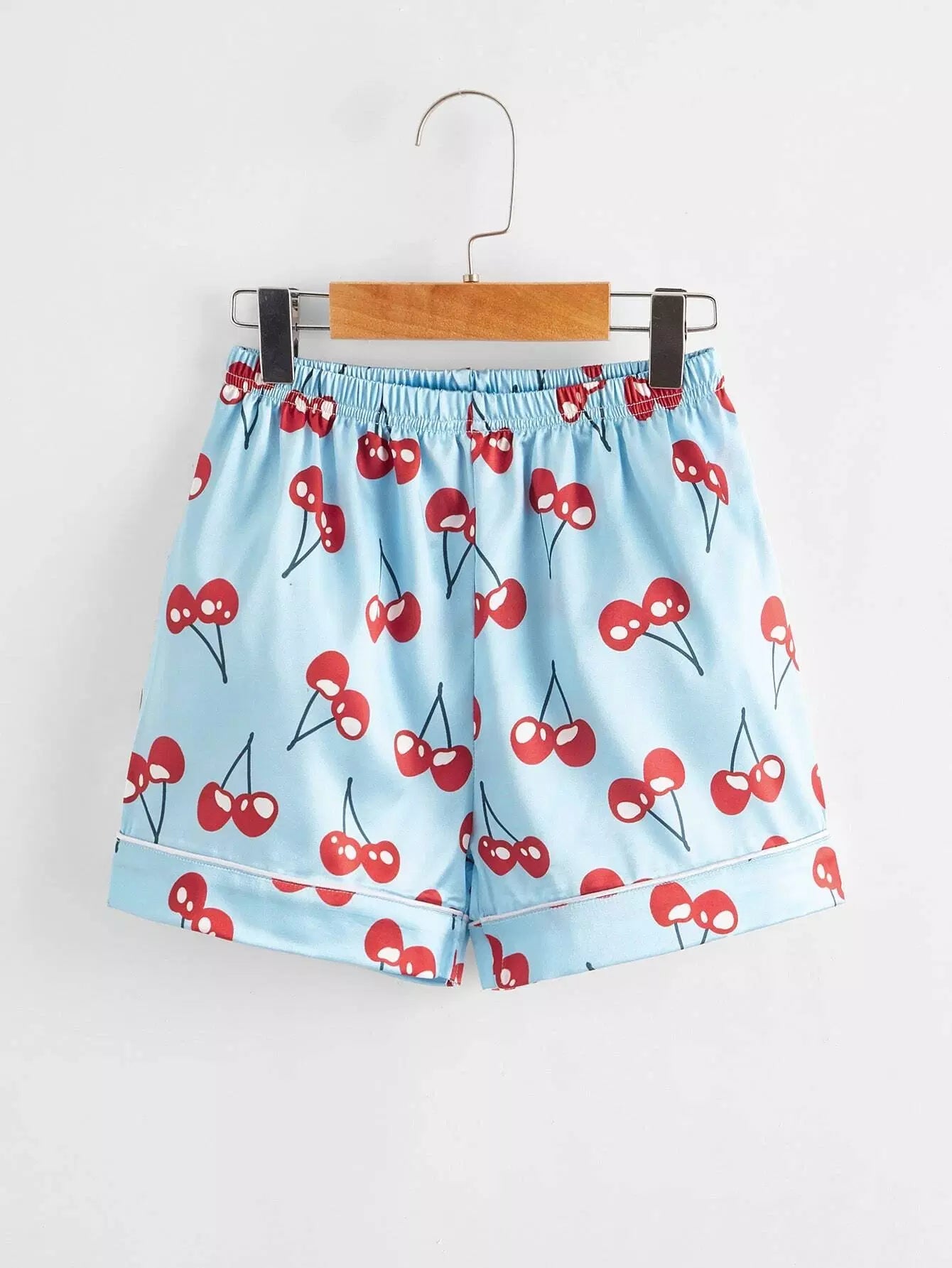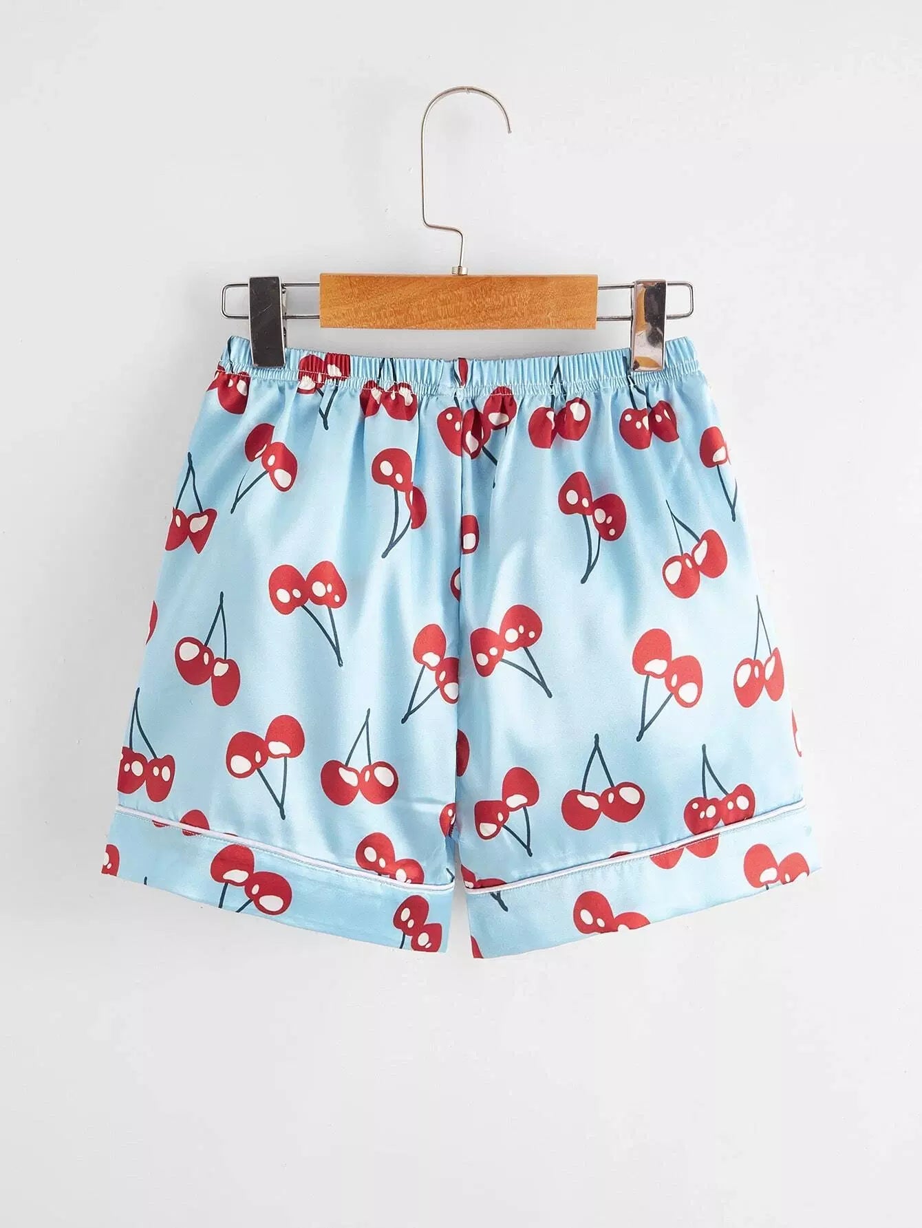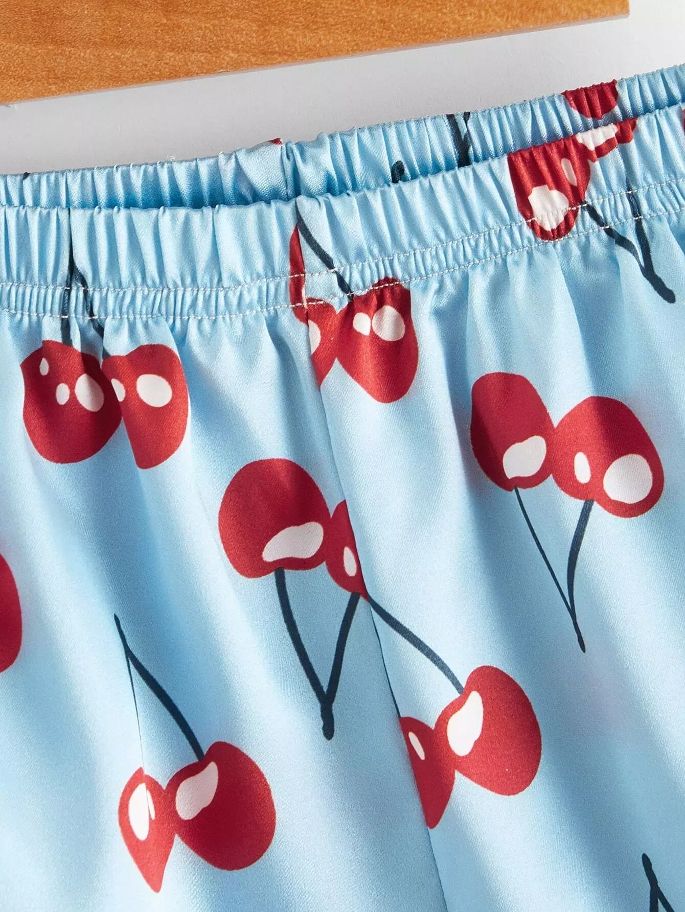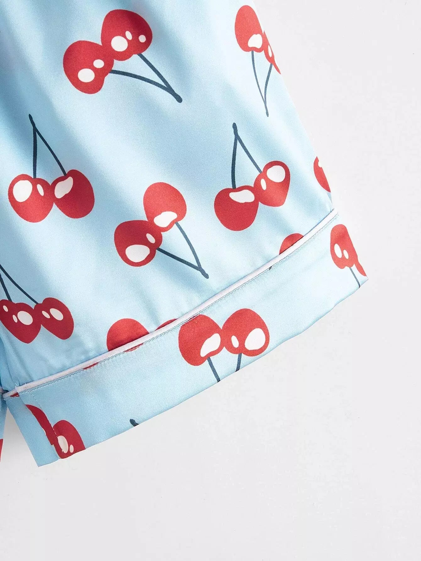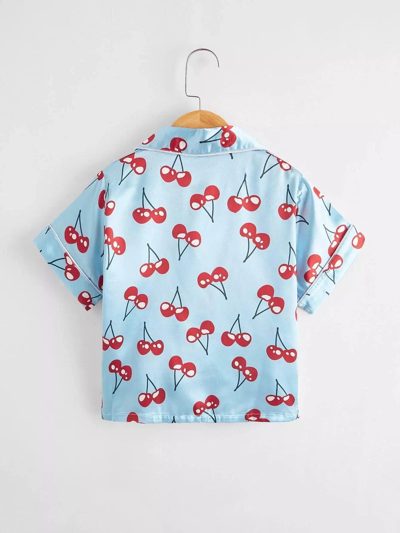 طقم بيجامة ساتان أمامي من الساتان بطبعة كرز للبنات بياقة على الرقبة وجيب أمامي