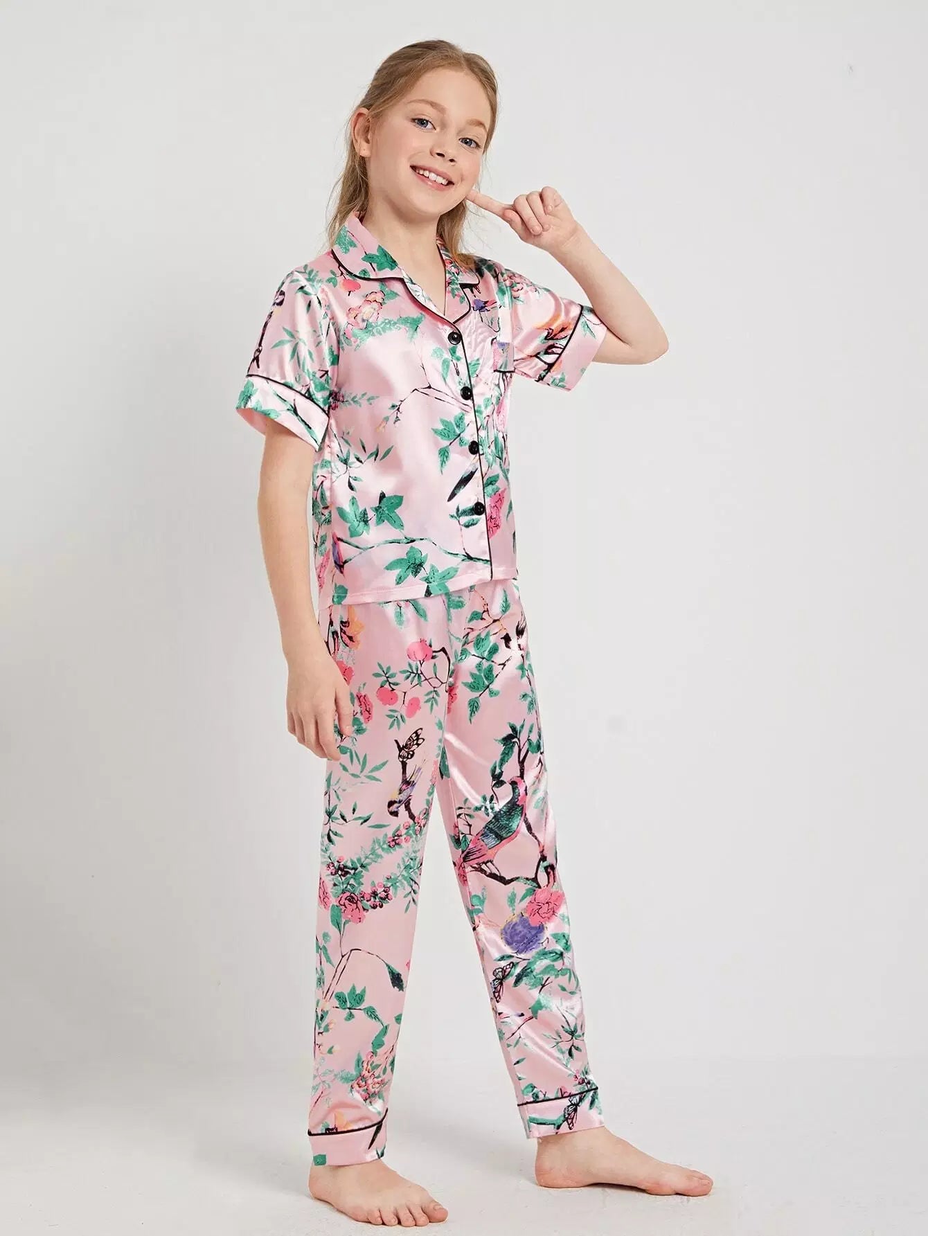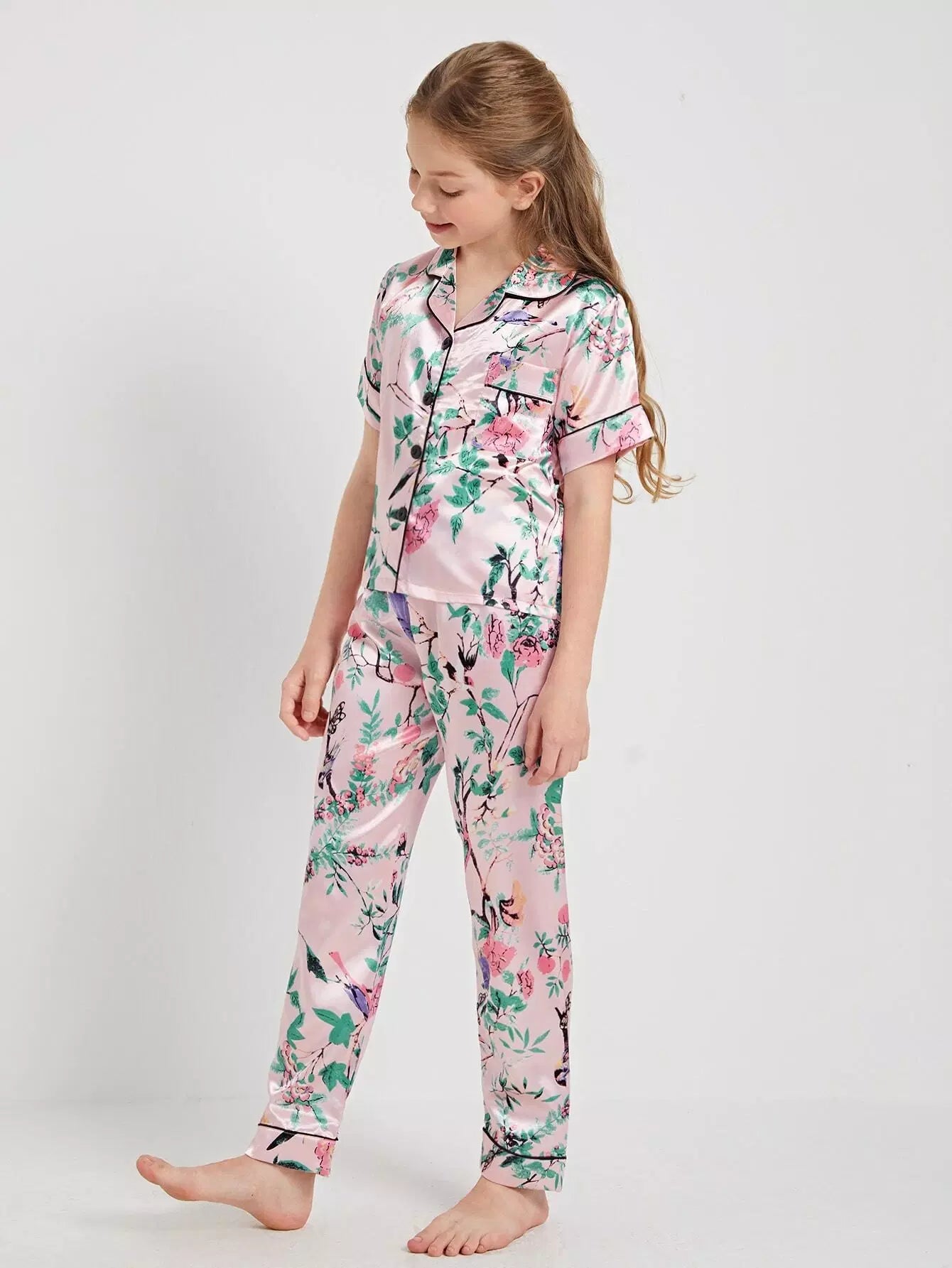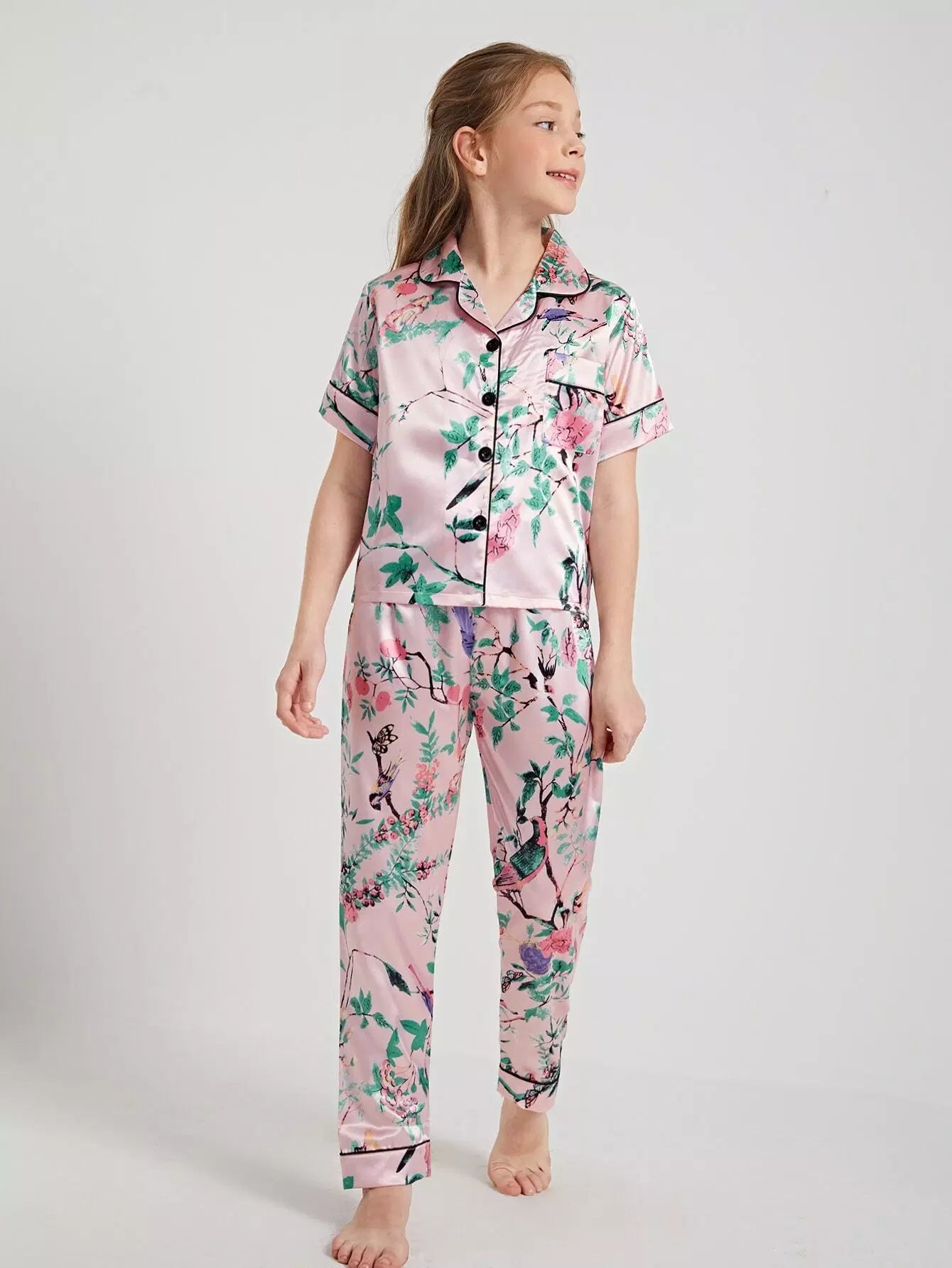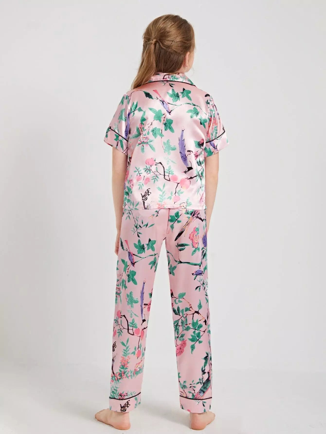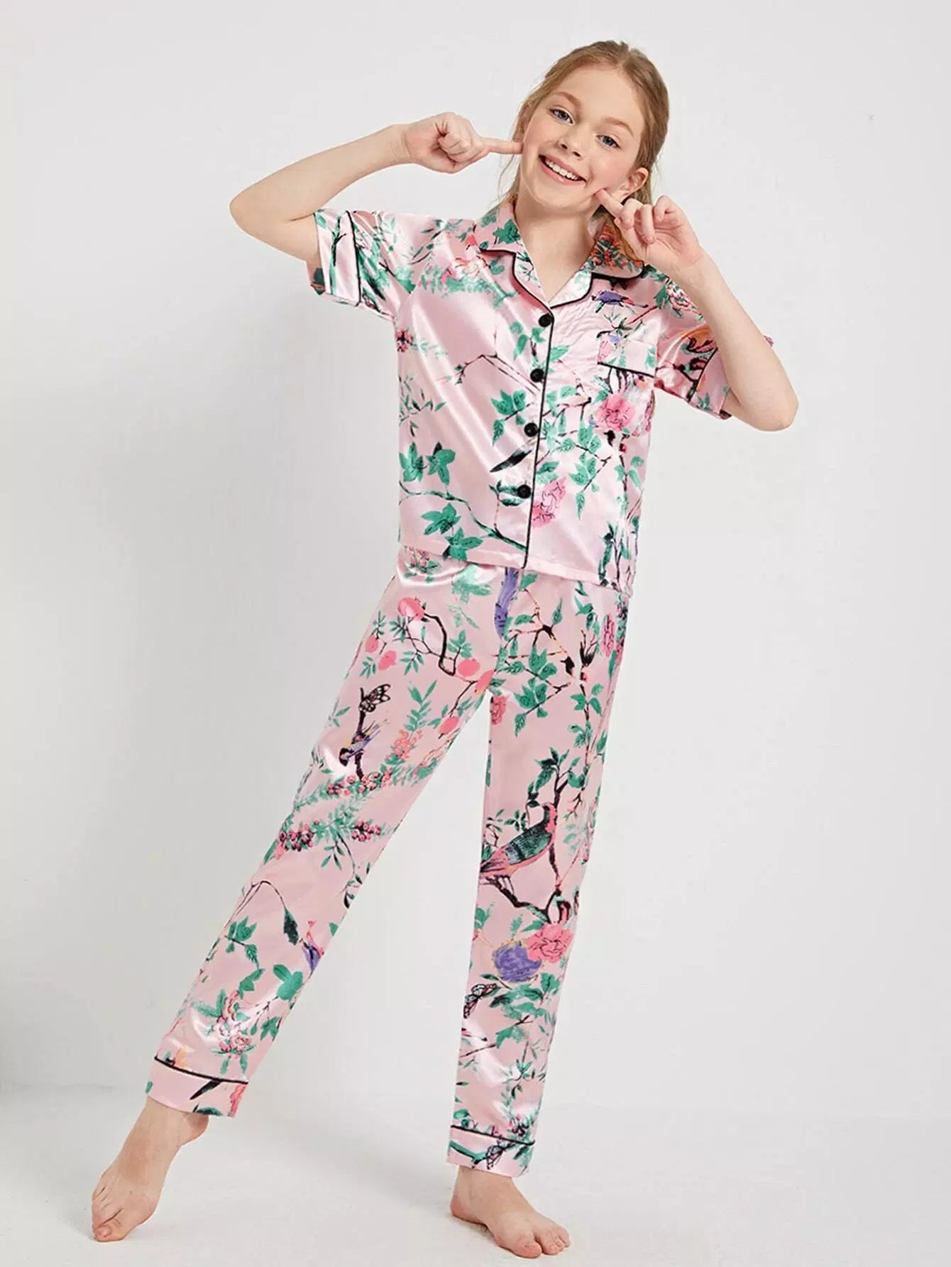 طقم بيجامة ساتان أمامي من الساتان مطبوع عليه زهور وطيور للبنات بياقة على الرقبة وجيب أمامي