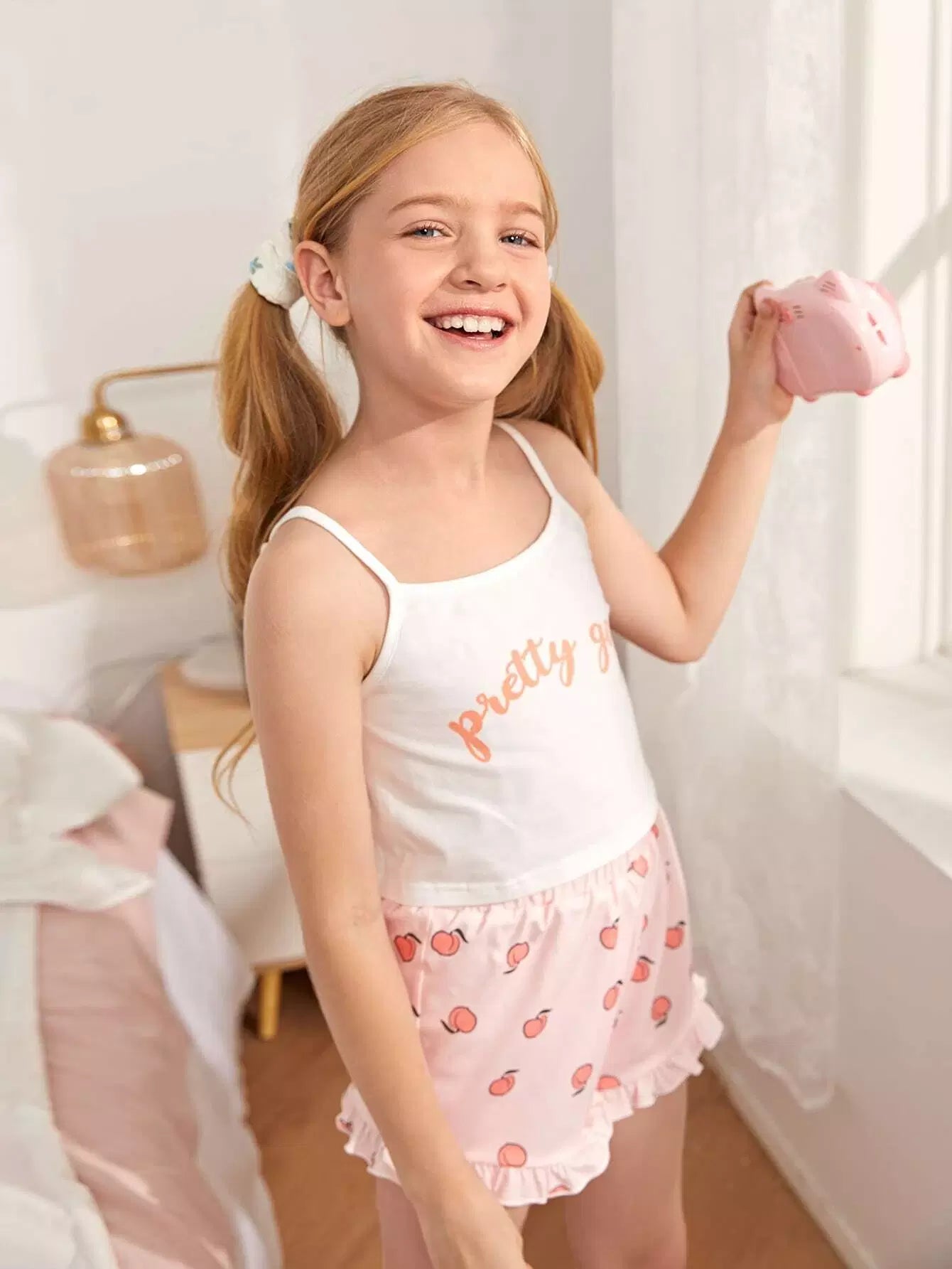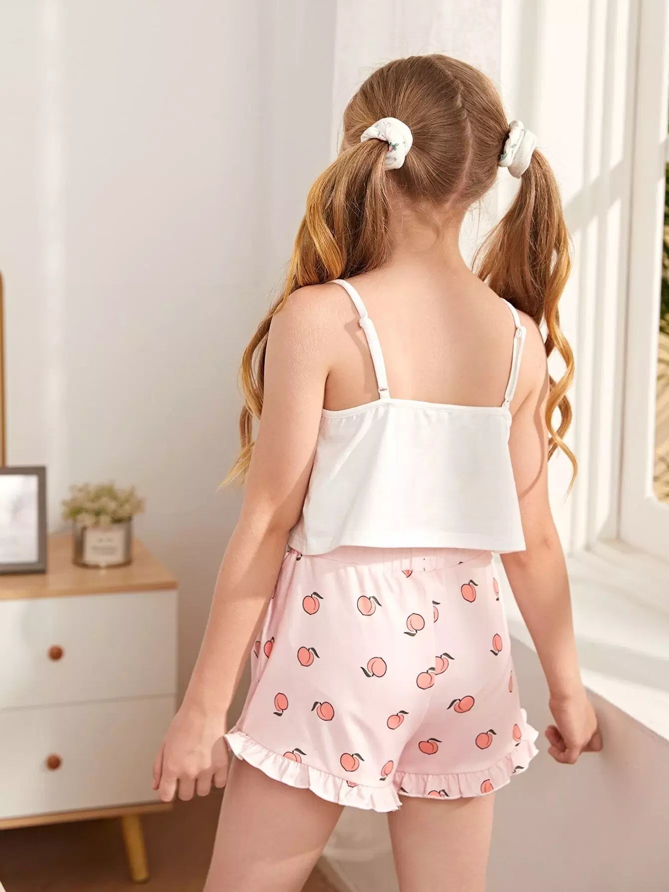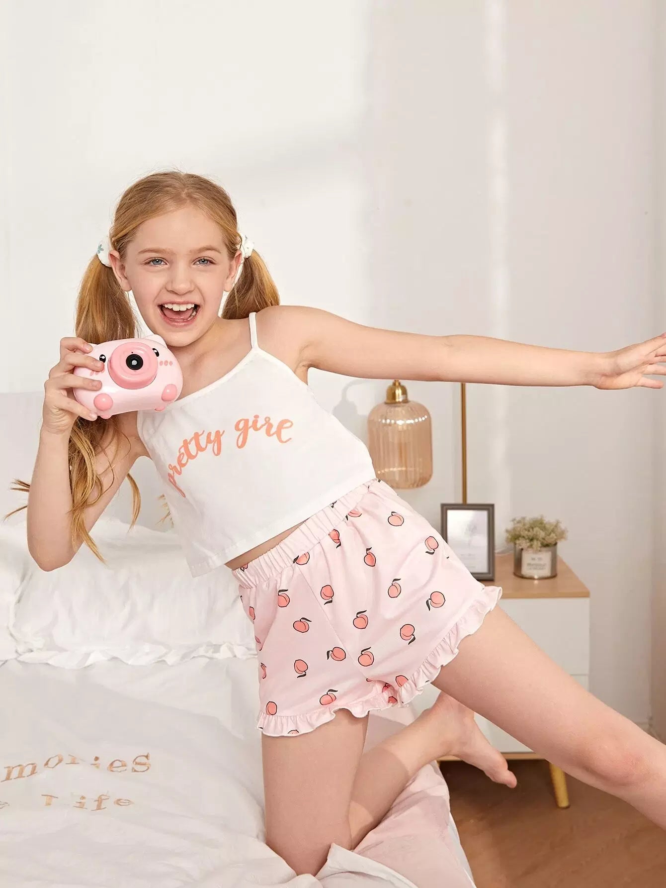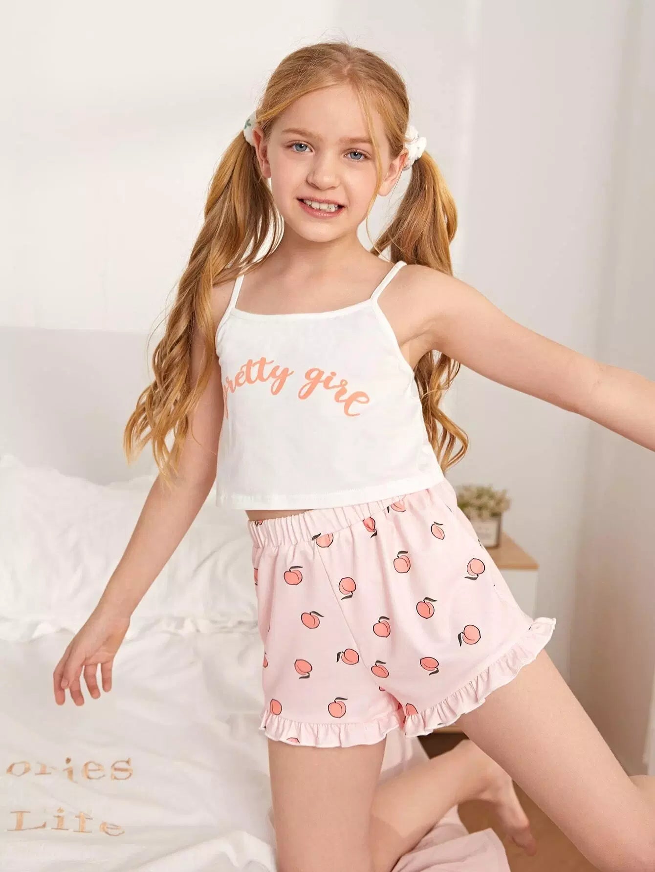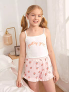 طقم بيجامة للبنات من بلوزة قصيرة بطبعة حروف وشورت بطبعة خوخ