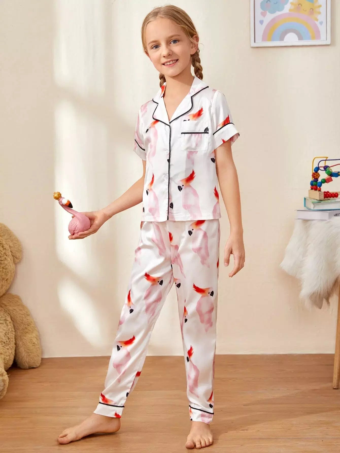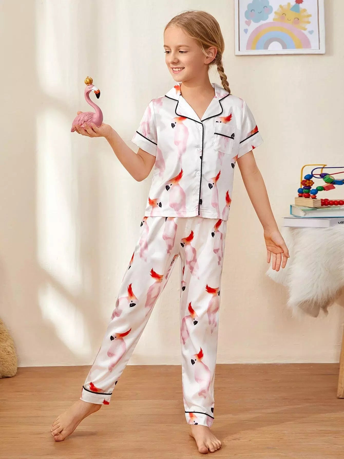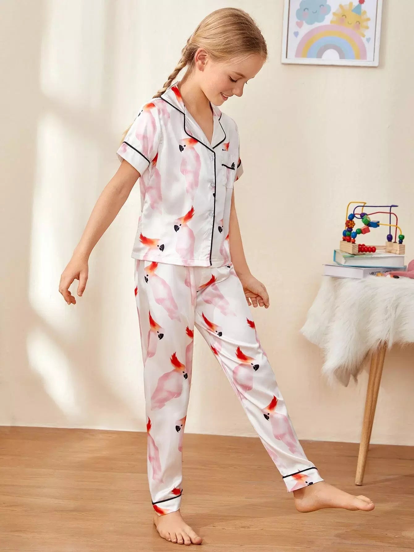 طقم بيجامات بنطلون ساتان بنقشة ببغاء مطبوع عليه بلون مغاير للبنات