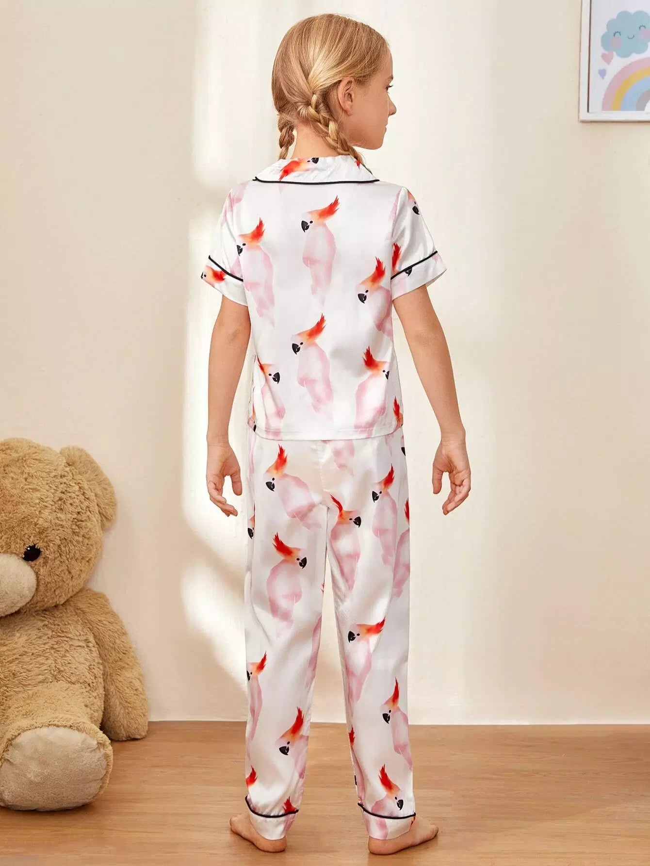 الأطفال - طقم بيجاما بناتي من الساتان المتباين بطبعة الببغاء