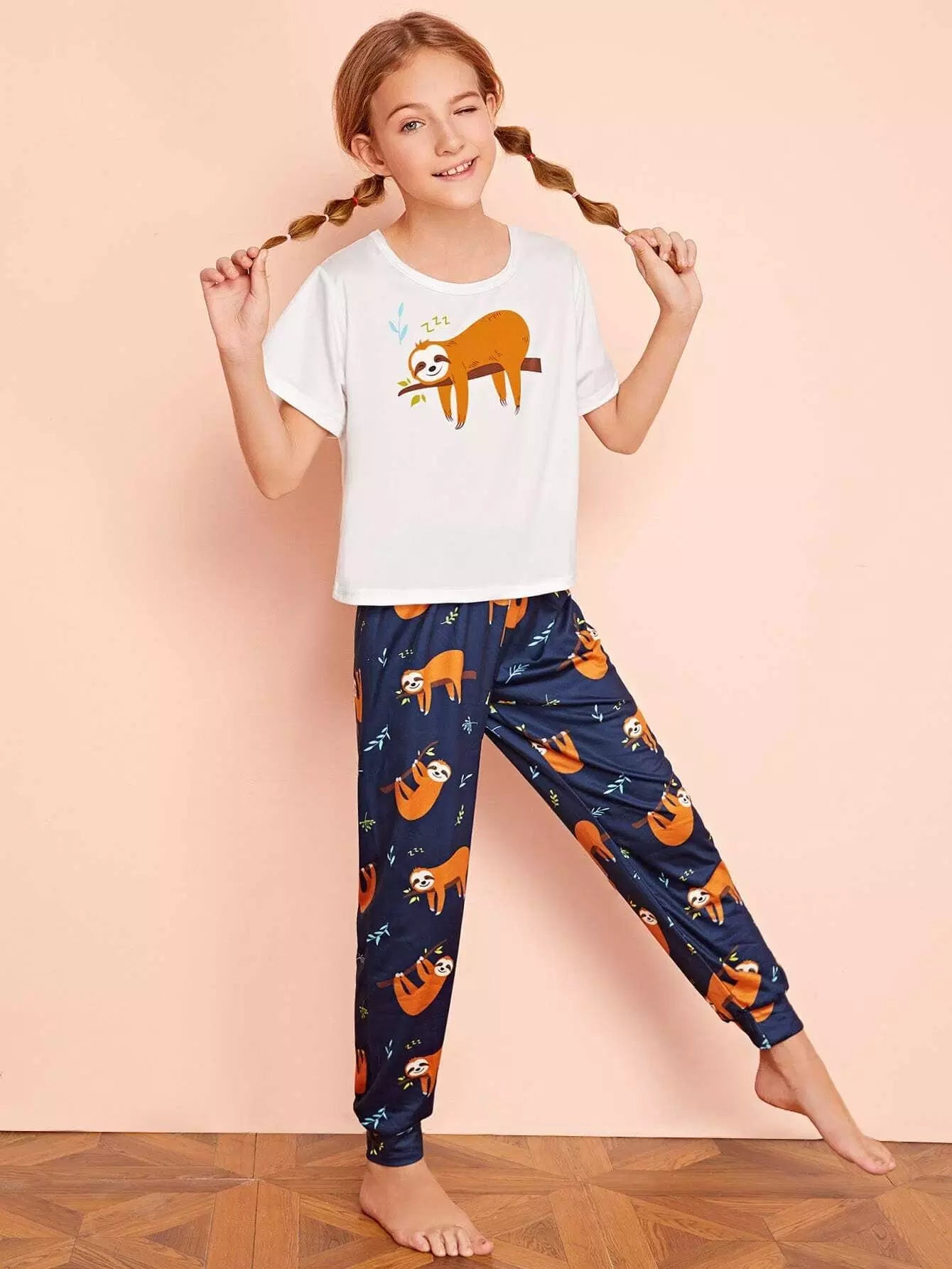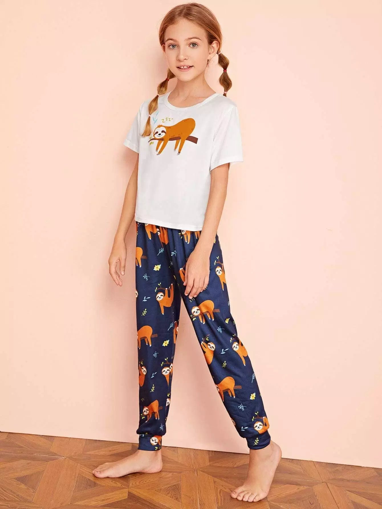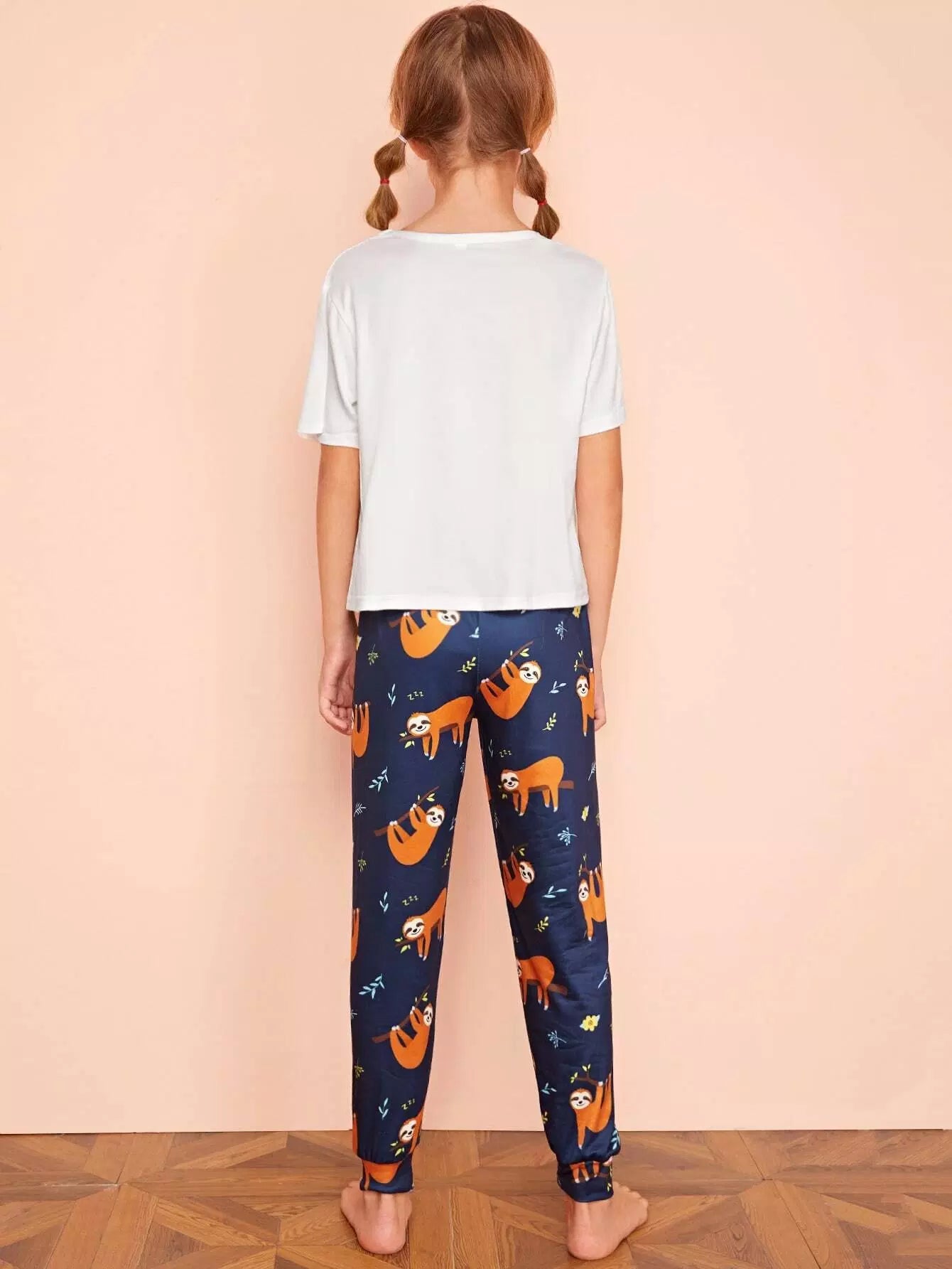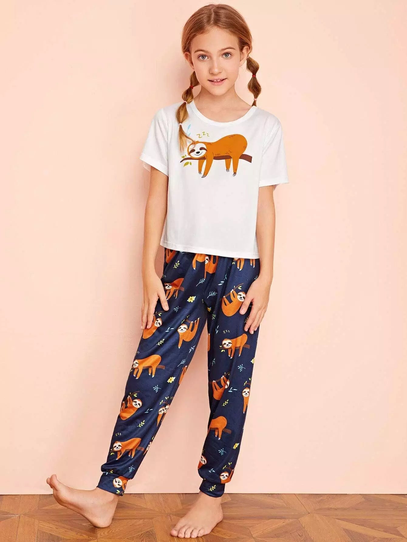 الأطفال - طقم بيجامة بطبعة حيوان الكسلان للفتيات