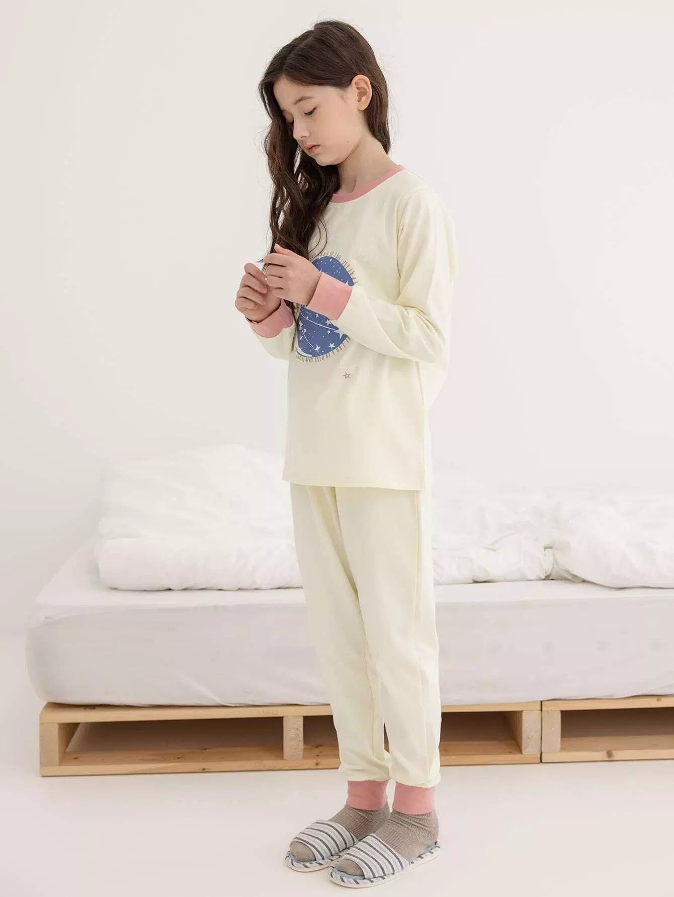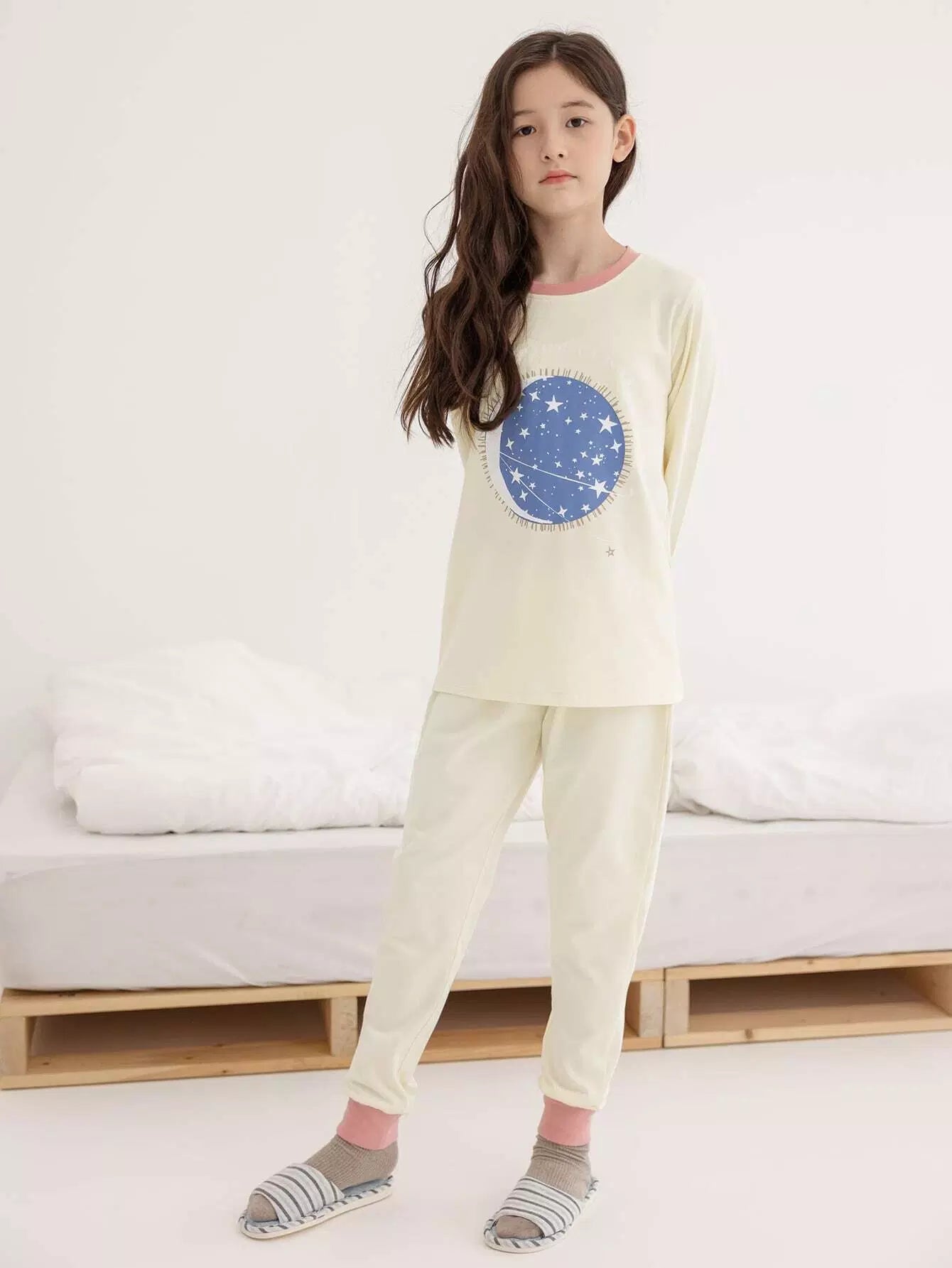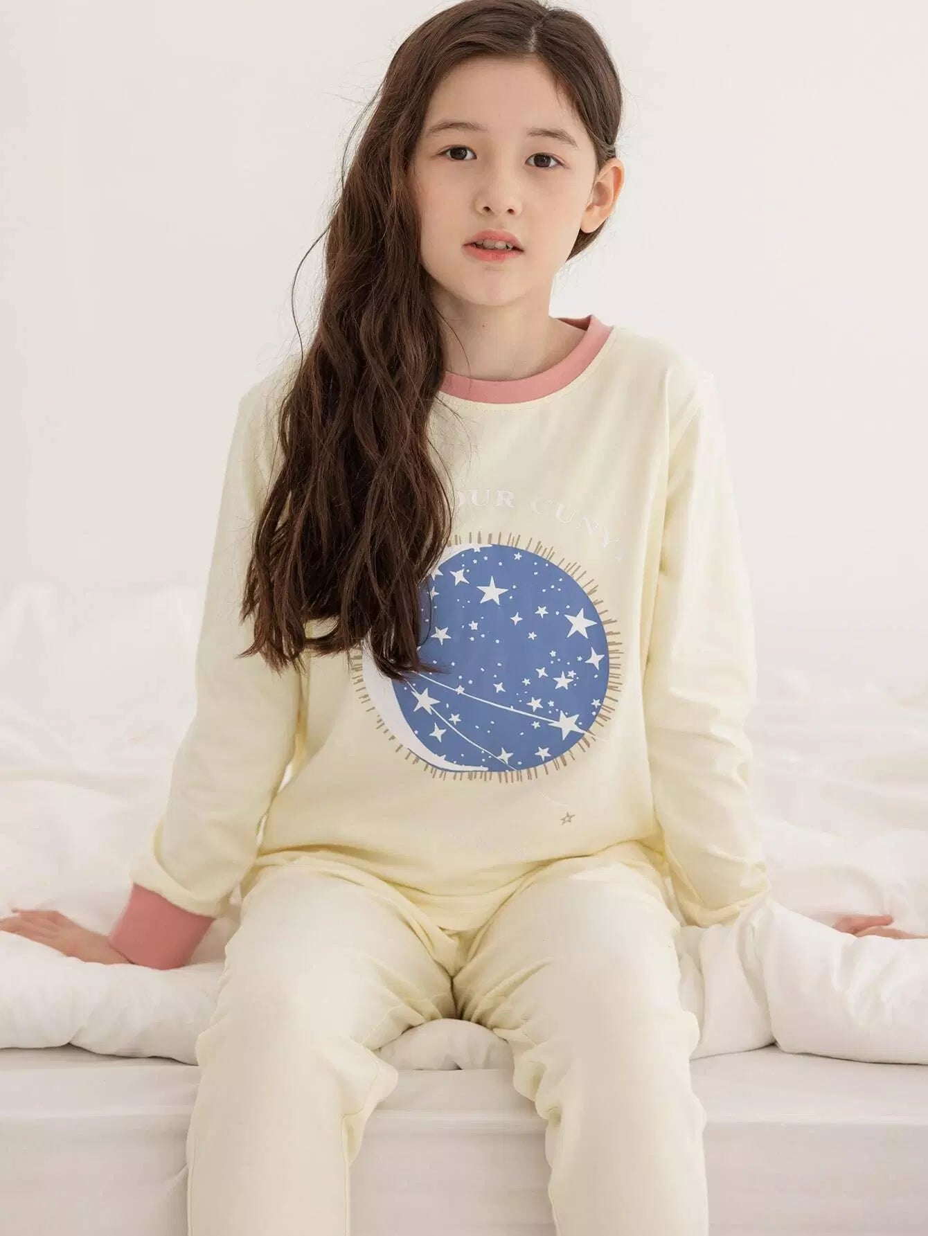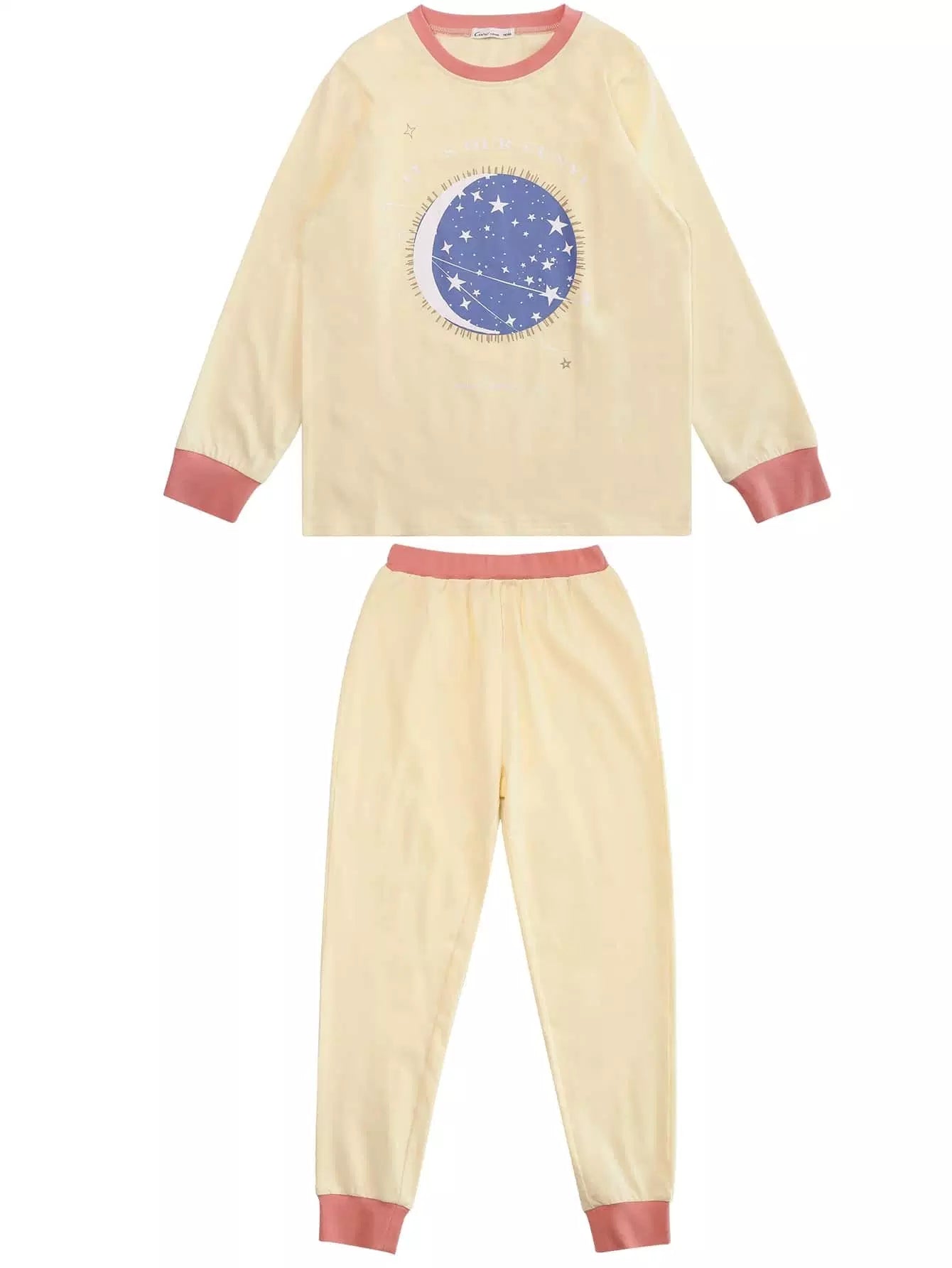 طقم بيجامة بنطلون وبلوزة وبنطال نوم بحواف بنقوش ورسومات على شكل نجمة وحروف للبنات