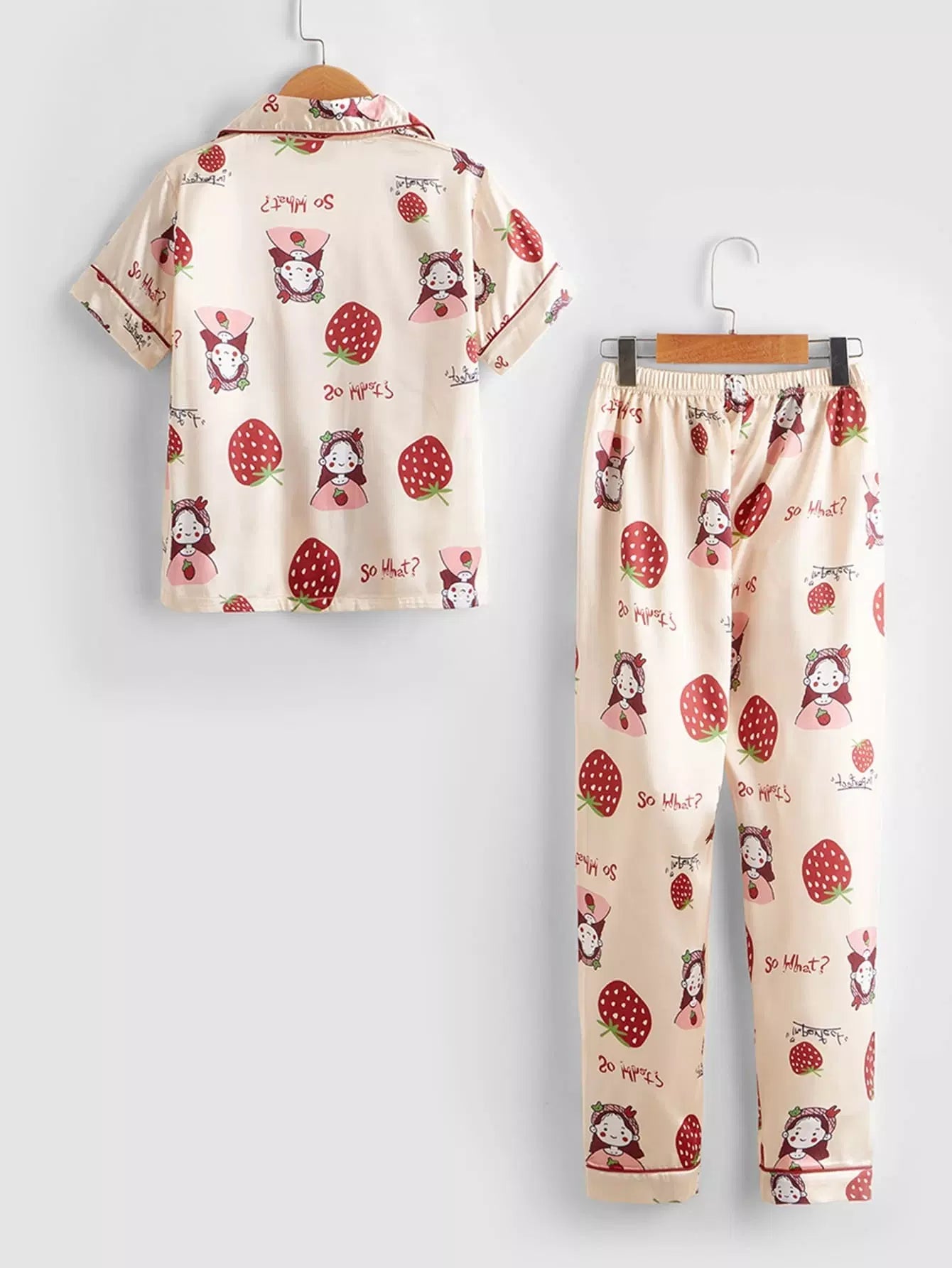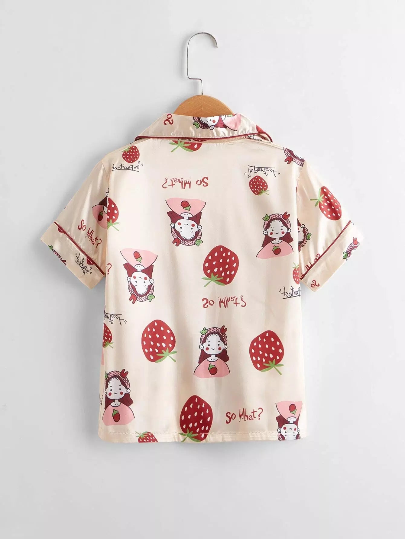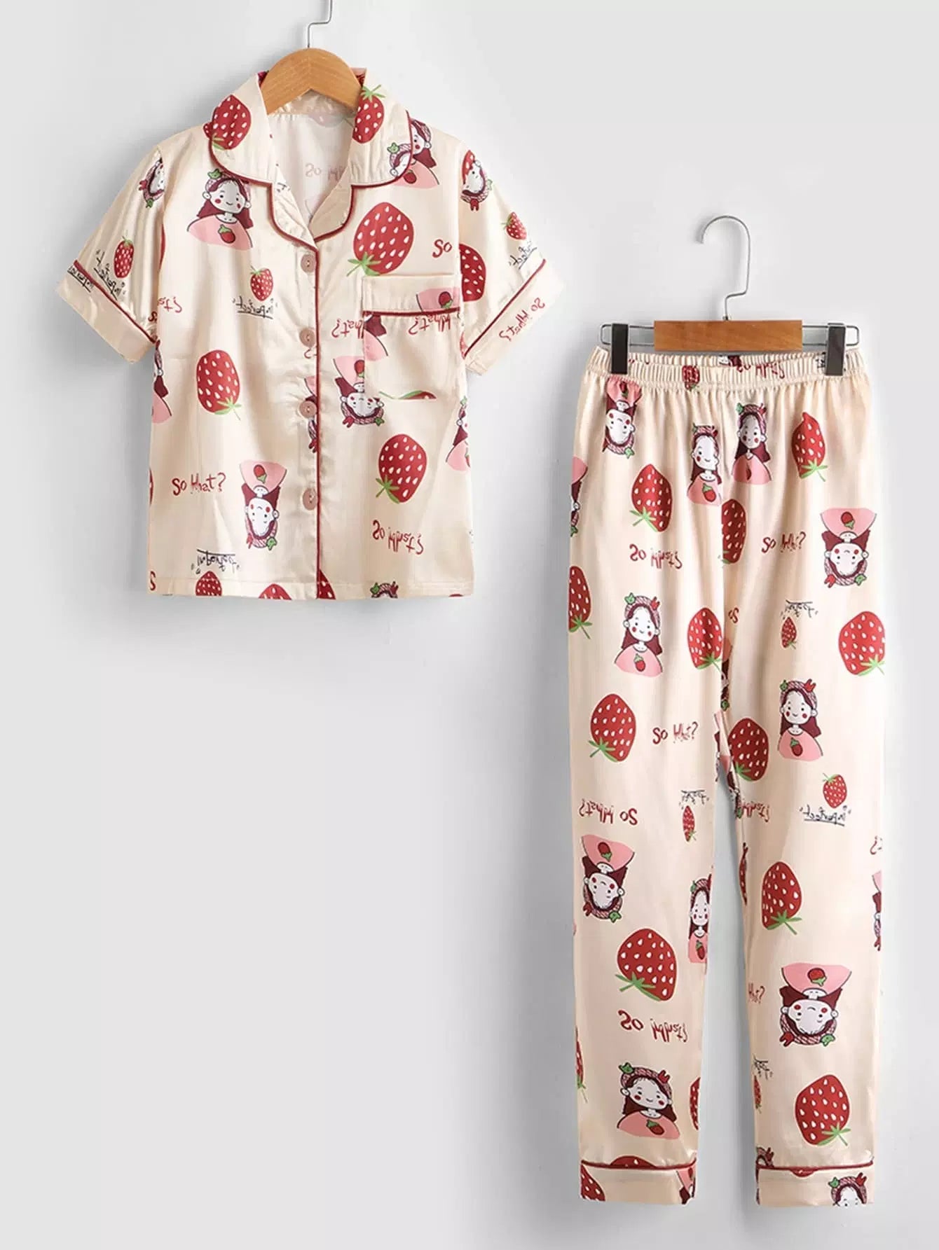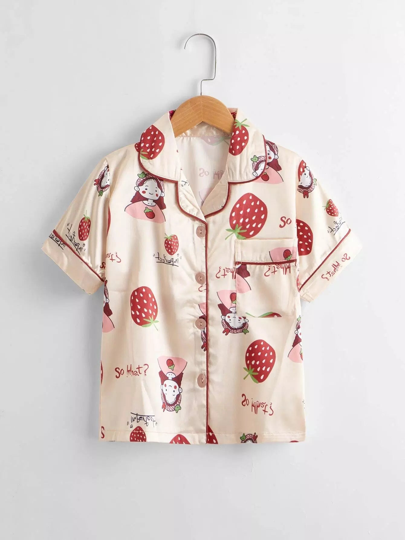 طقم بيجامة ساتان مطبوع عليه فراولة للبنات وطفلة كرتونية