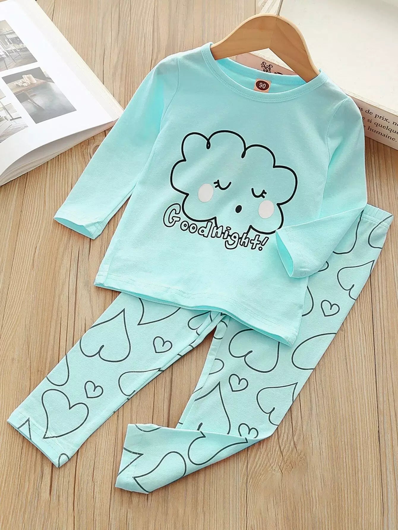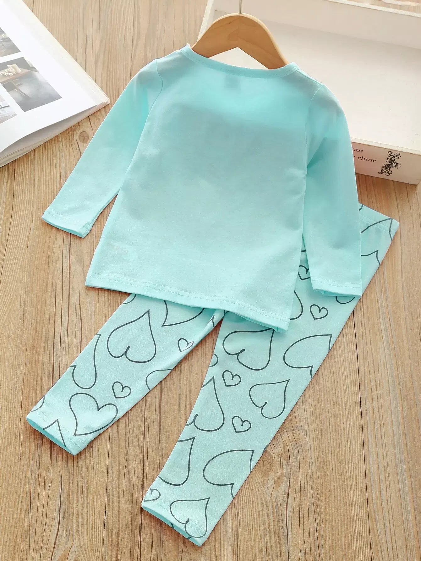 طقم بيجامات بناتي صغيرات مطبوع عليه كارتون وقلب