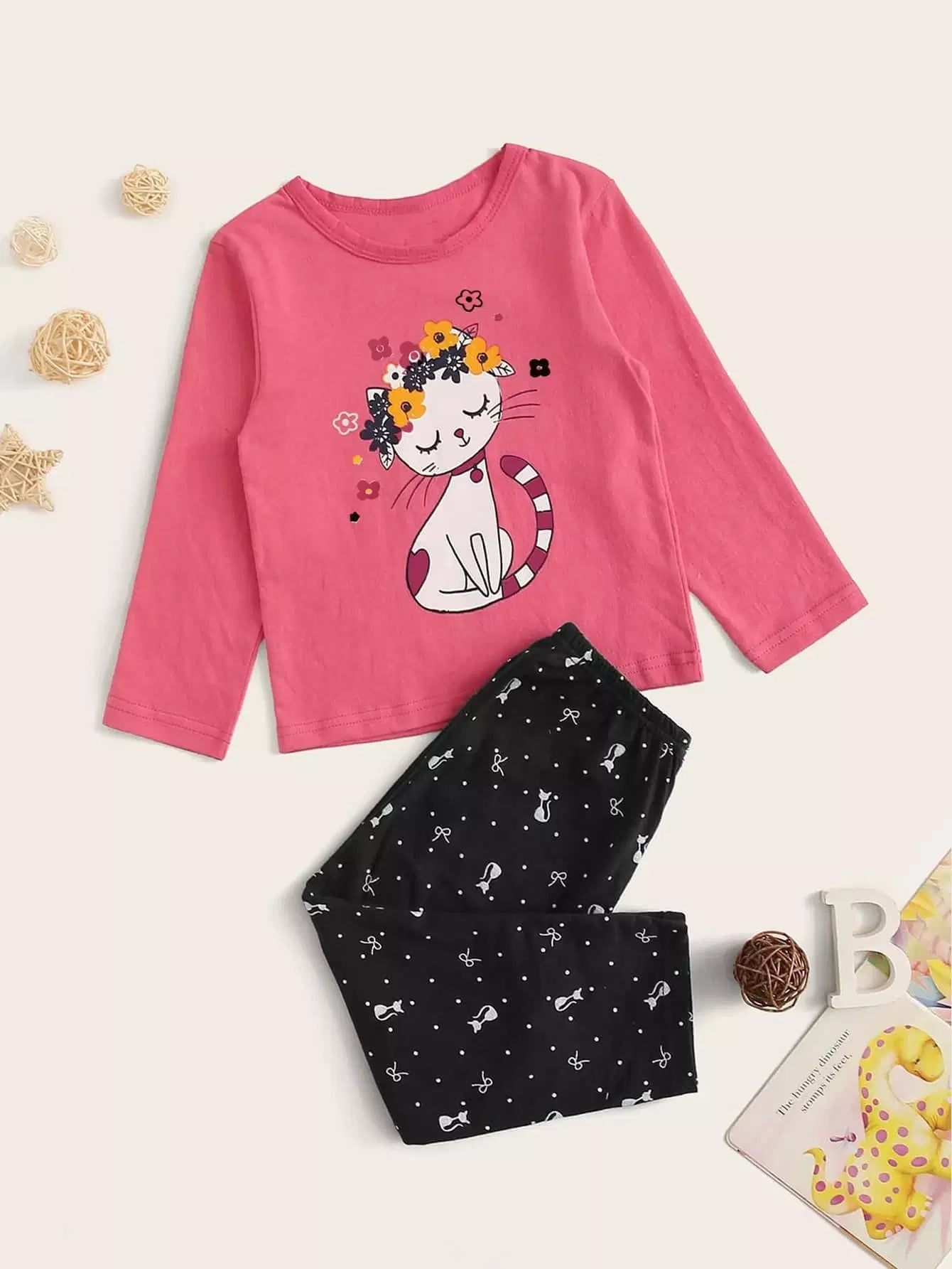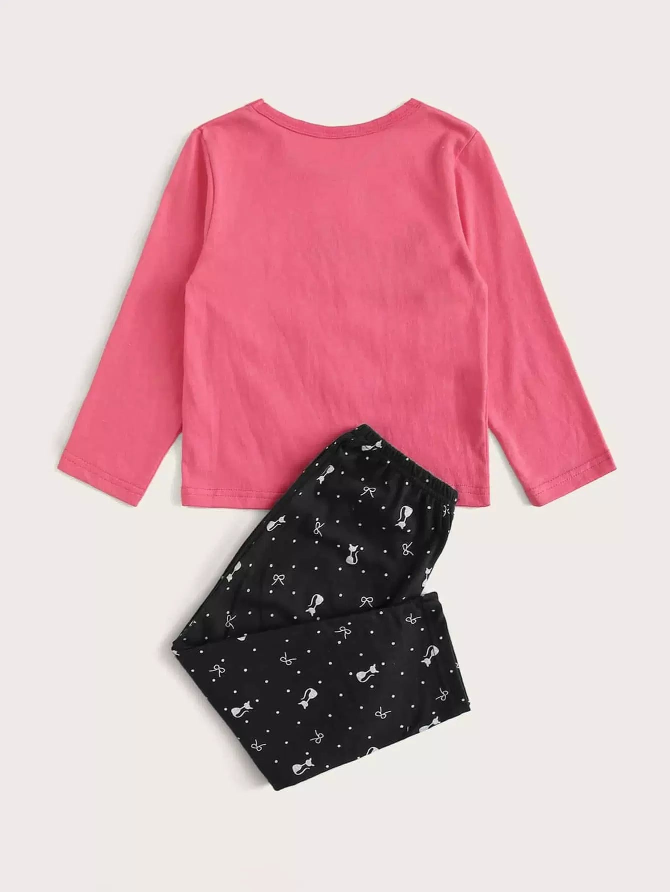 الأطفال - مجموعة بيجامة بطباعة قطة كرتونية للفتيات الصغيرات