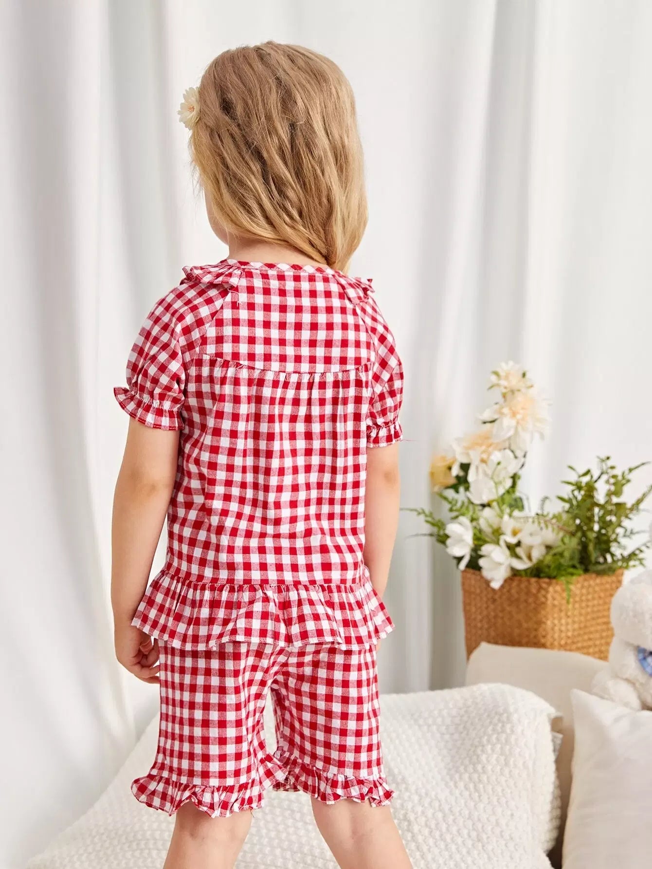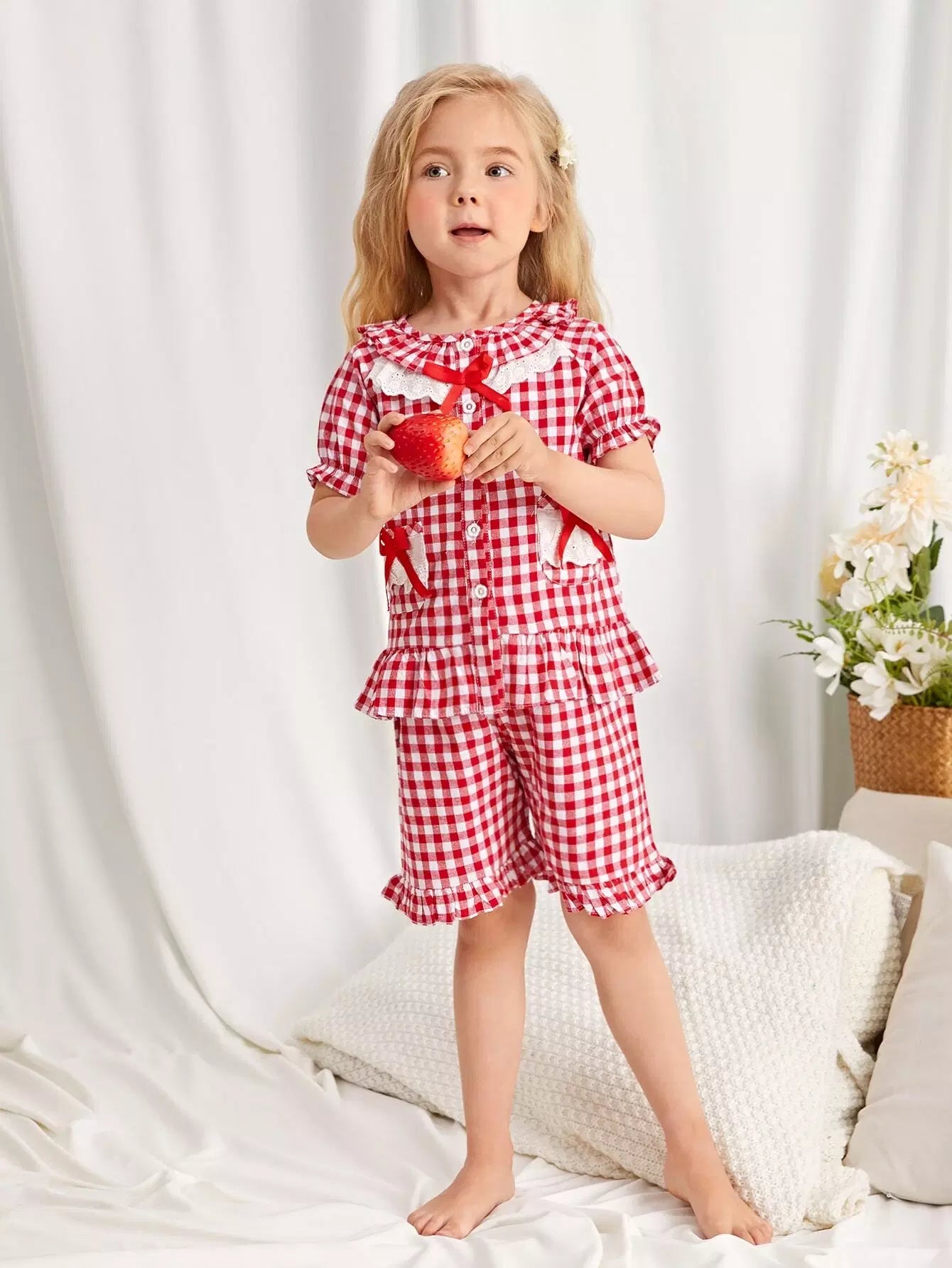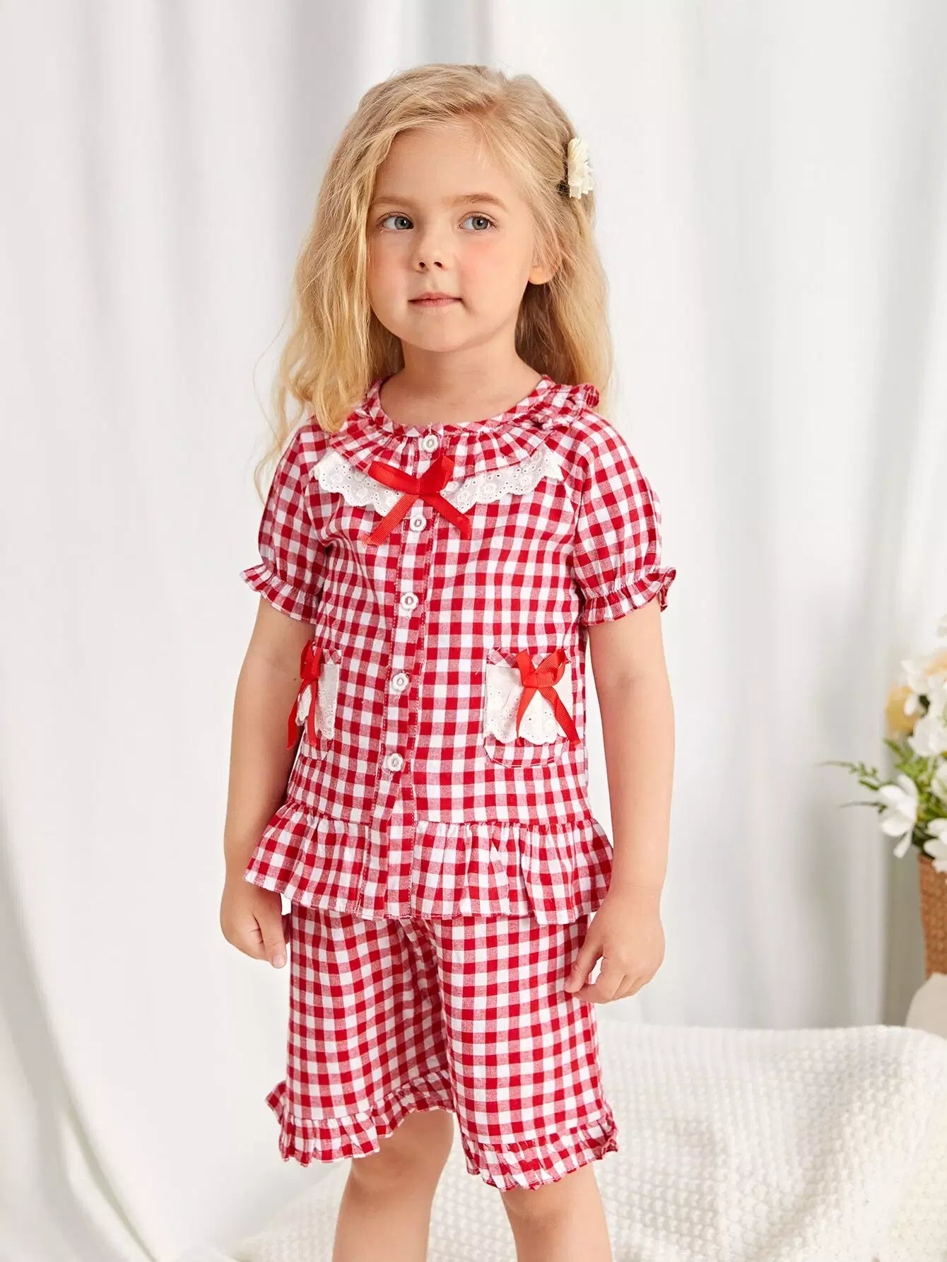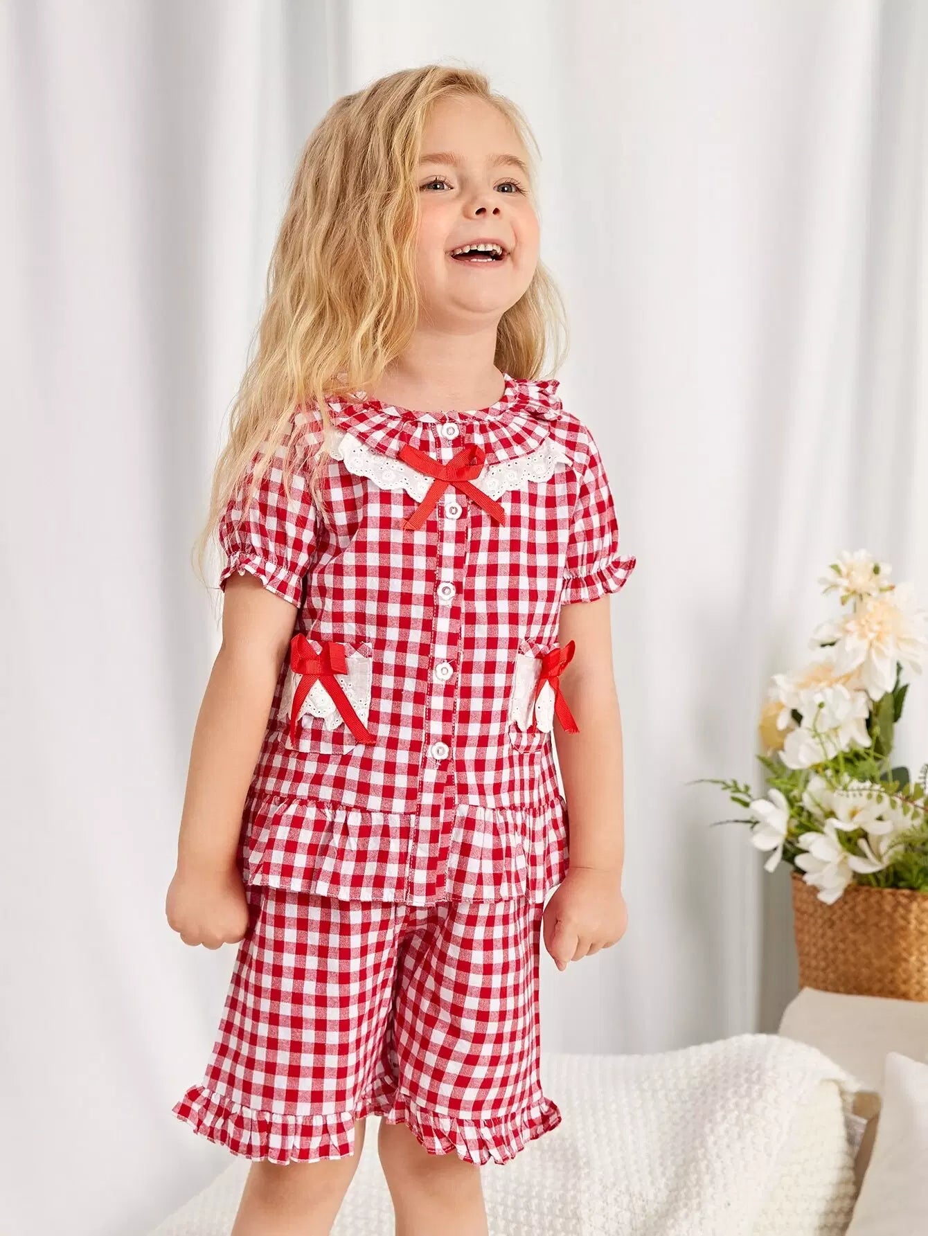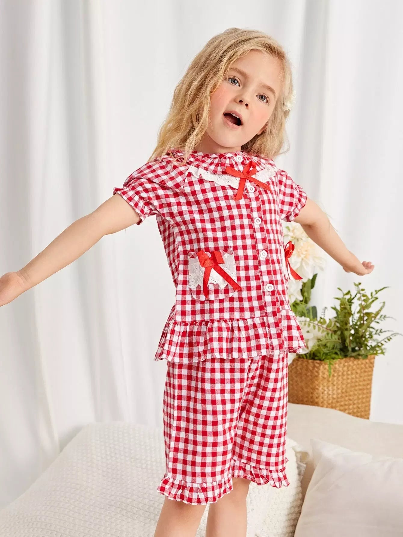 طقم بيجامة بنات صغيرات مزين بعقدة قطنية مزينة بالكشكش