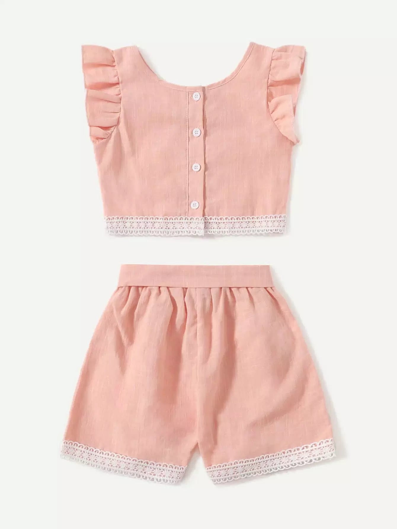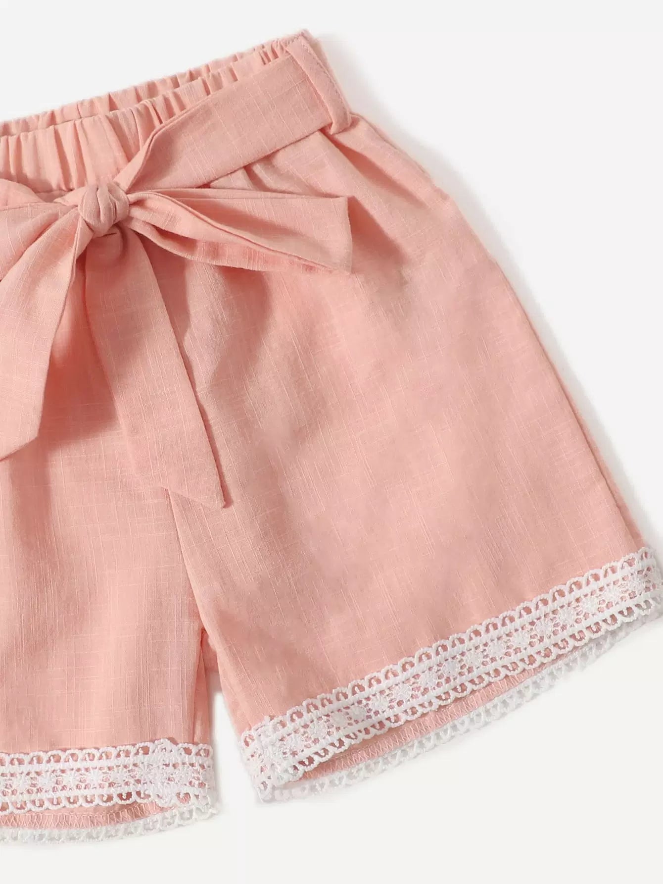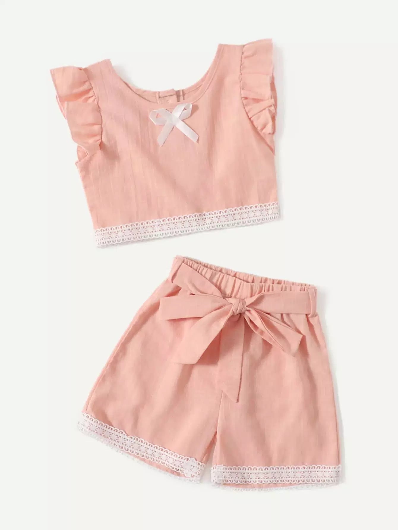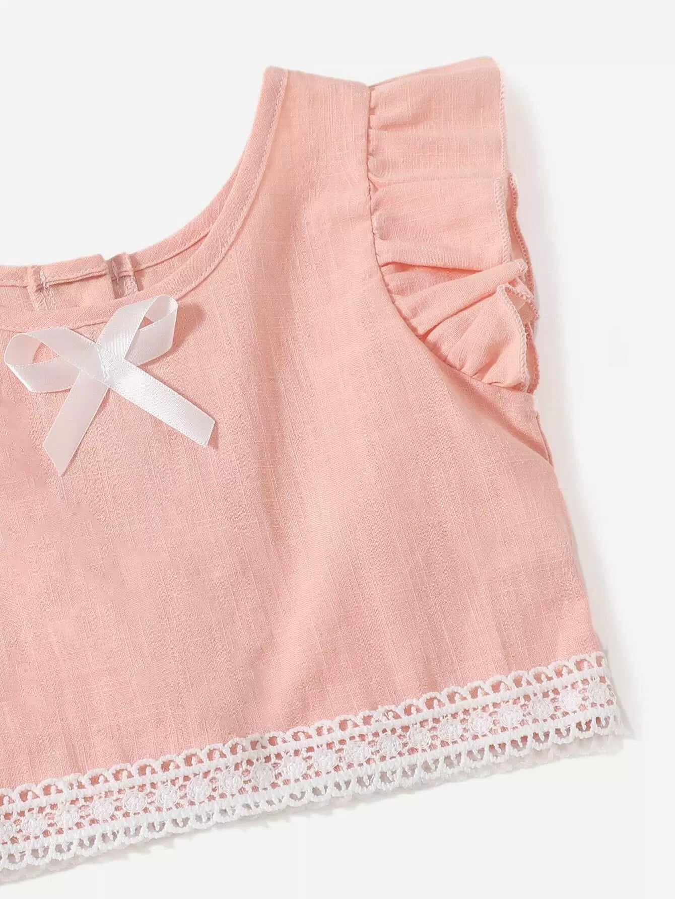 طقم بيجامة بناتي صغيرات مزين بالدانتيل من الأمام بعقدة