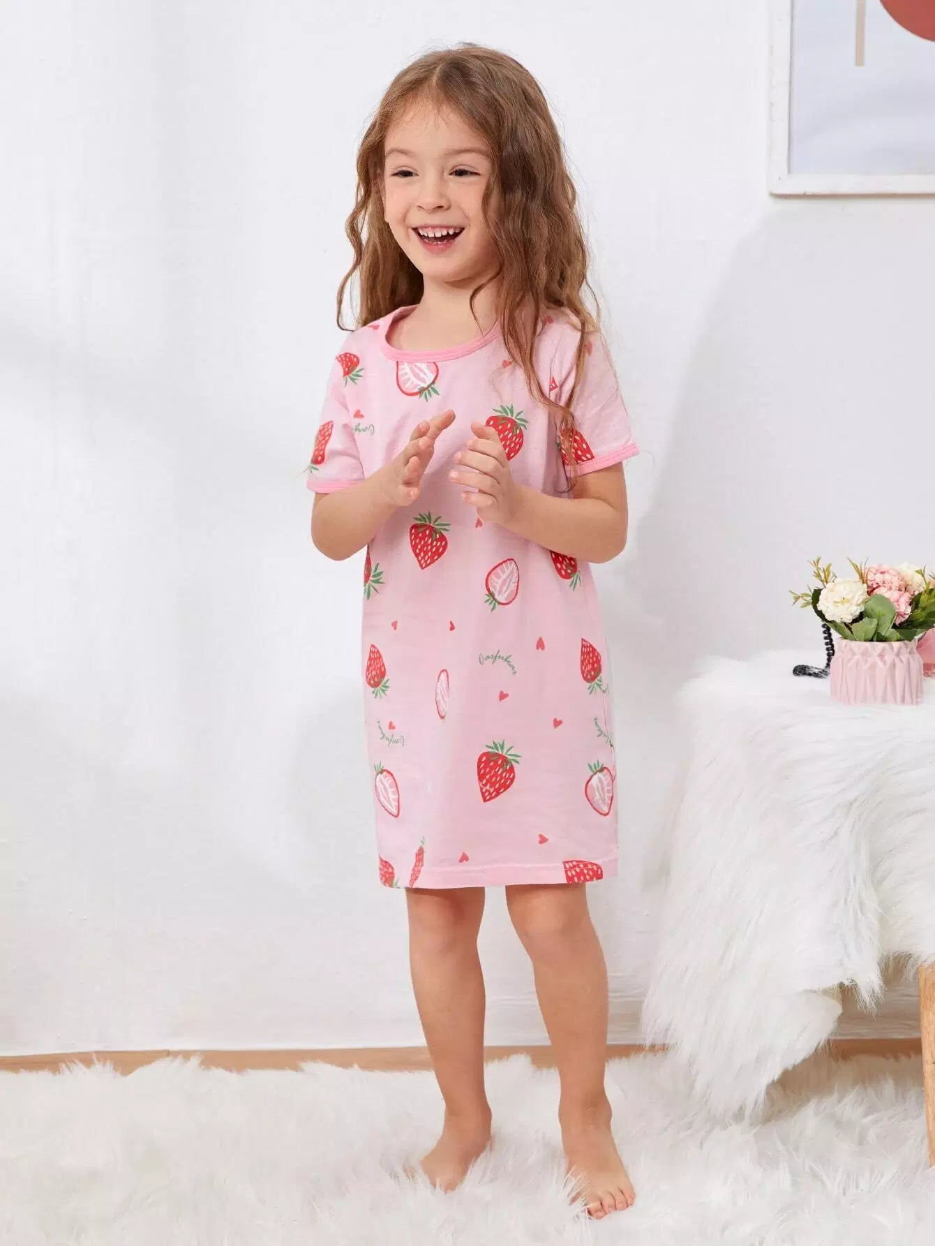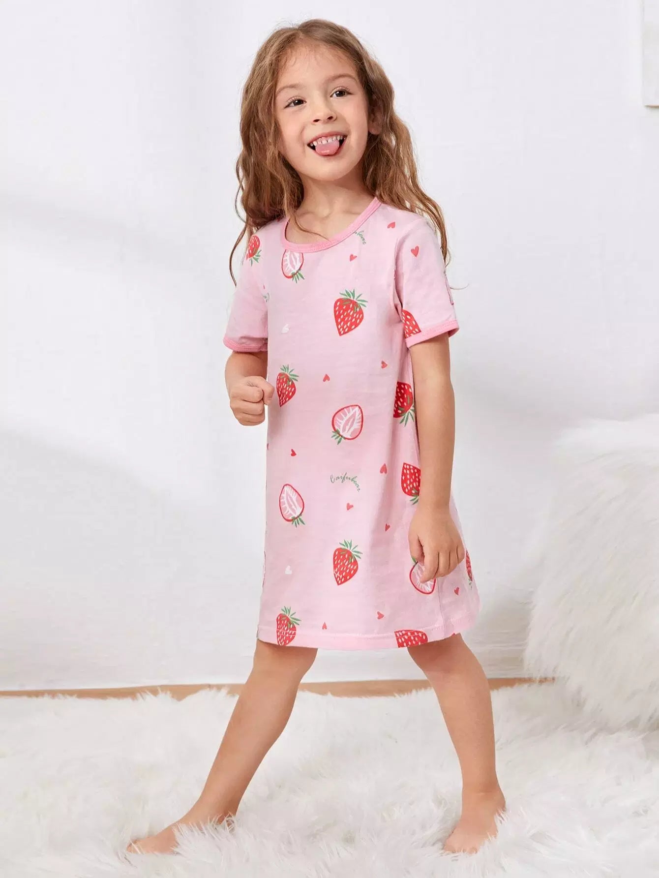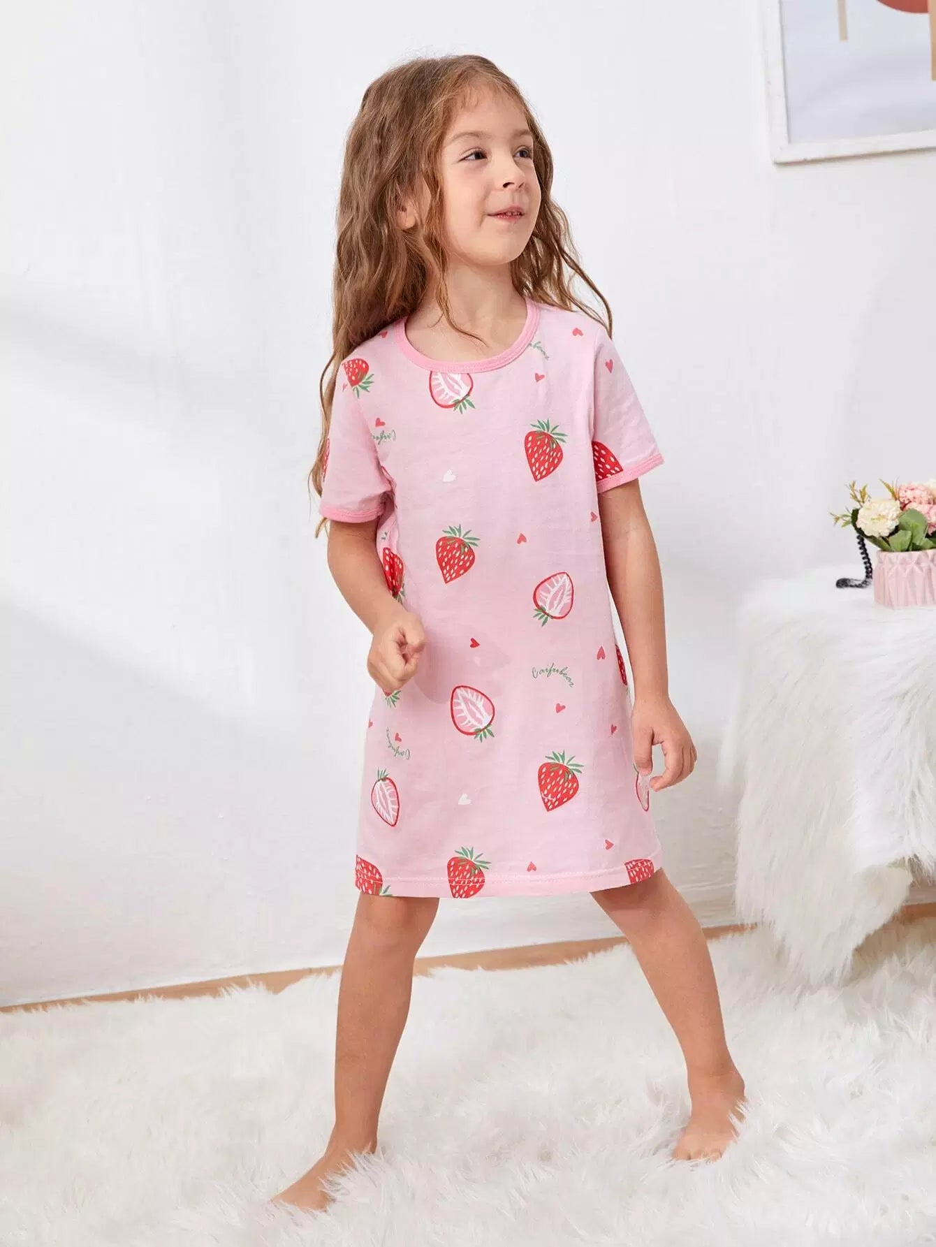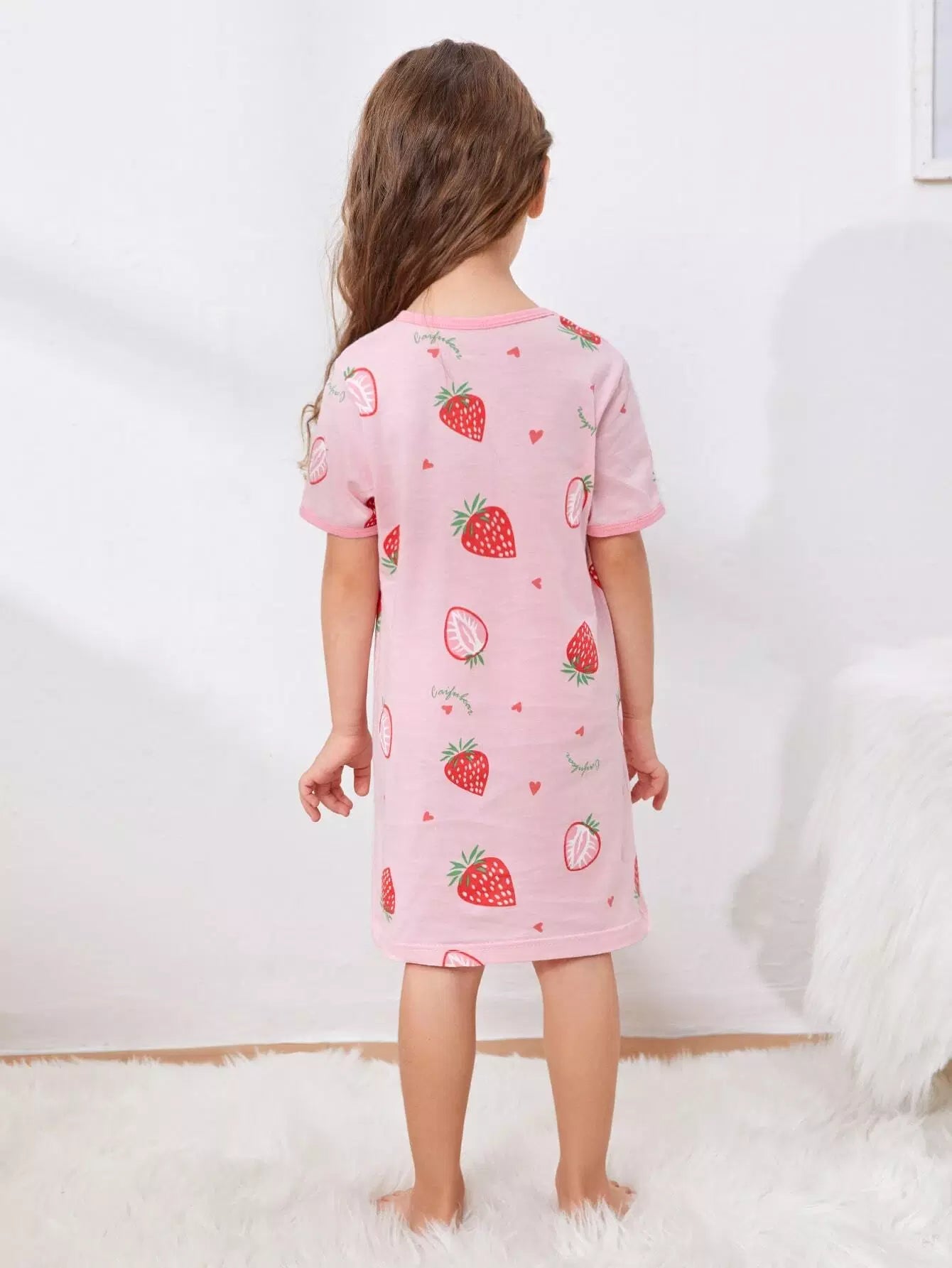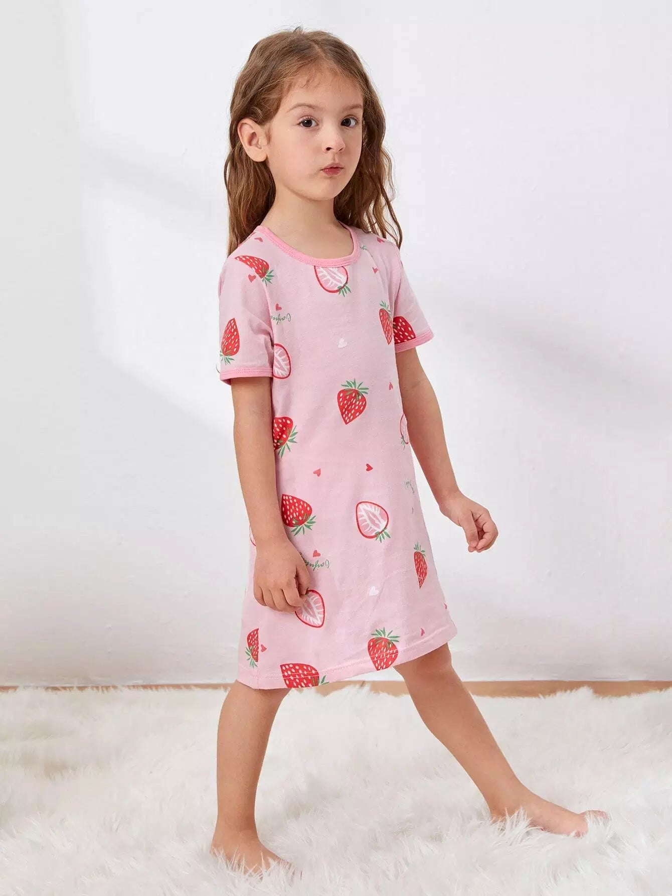 الأطفال - فستان ليلي برسومات الفراولة والحروف للفتيات الصغيرات