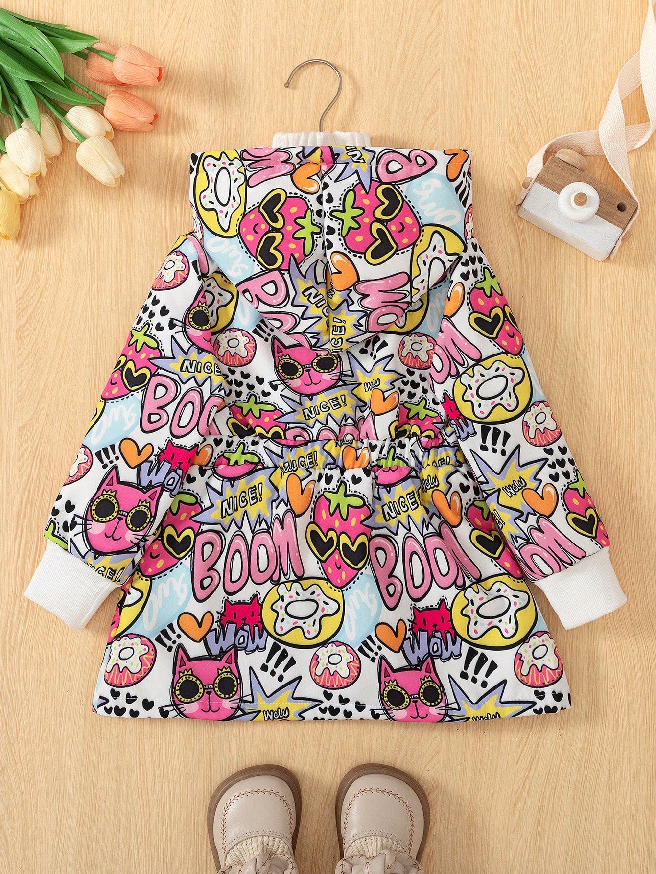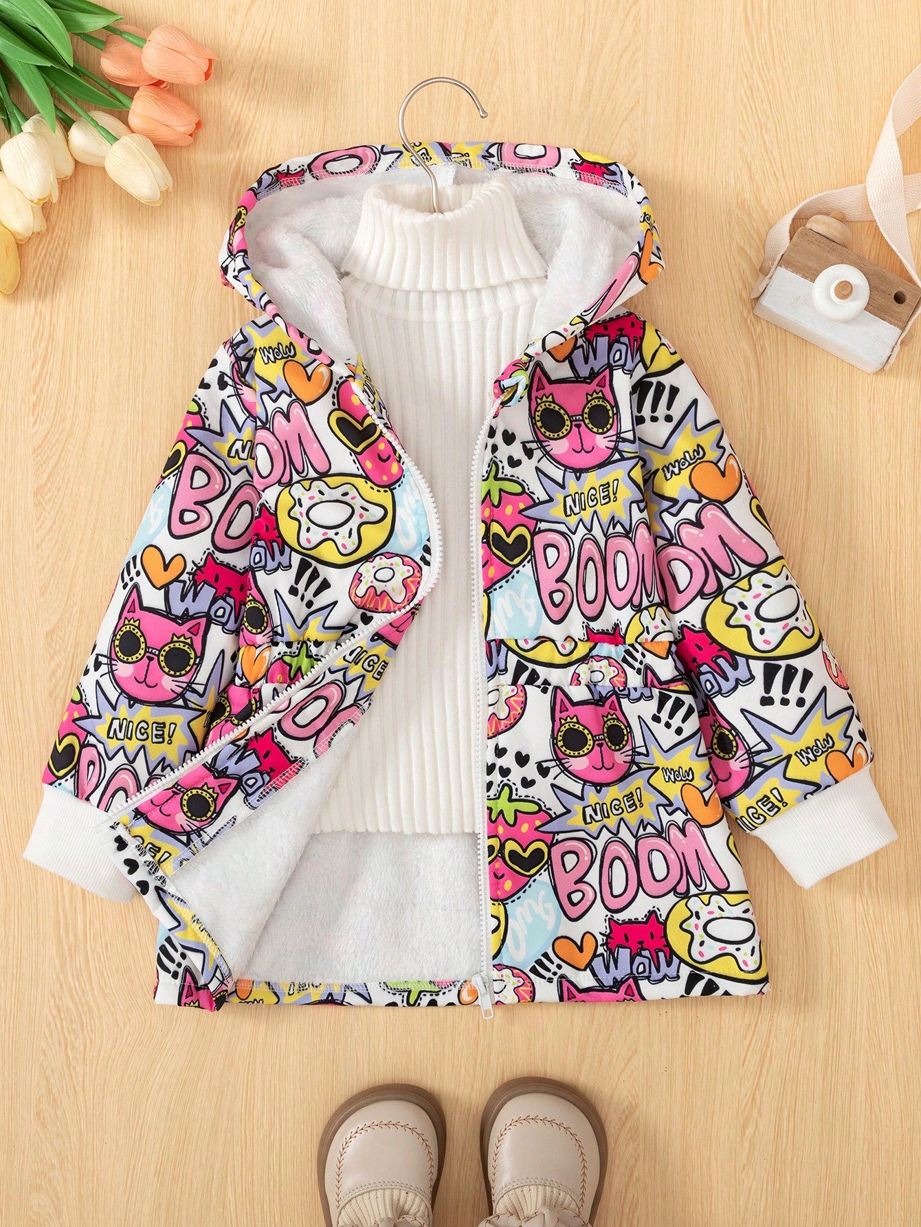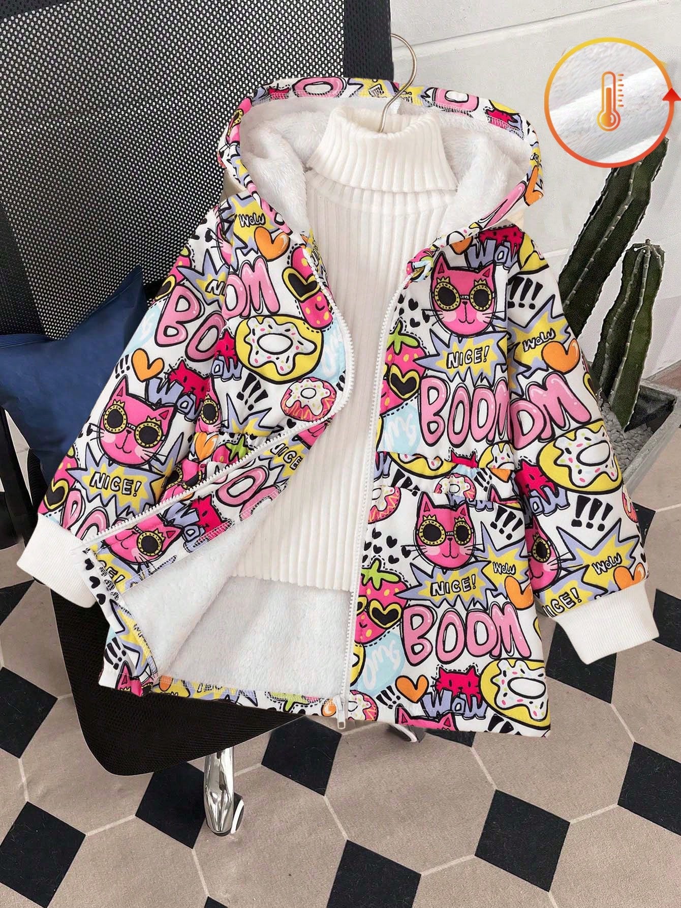 معطف شتوي متوسط الطول سميك مبطن حرارياً برسومات كرتونية دافئة للفتيات الصغيرات
