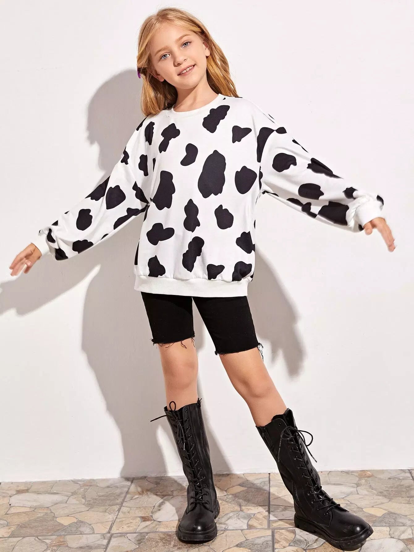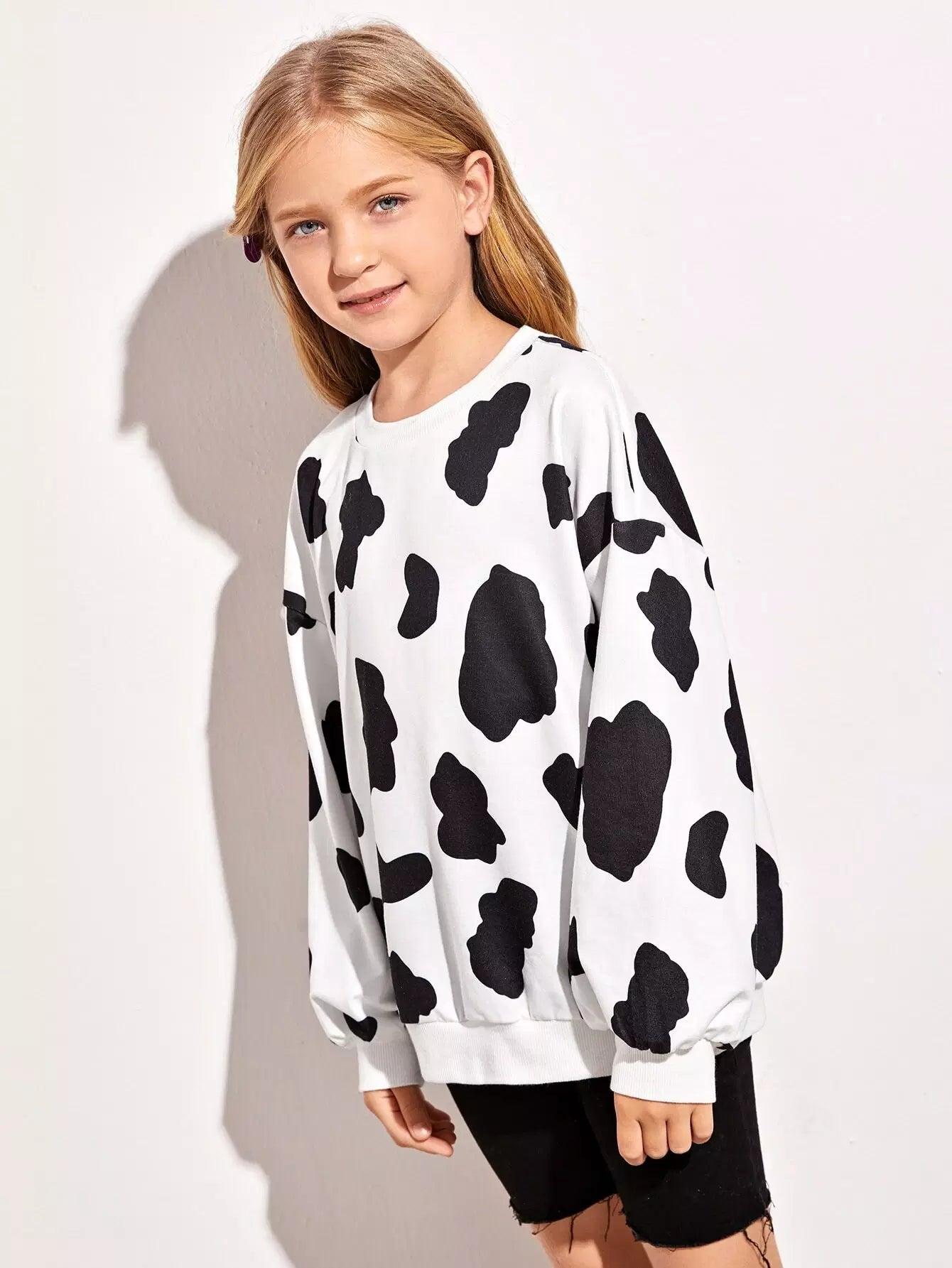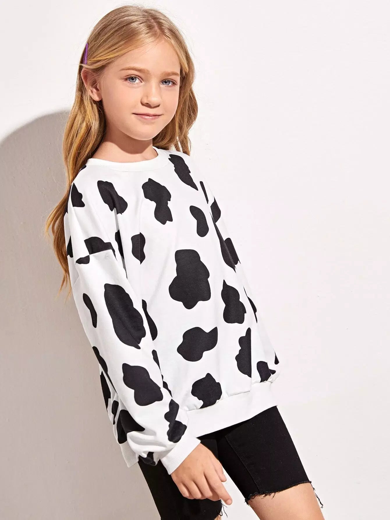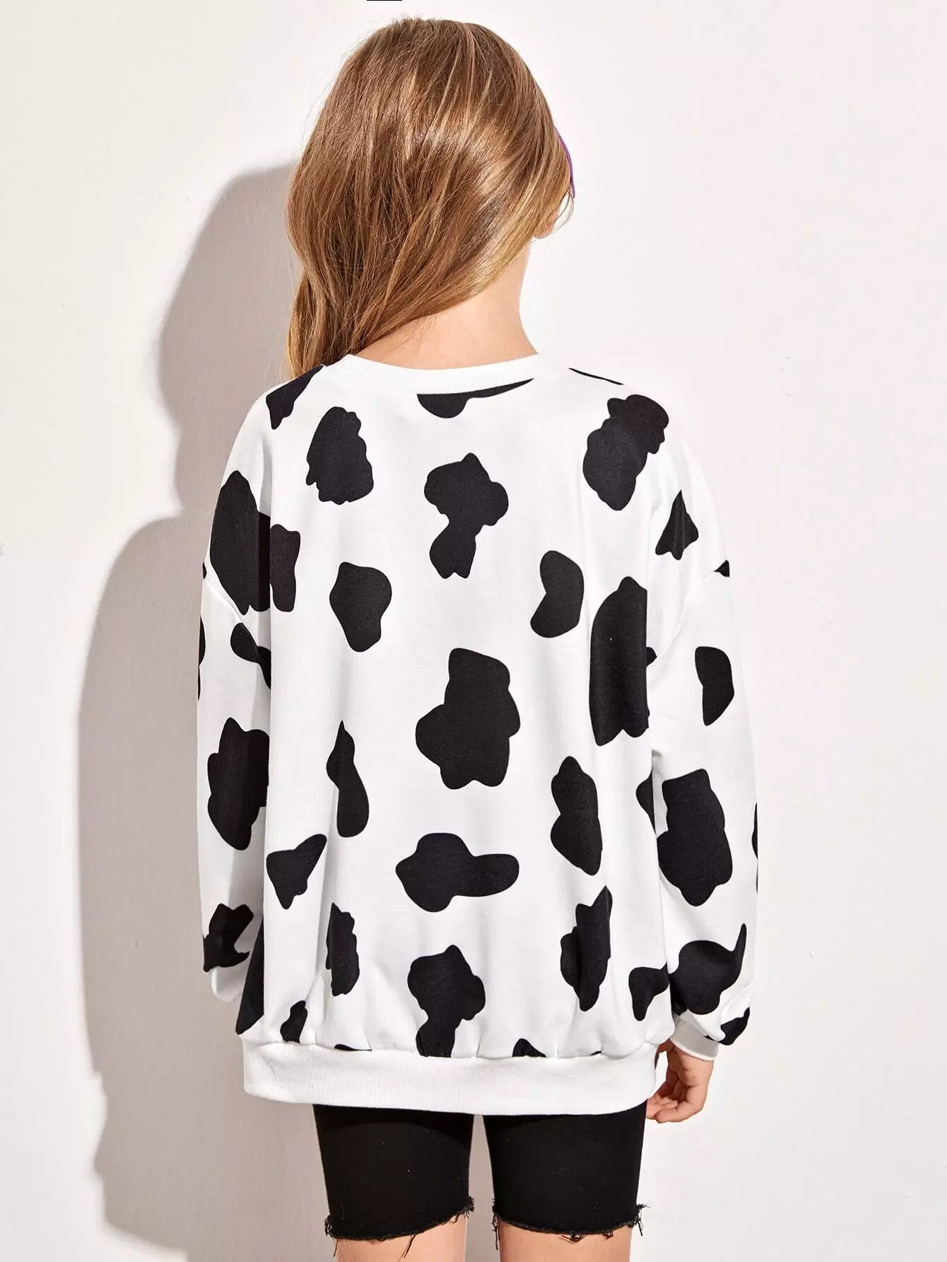 بلوفر بناتي بطبعة بقرة وأكتاف منسدلة