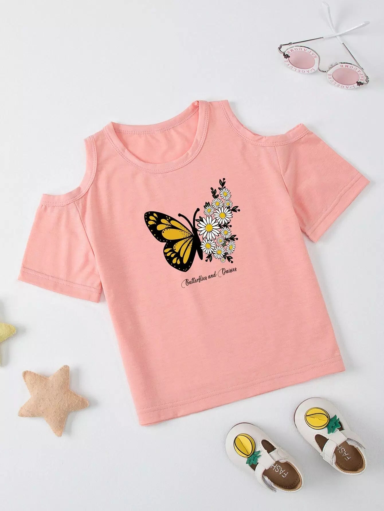 تي شيرت بأكتاف باردة على شكل زهور وفراشات للبنات