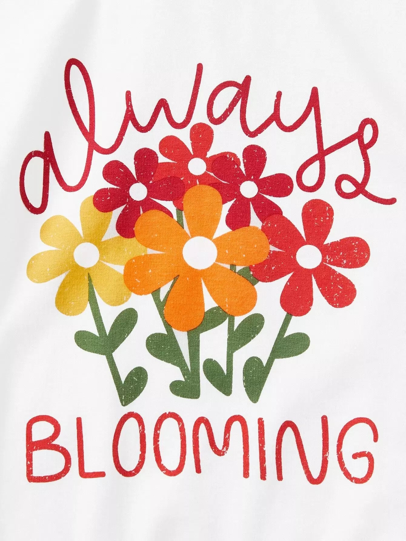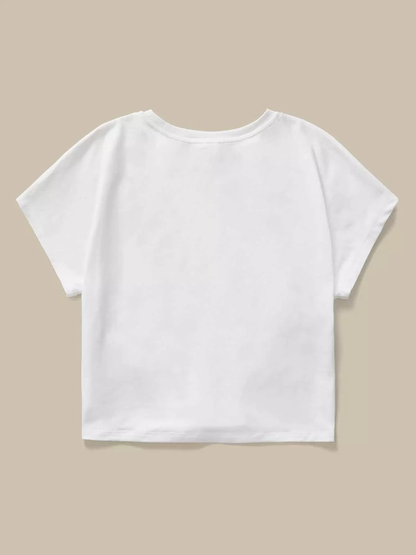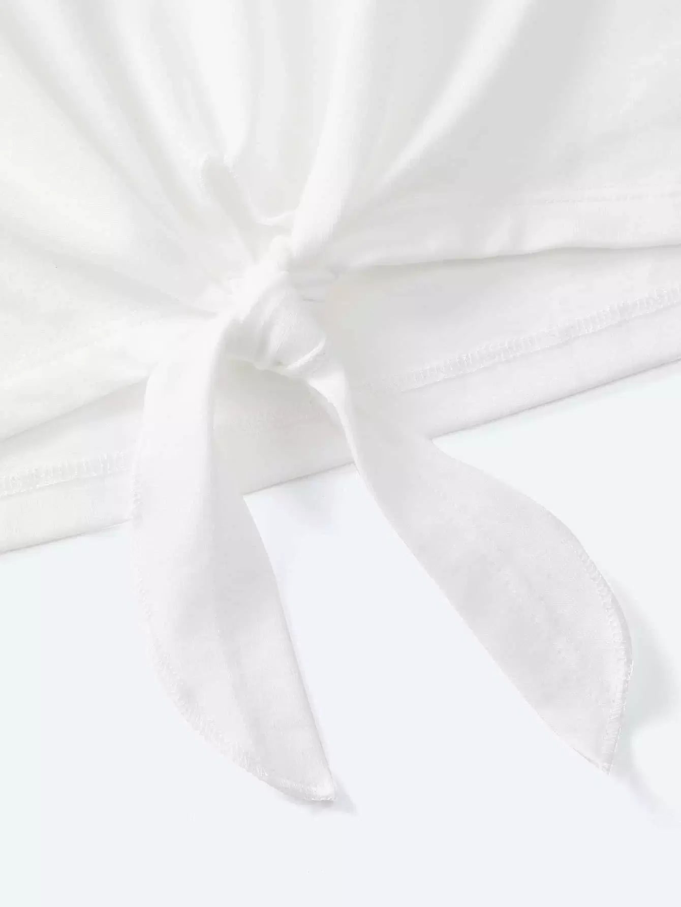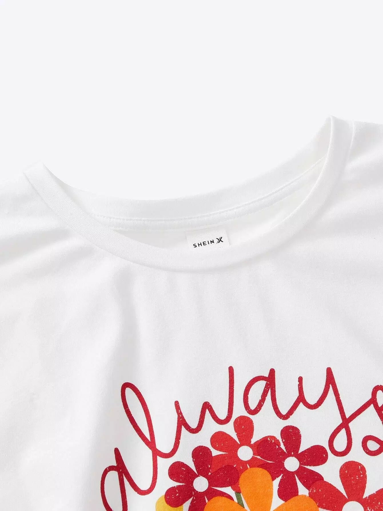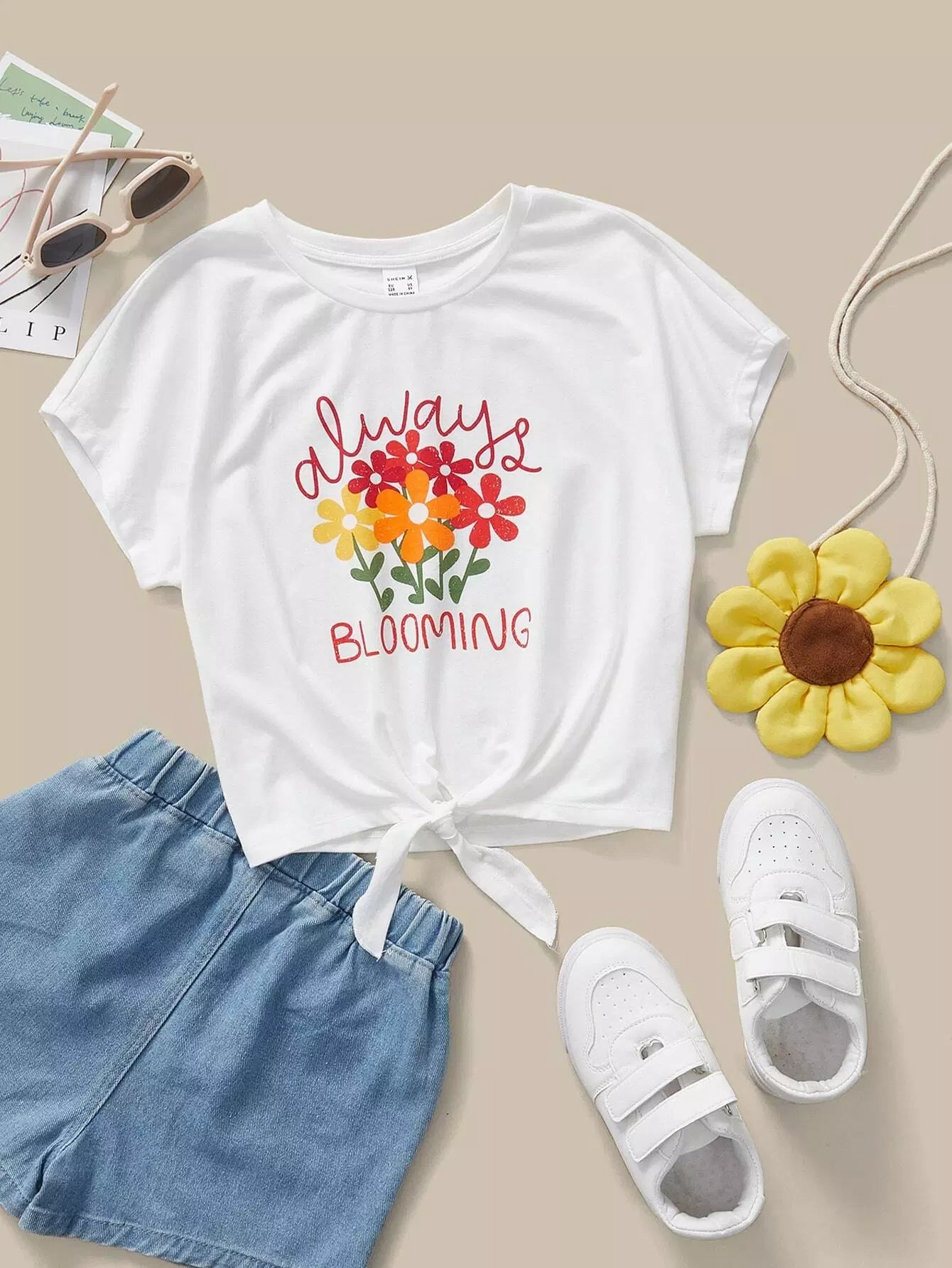 تي شيرت بناتي بأكمام خفاش وحاشية بعقدة ورسومات أزهار وحروف