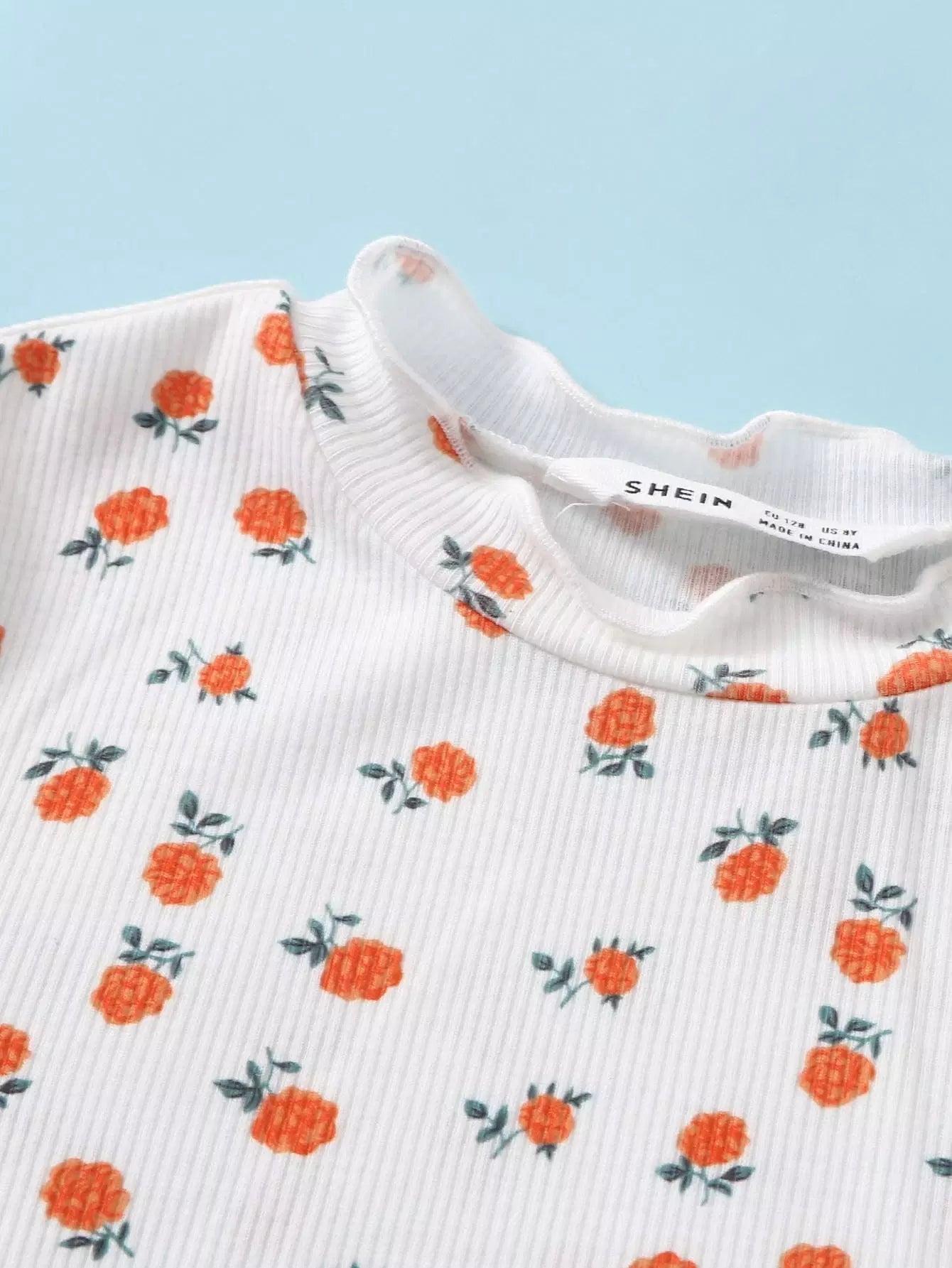 تي شيرت بناتي محبوك بخطوط مضلعة مزينة بأوراق الخس