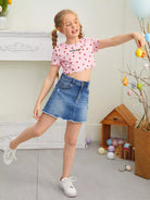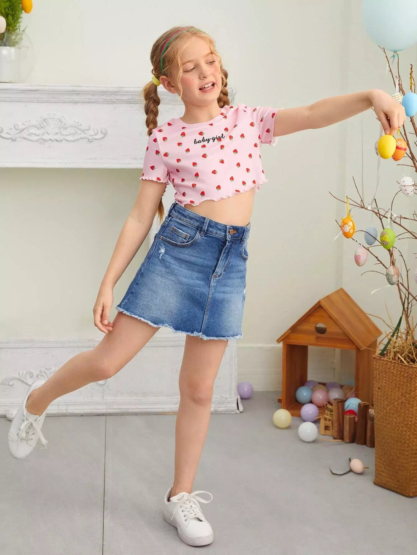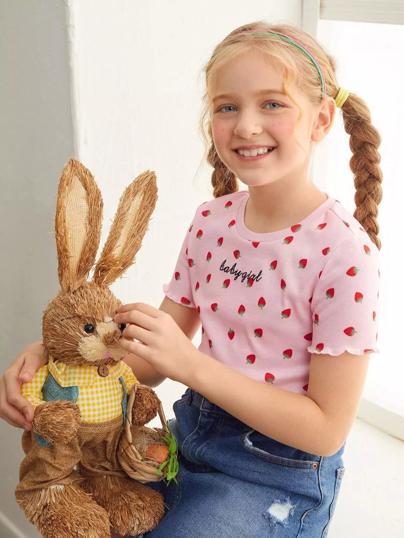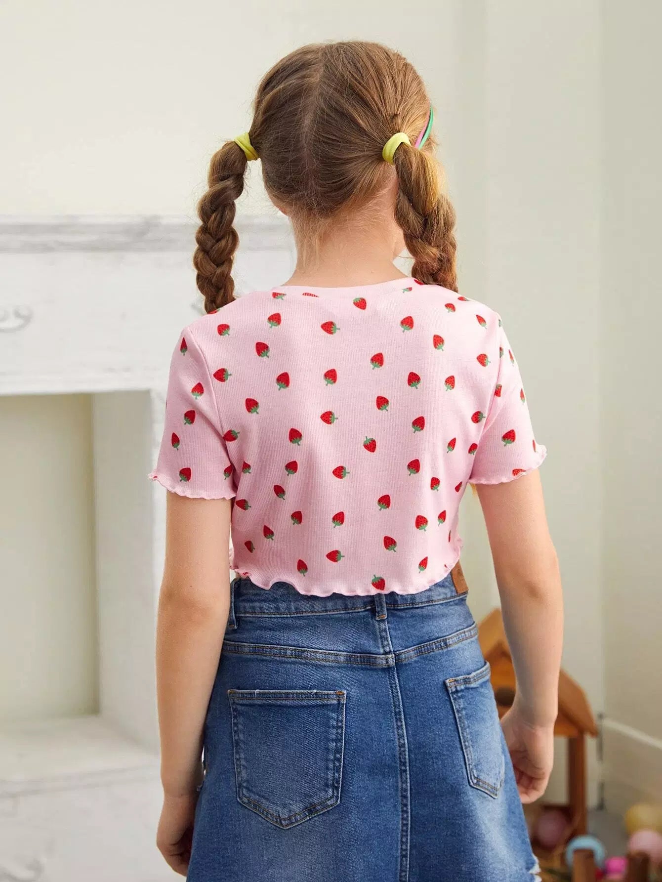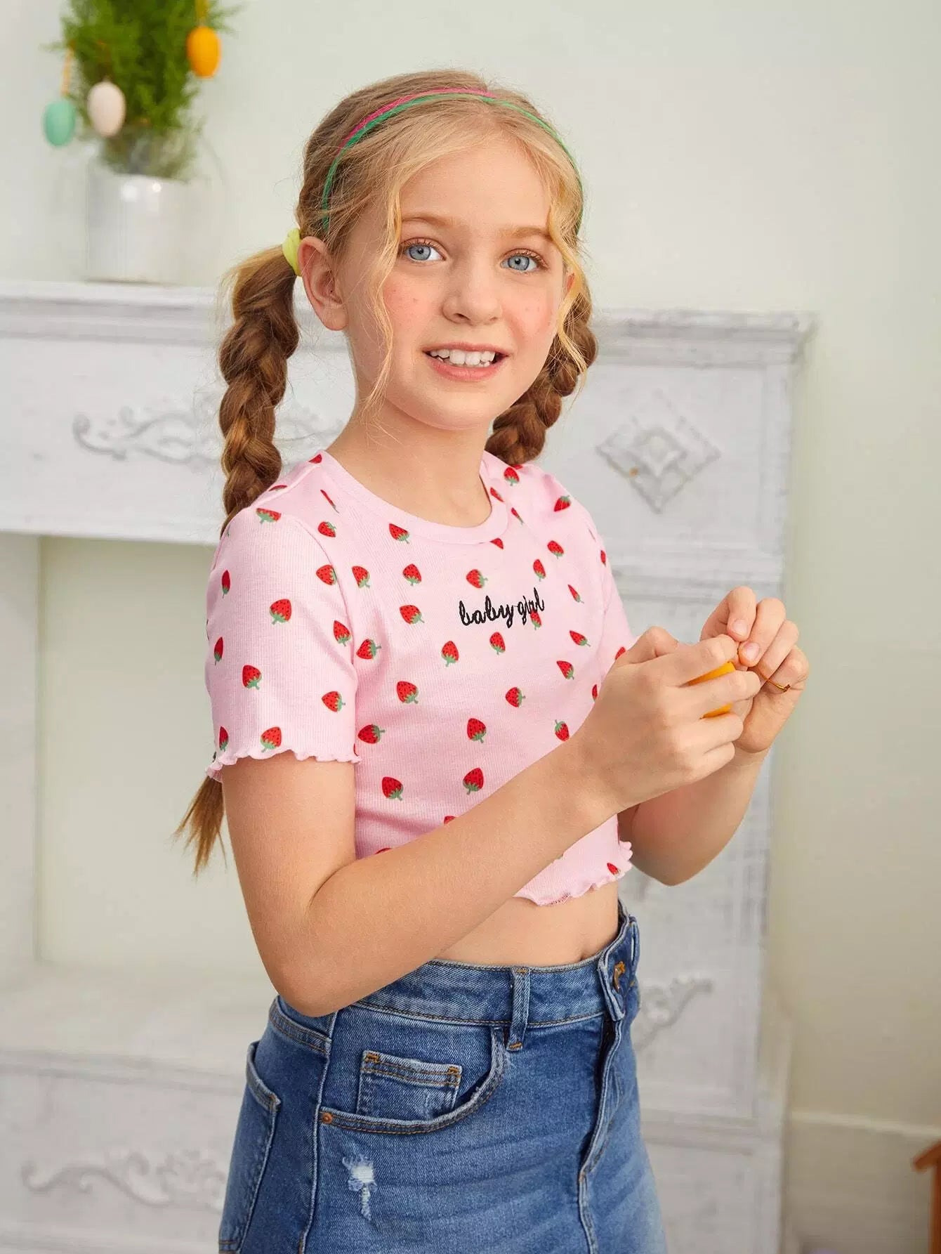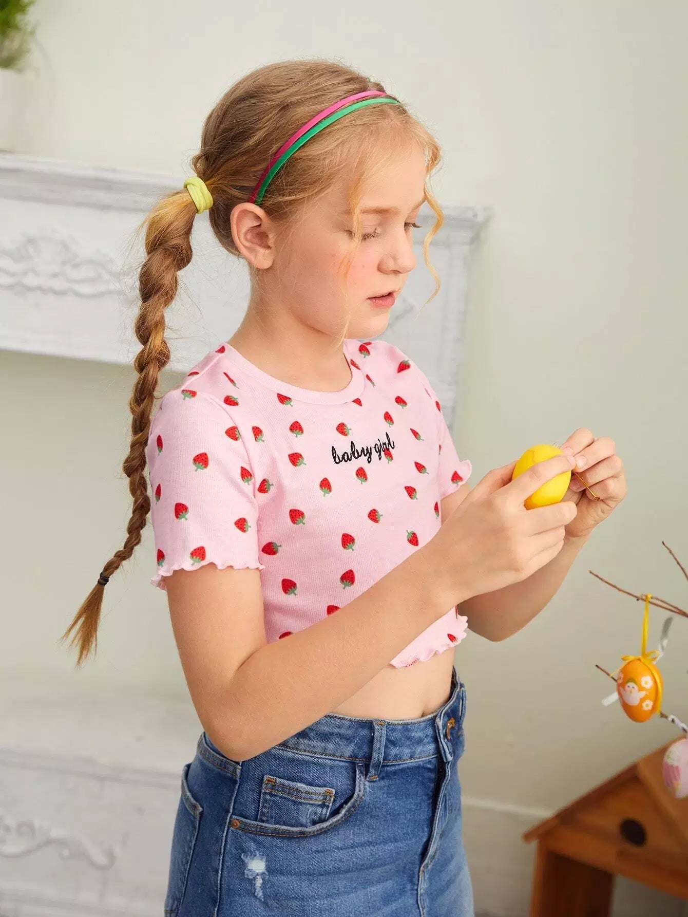 بلوزة بناتية بطبعة الفراولة وتطريز الحروف وحواف الخس