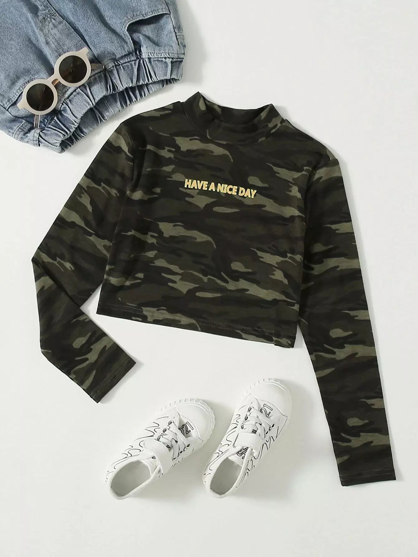 تي شيرت بناتي بطبعة شعار مموهة