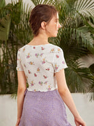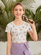 تي شيرت بطبعة زهور مع أزرار أمامية وحواف من الخس للفتيات المراهقات