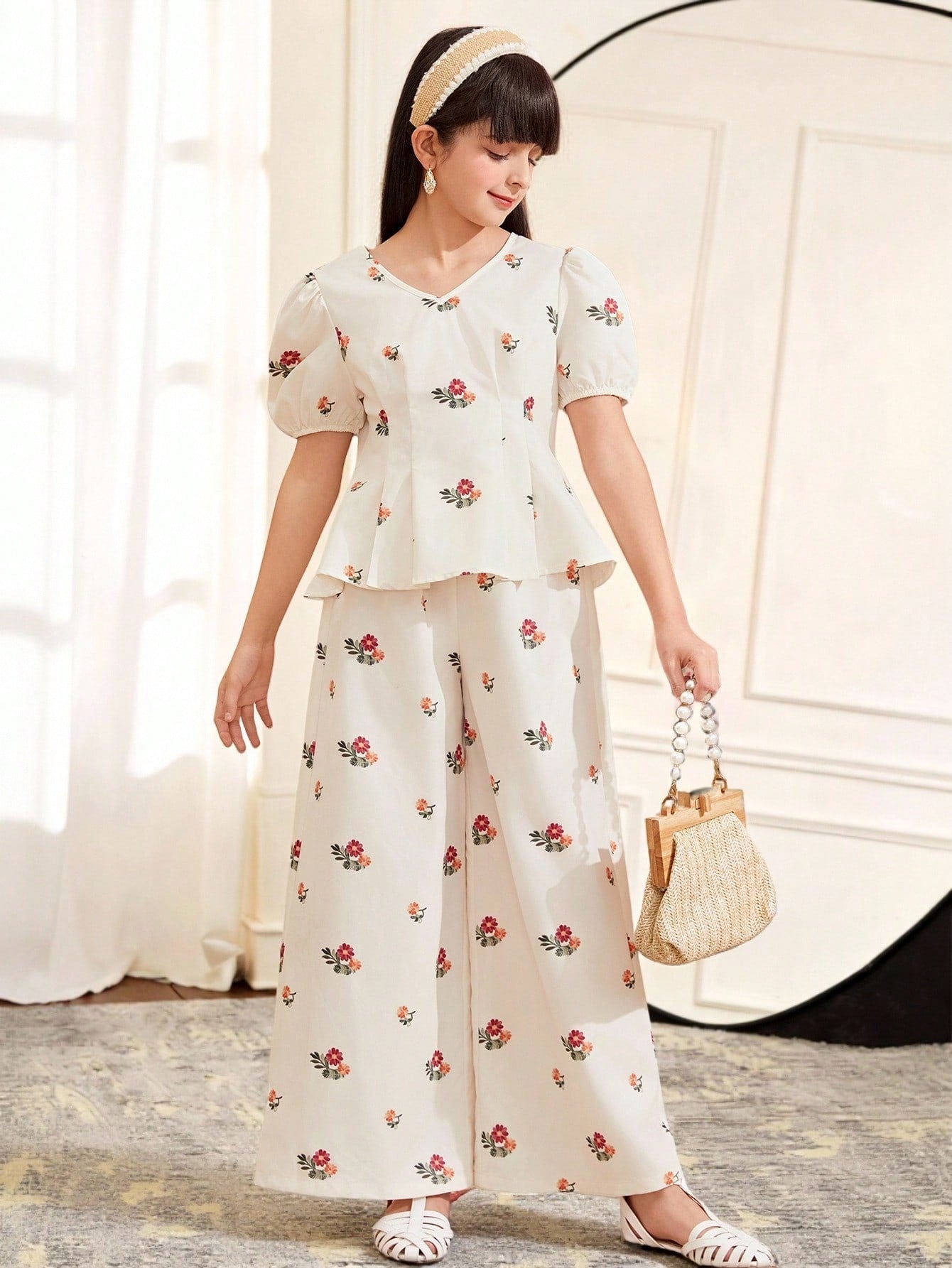 طقم توب داخلي أنيق مطبوع عليه زهور وبنطال بساق مستقيمة للفتيات المراهقات
