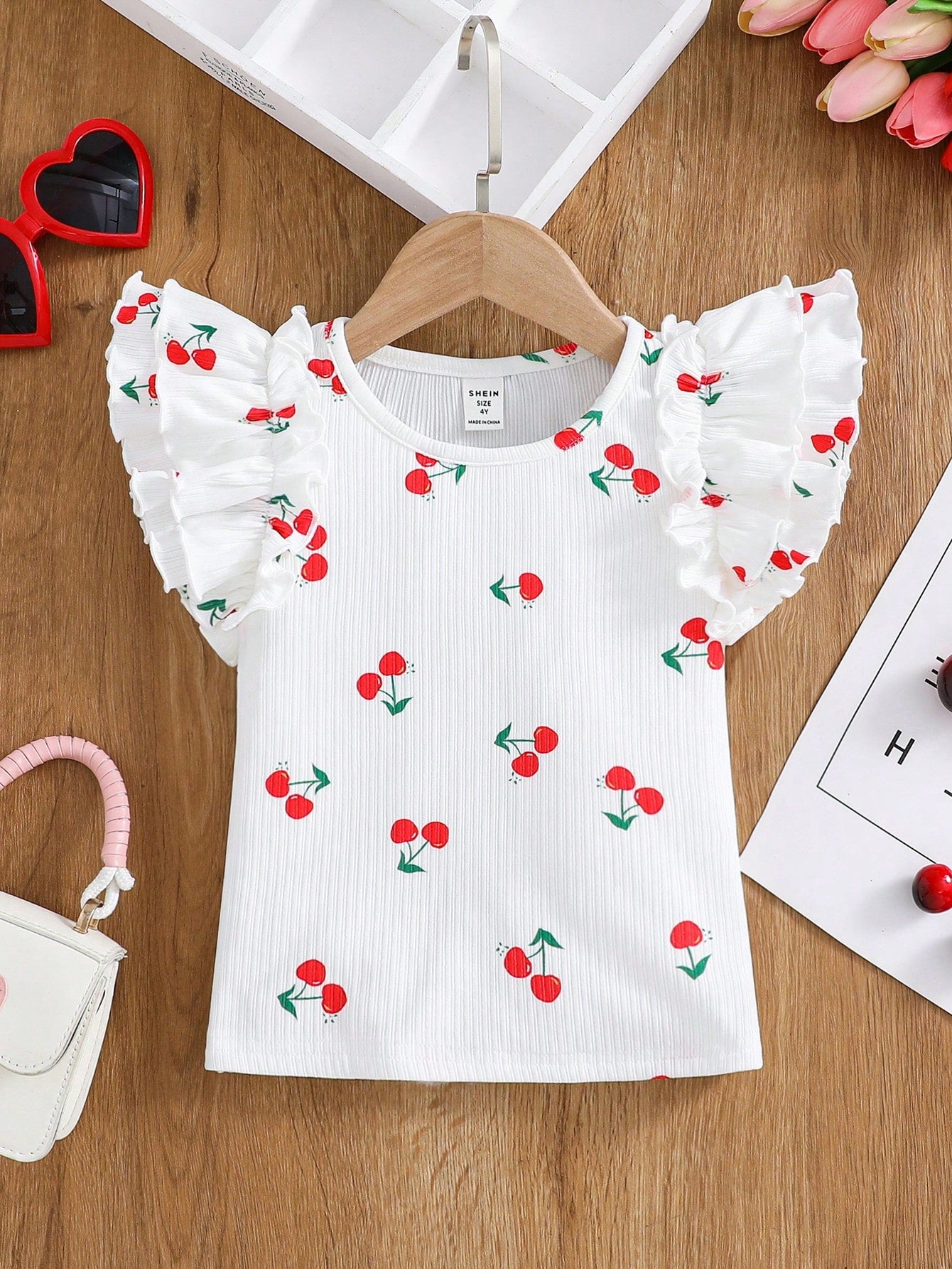 تي شيرت قصير الأكمام برقبة دائرية وحواف كشكشة ورسومات الكرز الأحمر للفتيات الصغيرات، مناسب لعيد الحب.